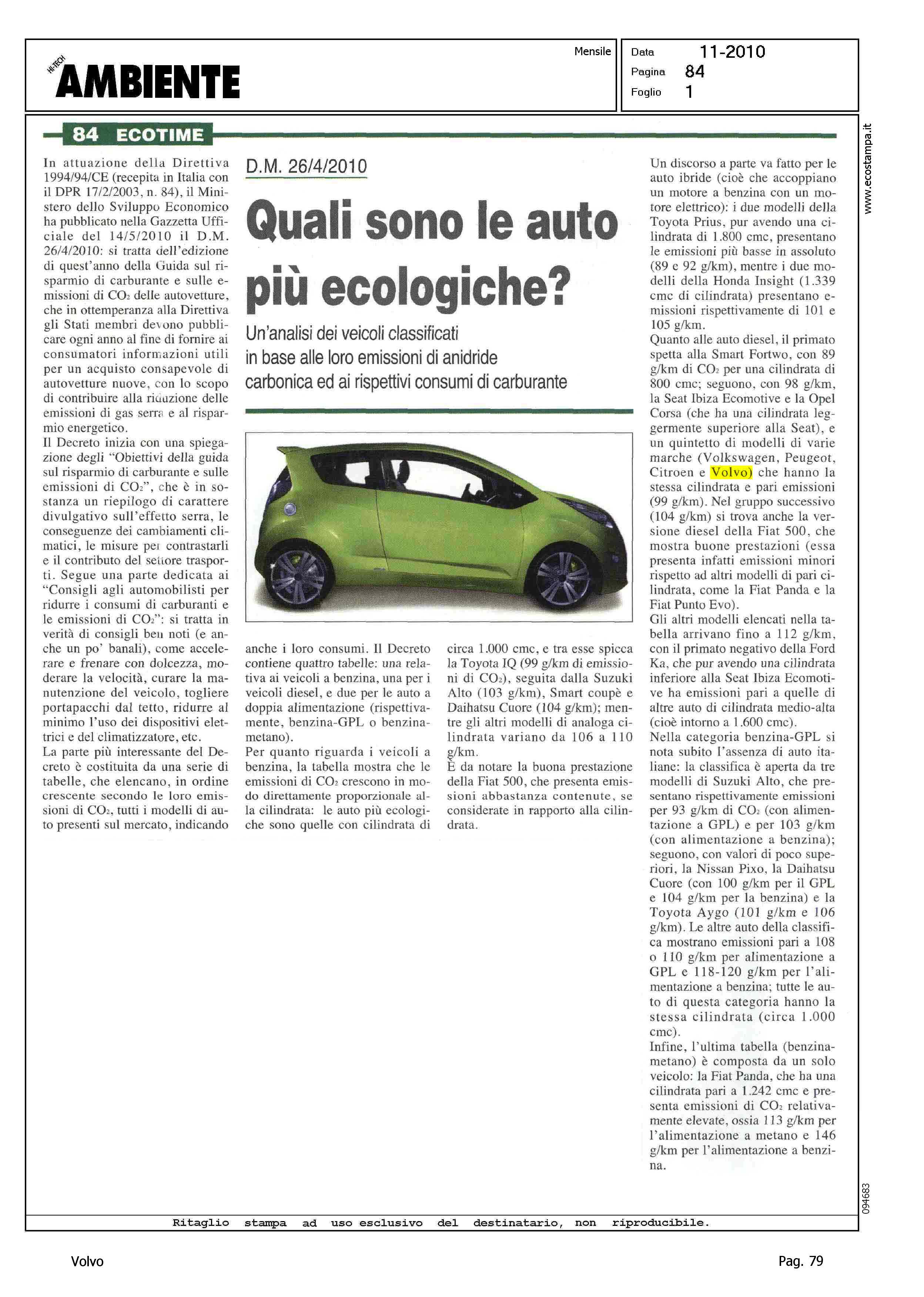 Author: Line: Corporate Model: Corporate Subject: - Title: QUALI SONO LE AUTO PIU' ECOLOGICHEHighlight: EMISSIONI - 99G/KM - VOLVO