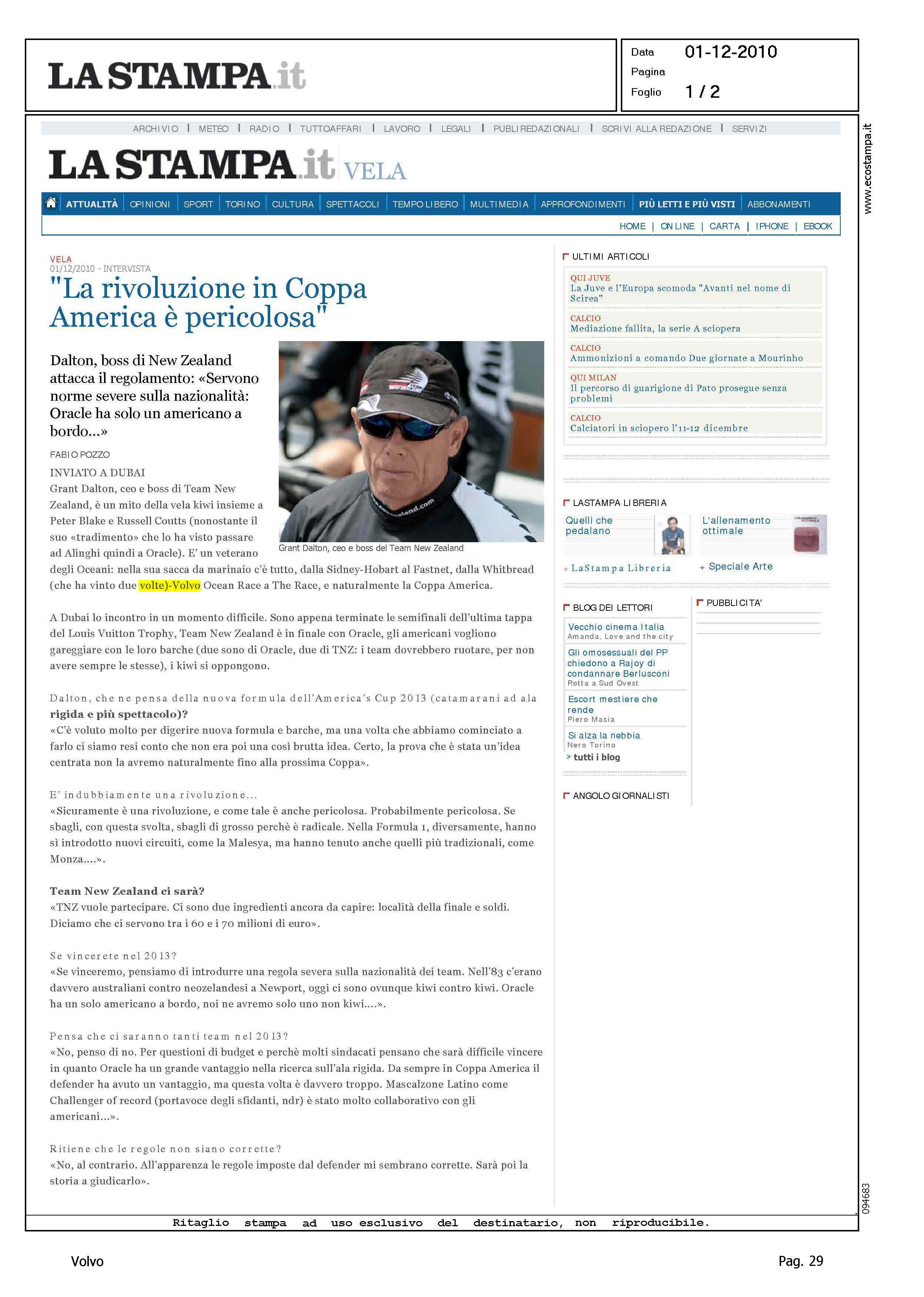 Author: Line: Corporate Model: Corporate Subject: Volvo Ocean Race Title: ''LA RIVOLUZIONE IN COPPA AMERICA E' PERICOLOSA''Highlight: DALTON, INTERVIEW - AMERICA'S CUP - VOLVO OCEAN RACE