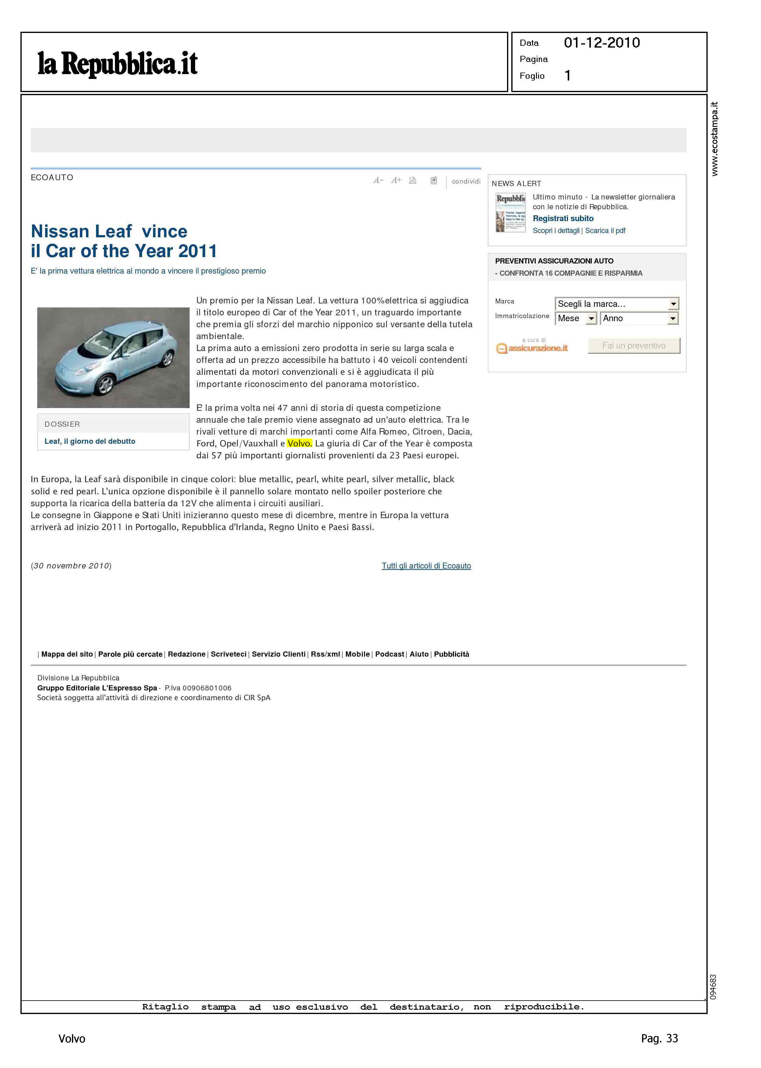 Author: Line: Corporate Model: Corporate Subject: - Title: NISSAN LEAF VINCE IL CAR OF THE YEAR 2011Highlight: ELETTA L'AUTO DELL'ANNO 2011 - VOLVO S60/V60
