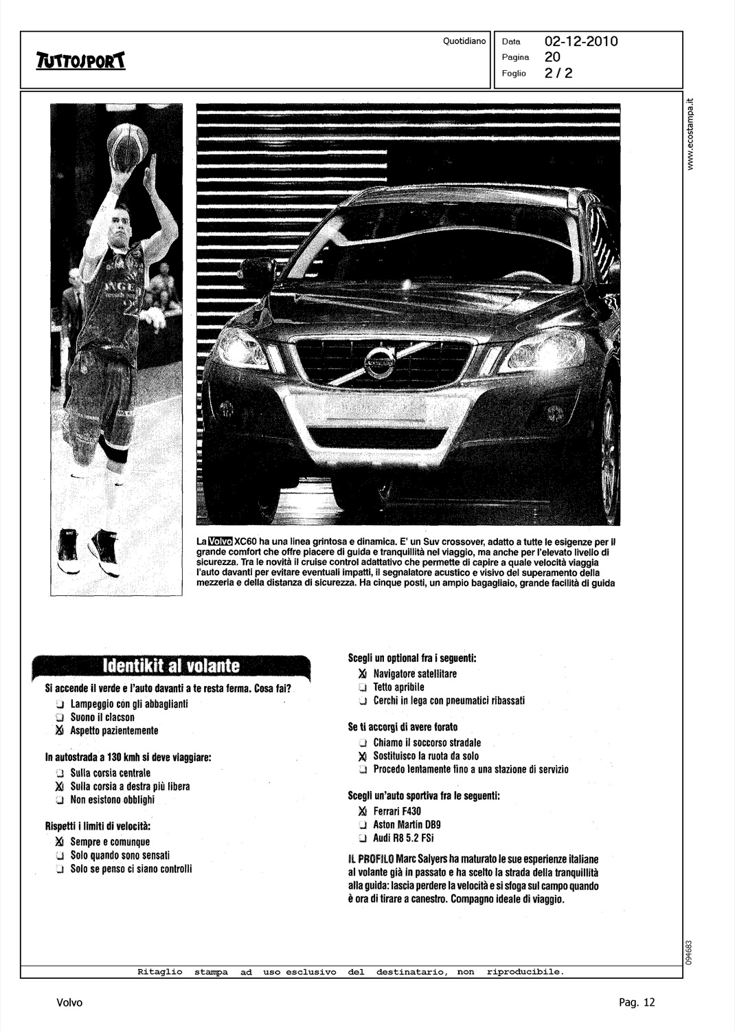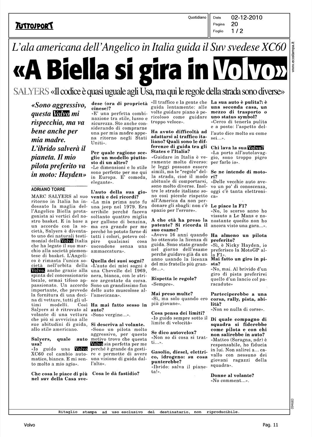 Author: TORRE, ADRIANOLine: Corporate Model: Corporate Subject: - Title: ''A BIELLA SI GIRA IN VOLVO''Highlight: VOLVO XC60 - MARC SALYERS - INTERVIEW, PROFILO DEL PERSONAGGIO, LA SUA AUTO - IDENTIKIT AL VOLANTE