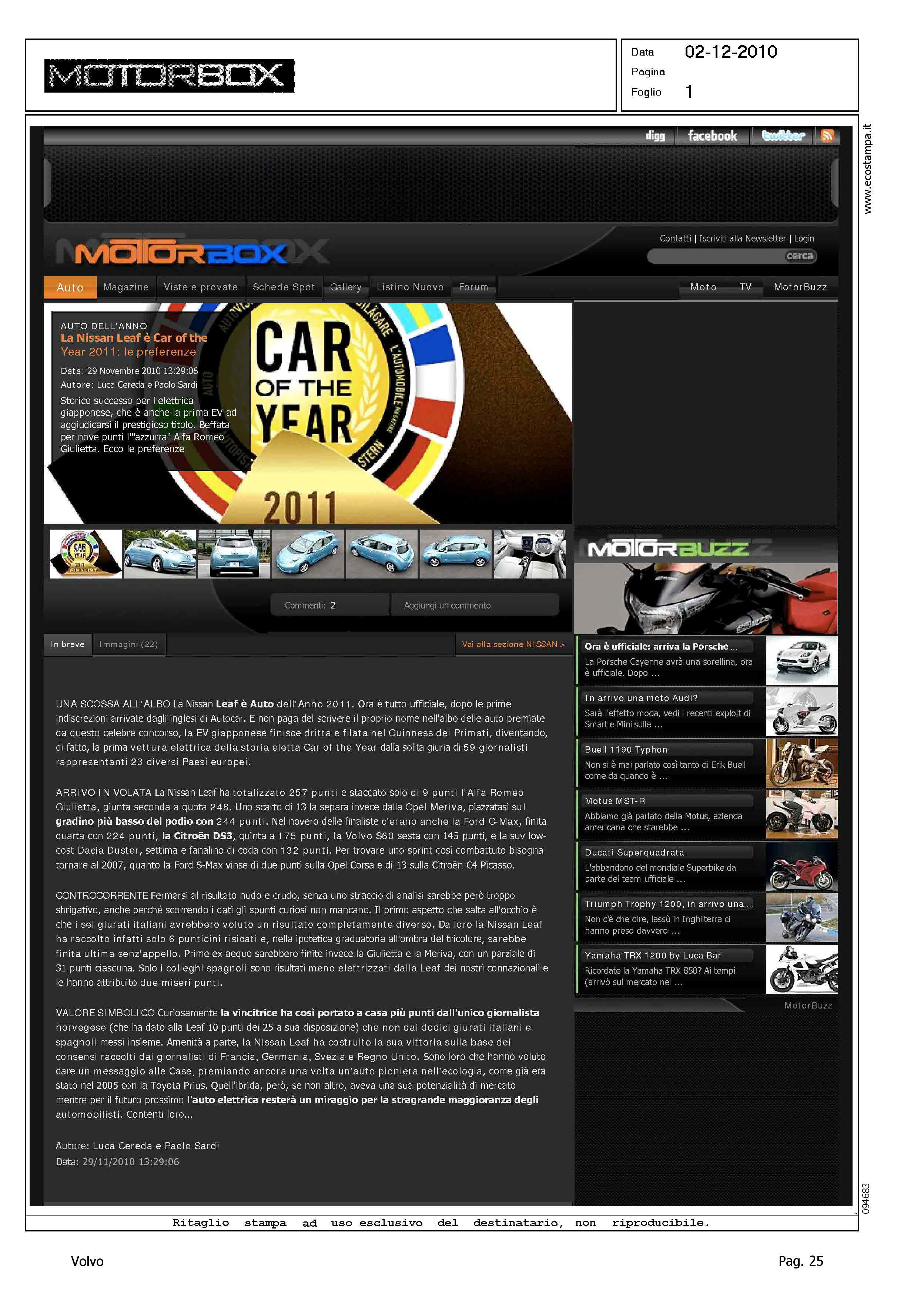 Author: Line: Corporate Model: Corporate Subject: - Title: LA NISSAN LEAF E' CAR OF THE YEAR 2011: LE PREFERENZEHighlight: ELETTA L'AUTO DELL'ANNO 2011 - VOLVO S60/V60