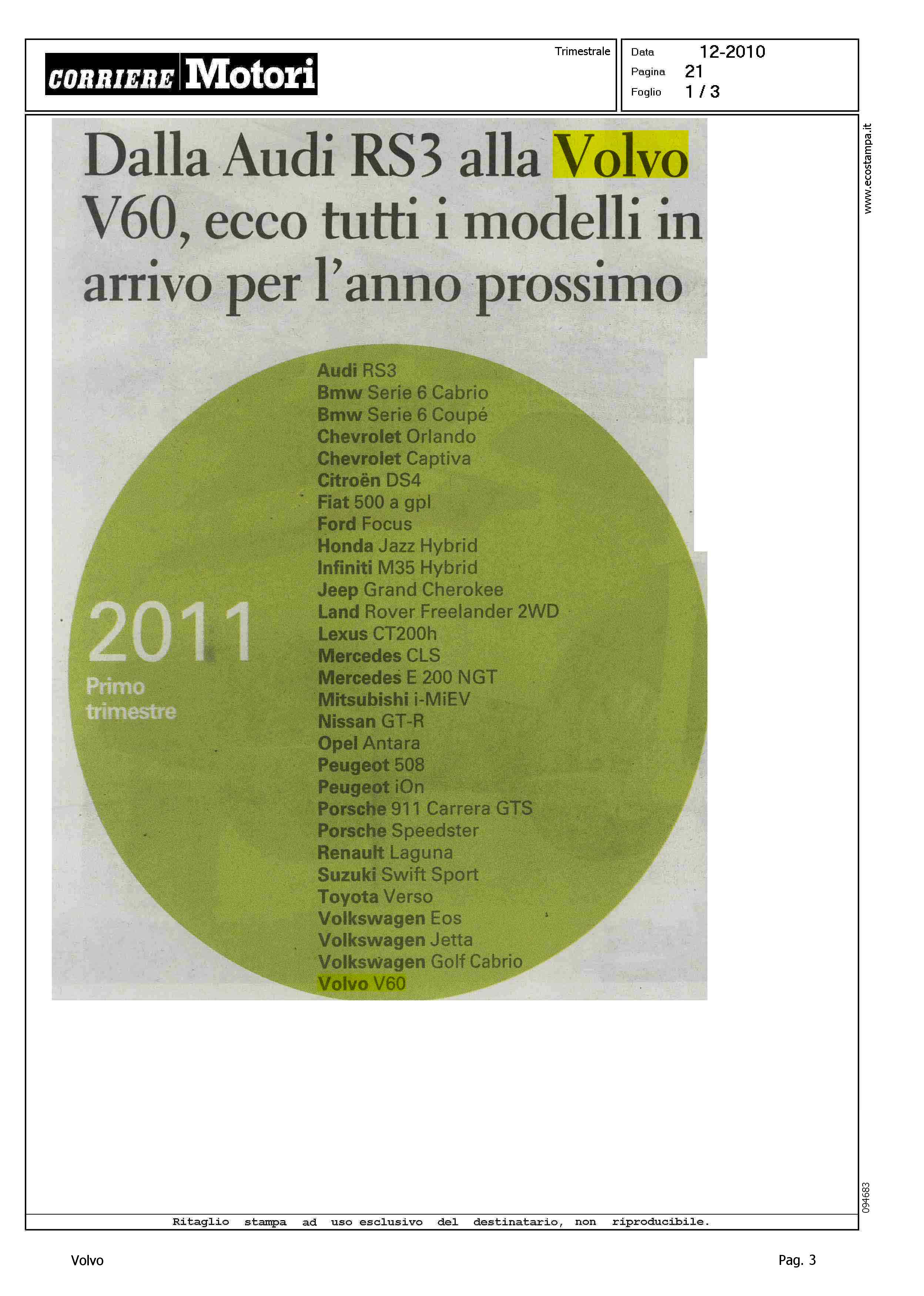 Author: Line: Corporate Model: Corporate Subject: - Title: DALLA AUDI RS3 ALLA VOLVO V60, ECCO TUTTI I MODELLI IN ARRIVO PER L'ANNO PROSSIMOHighlight: VOLVO V60 - DESIGN - CONSEGNE 2011