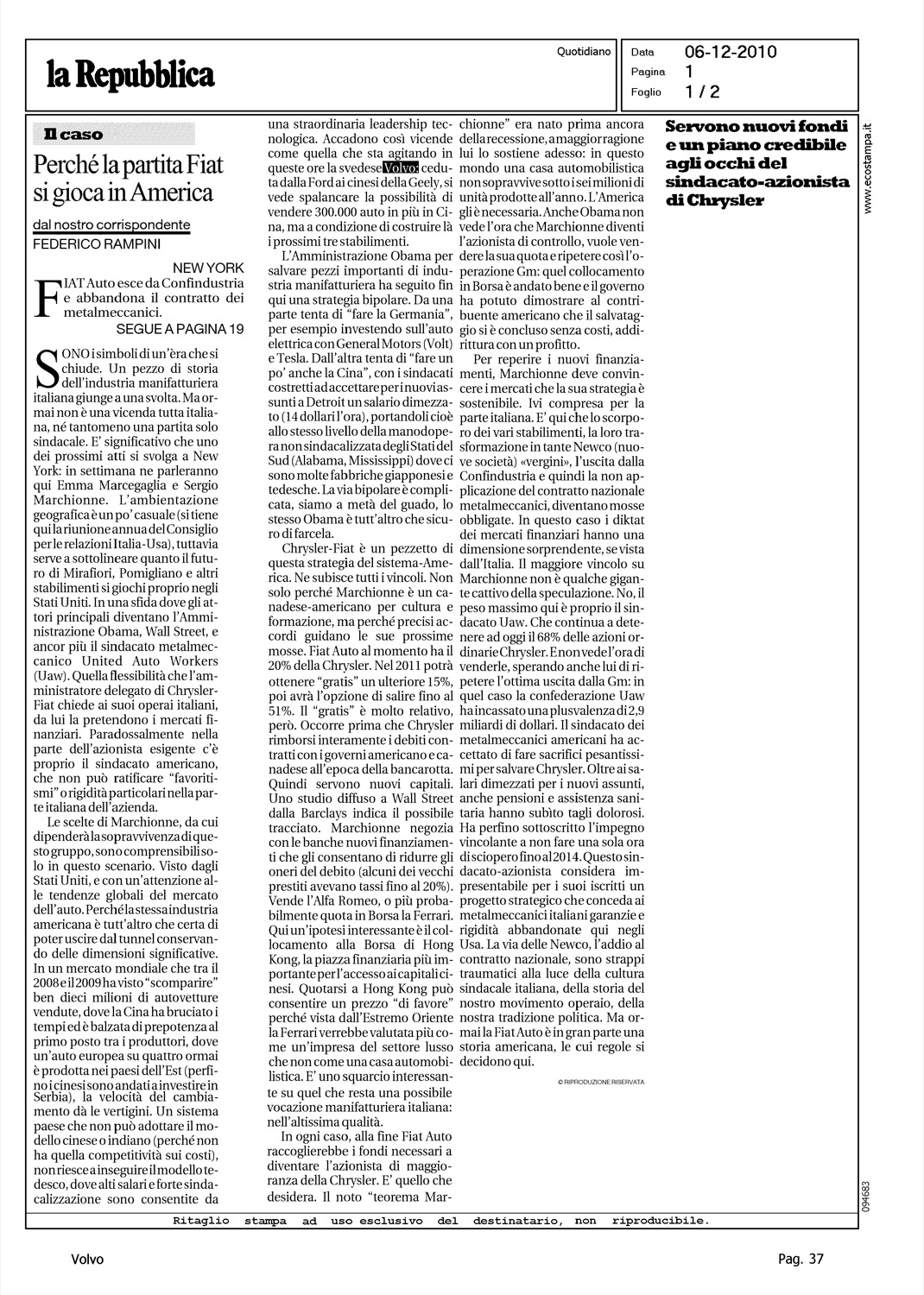 Author: RAMPINI, FEDERICOLine: Corporate Model: Corporate Subject: - Title: PERCHE' LA PARTITA FIAT SI GIOCA IN AMERICAHighlight: VOLVO - GEELY