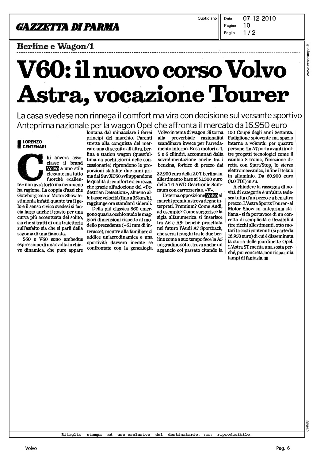Author: CENTENARI, LORENZOLine: Corporate Model: Corporate Subject: - Title: V60: IL NUOVO CORSO VOLVOHighlight: VOLVO V60 - PROFILO PRODOTTO - VALORE VOLVO WAGON - GAMMA 60 - DESIGN - MOTORI - PREZZI