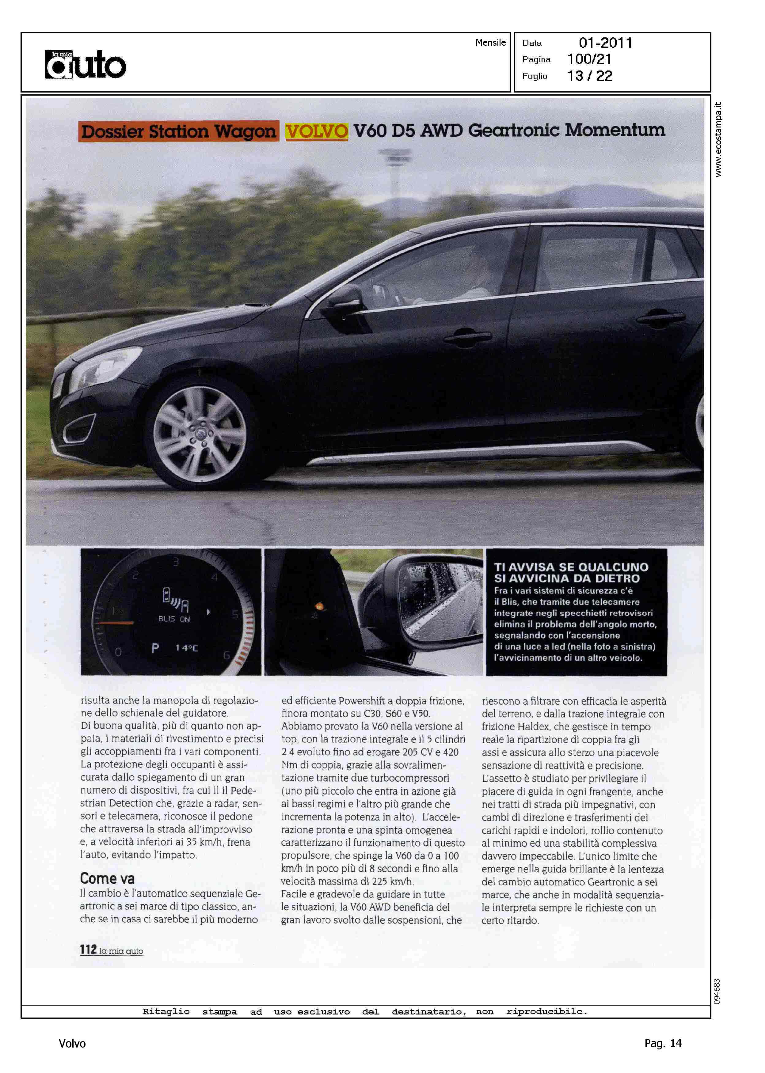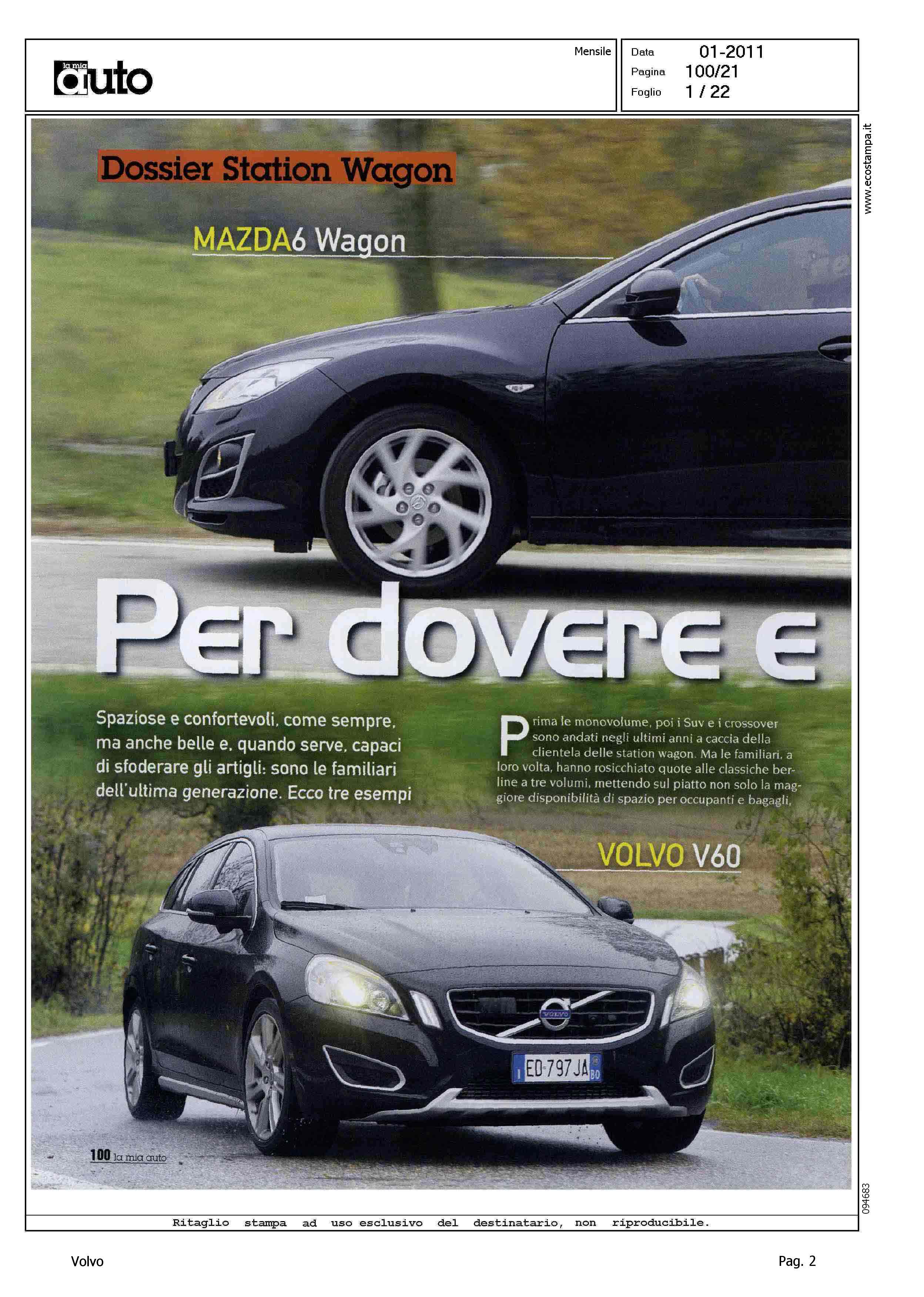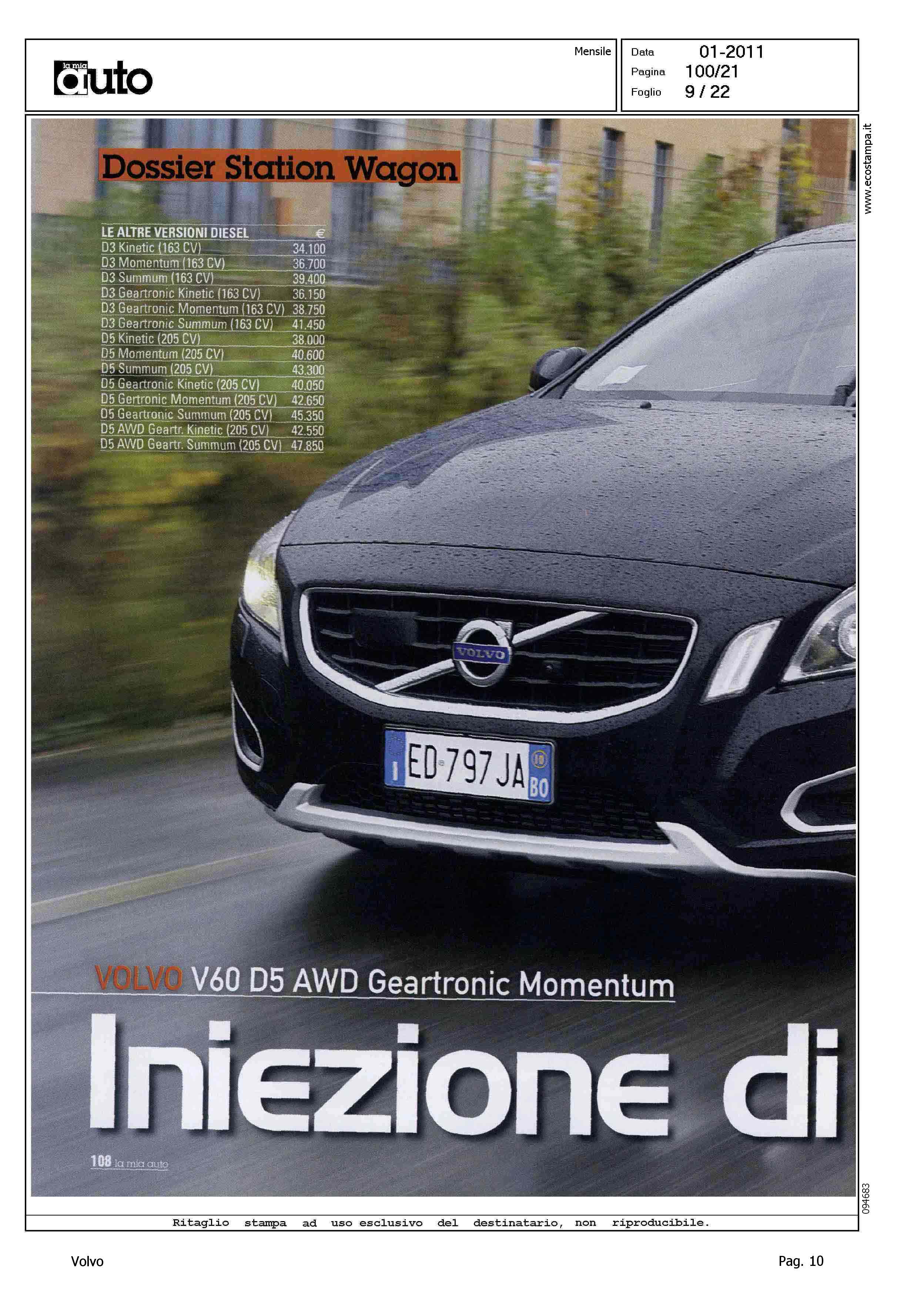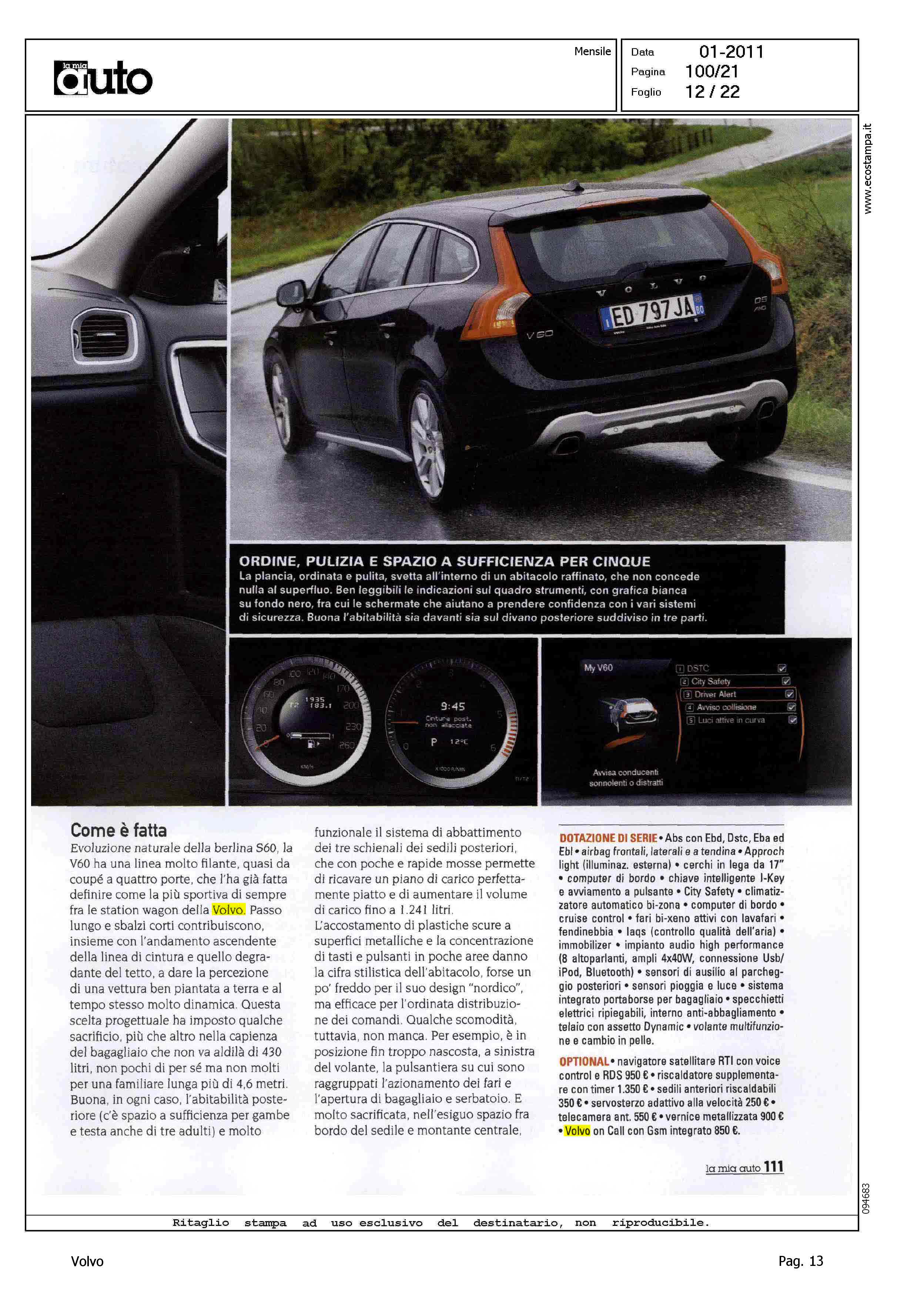 Highlight: (USCITA DI GENNAIO 2011) - TEST DRIVE - VOLVO V60 D5 AWD GEARTRONIC MOMENTUM - OCCHIELLO: "CON UN LOOK GRINTOSO E UN'ECCELLENTE GUIDABILITA' SEGNA UNA SVOLTA NELLA TRADIZIONE DELLE FAMILIARI SVEDESI. A CUI TIENE FEDE PER SPAZIO E SICUREZZA" - IN&OUT: (VERDE), LOOK E DINAMISMO, LINEA FILANTE, QUASI DA COUPE' - PIACEVOLE ANCHE NELLA GUIDA PIU' IMPEGNATIVA - (GIALLO), ABITACOLO, INTERNI RAFFINATI MA NON DEL TUTTO ERGONOMICI - (ROSSO), CAMBIO E PREZZO, AUTOMATICO LENTO ANCHE IN MODALITA' SEQUENZIALE, SI FA PAGARE BENE - SCHEDA TECNICA DATI PRINCIPALI - IN APERTURA, PRESTAZIONI, CONSUMI, PREZZO - CORPO ARTICOLO: COME E' FATTA - DOTAZIONE DI SERIE - OPTIONAL - COME VA - SICUREZZA - ACCESSORI SICUREZZA DINAMICA DI MARCIA - SERVIZIO 22 PAGINE CON TEST DRIVE DI MAZDA 6 WAGON 2.2 CD 180CV SPORT, FORD MONDEO 2.0 TDCI TITANIUM POWERSHIFT E SCHEDE DI OPEL INSIGNIA SPORTS TOURER, PEUGEOT 508 SW