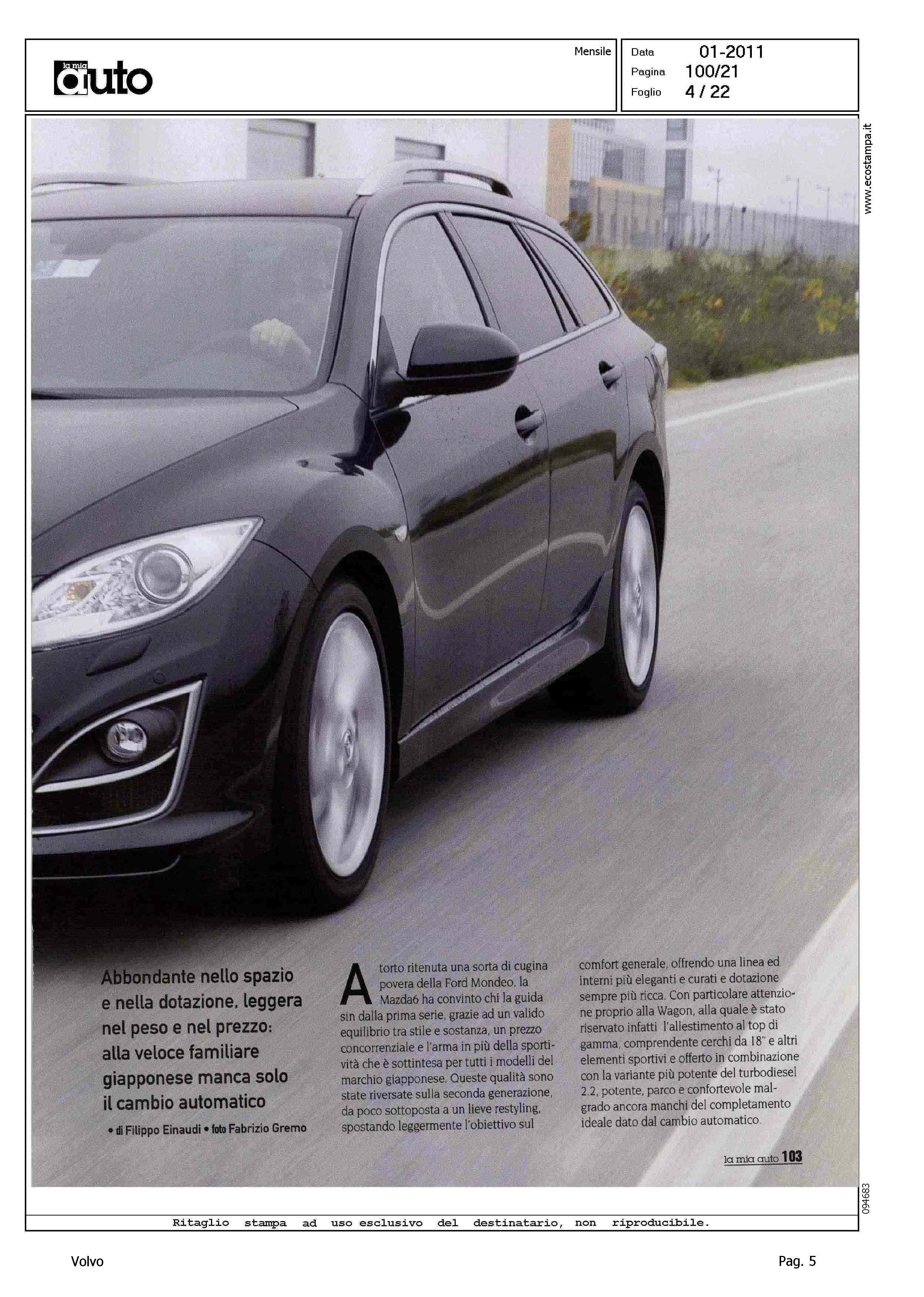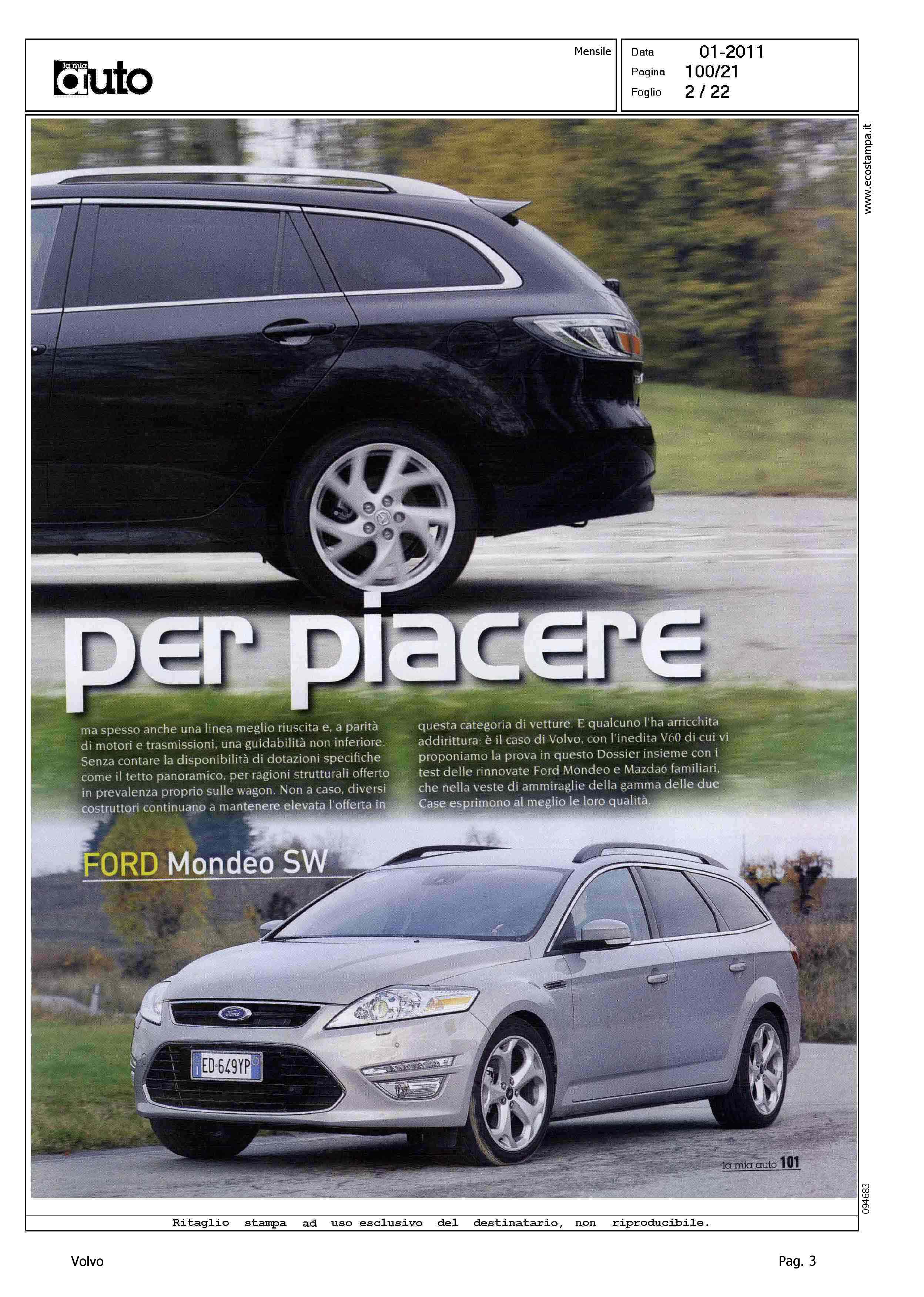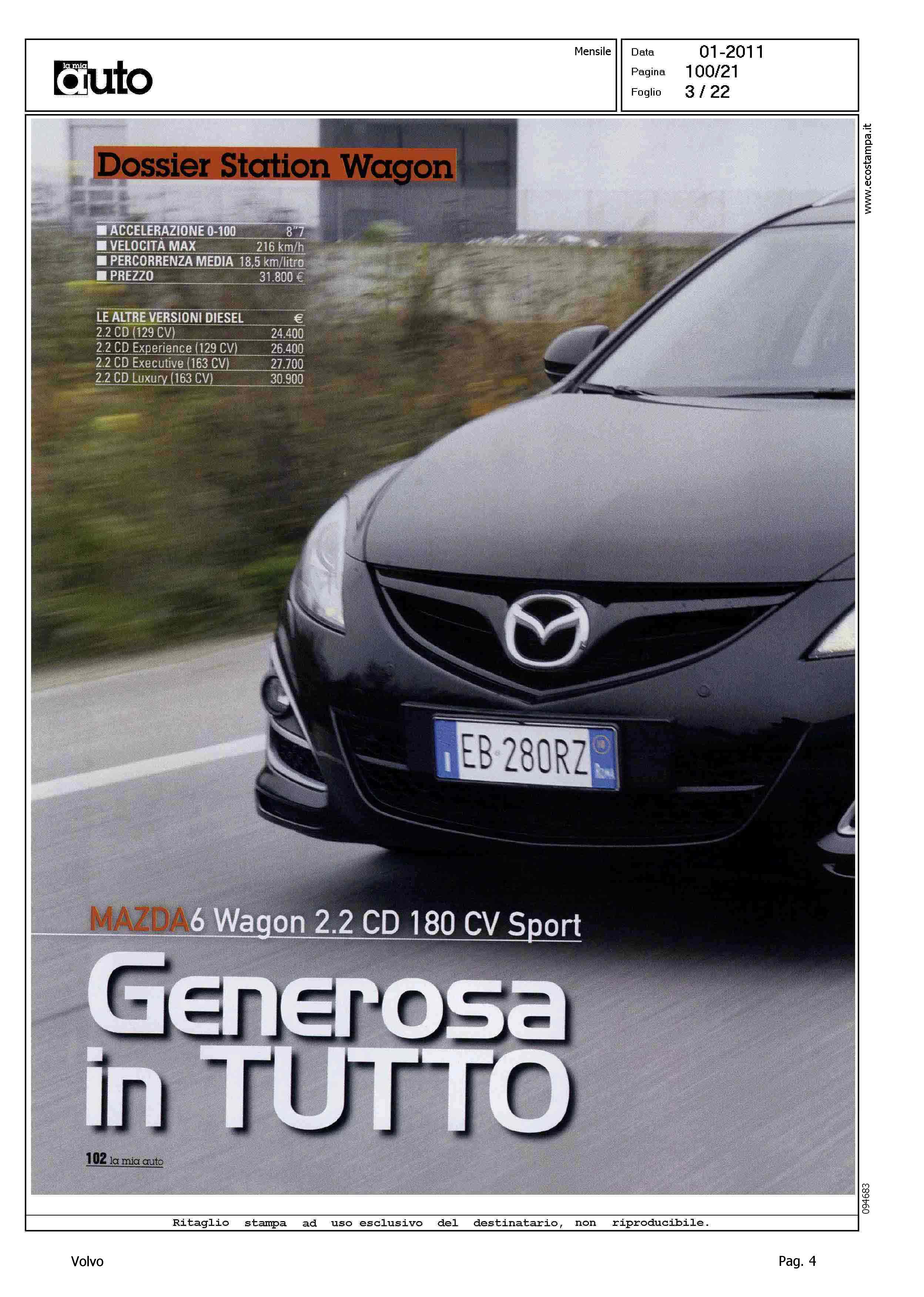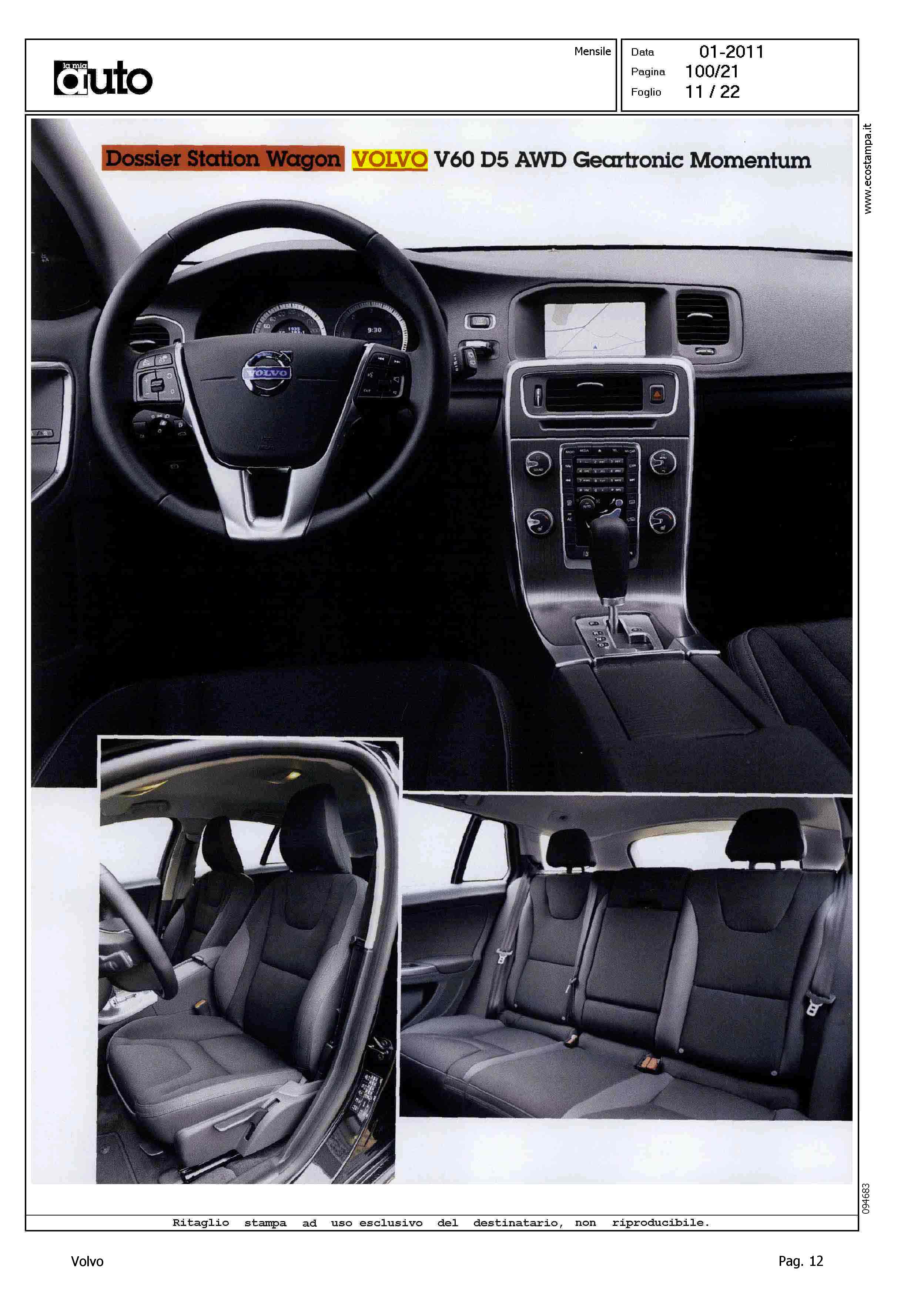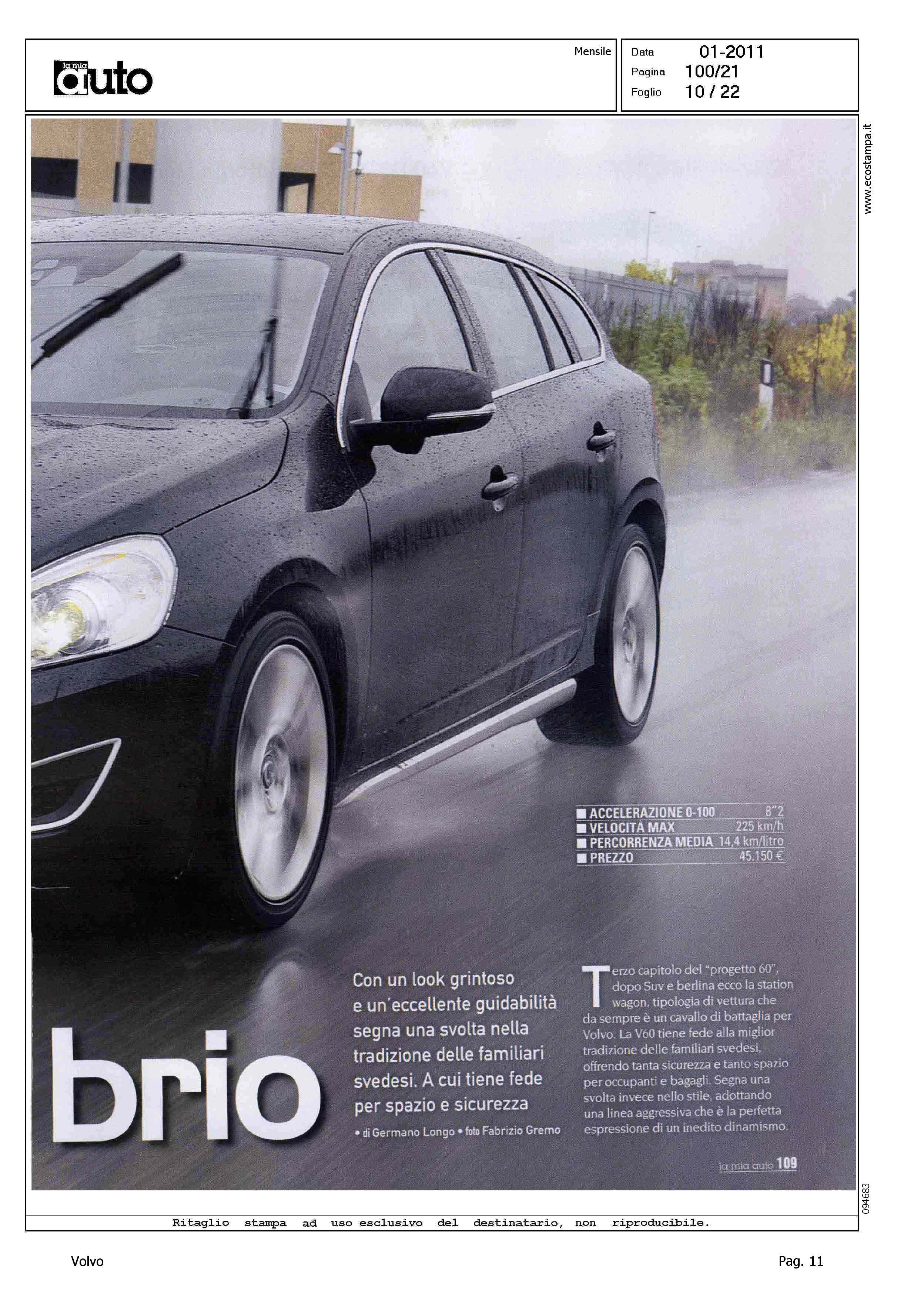 Highlight: (USCITA DI GENNAIO 2011) - TEST DRIVE - VOLVO V60 D5 AWD GEARTRONIC MOMENTUM - OCCHIELLO: "CON UN LOOK GRINTOSO E UN'ECCELLENTE GUIDABILITA' SEGNA UNA SVOLTA NELLA TRADIZIONE DELLE FAMILIARI SVEDESI. A CUI TIENE FEDE PER SPAZIO E SICUREZZA" - IN&OUT: (VERDE), LOOK E DINAMISMO, LINEA FILANTE, QUASI DA COUPE' - PIACEVOLE ANCHE NELLA GUIDA PIU' IMPEGNATIVA - (GIALLO), ABITACOLO, INTERNI RAFFINATI MA NON DEL TUTTO ERGONOMICI - (ROSSO), CAMBIO E PREZZO, AUTOMATICO LENTO ANCHE IN MODALITA' SEQUENZIALE, SI FA PAGARE BENE - SCHEDA TECNICA DATI PRINCIPALI - IN APERTURA, PRESTAZIONI, CONSUMI, PREZZO - CORPO ARTICOLO: COME E' FATTA - DOTAZIONE DI SERIE - OPTIONAL - COME VA - SICUREZZA - ACCESSORI SICUREZZA DINAMICA DI MARCIA - SERVIZIO 22 PAGINE CON TEST DRIVE DI MAZDA 6 WAGON 2.2 CD 180CV SPORT, FORD MONDEO 2.0 TDCI TITANIUM POWERSHIFT E SCHEDE DI OPEL INSIGNIA SPORTS TOURER, PEUGEOT 508 SW