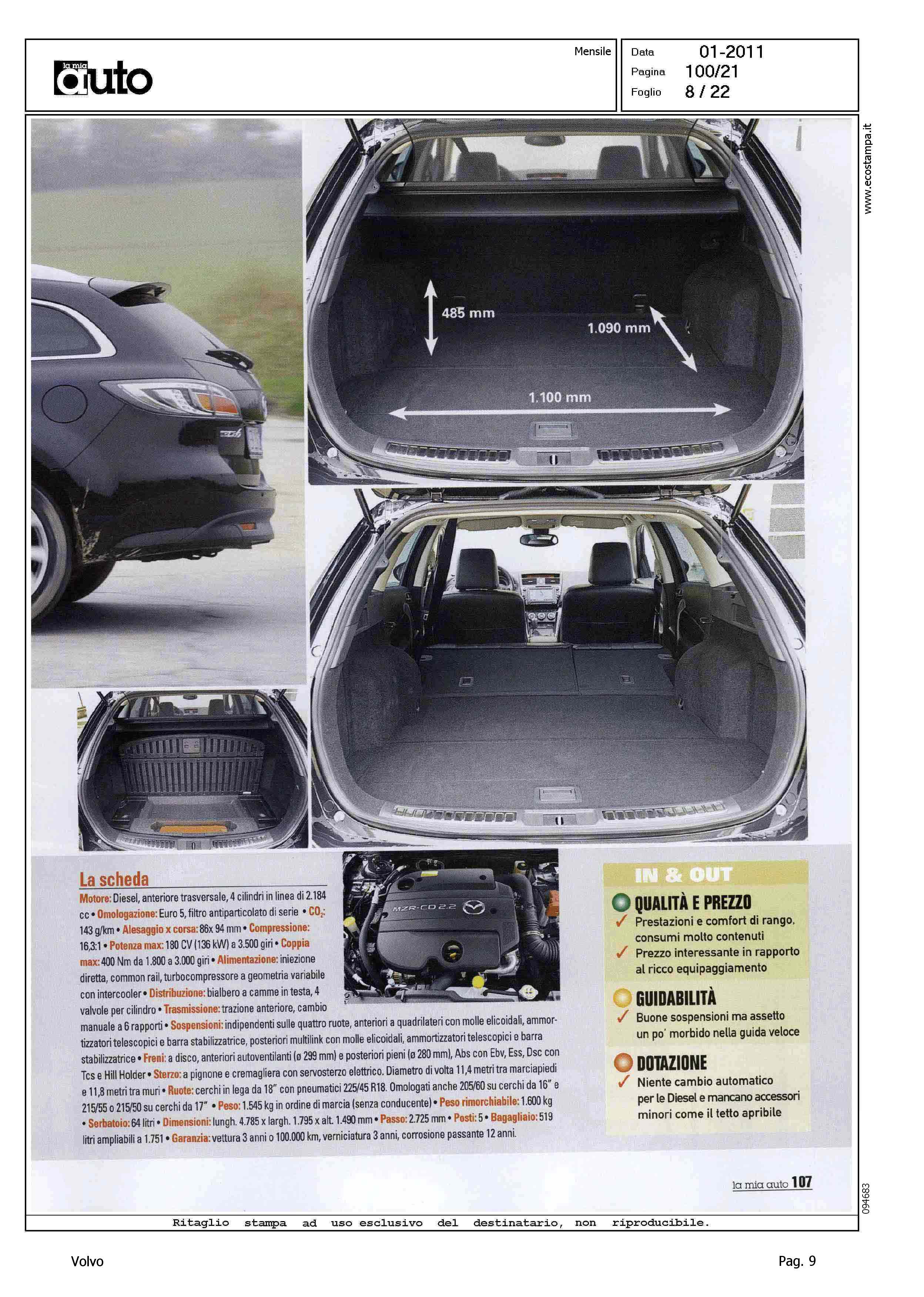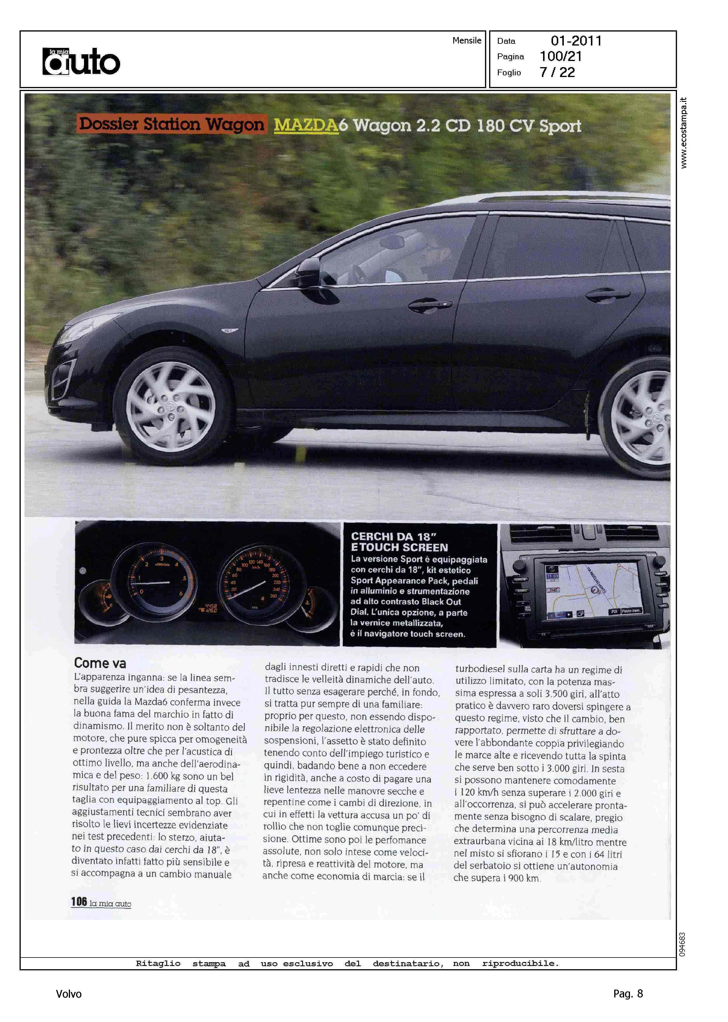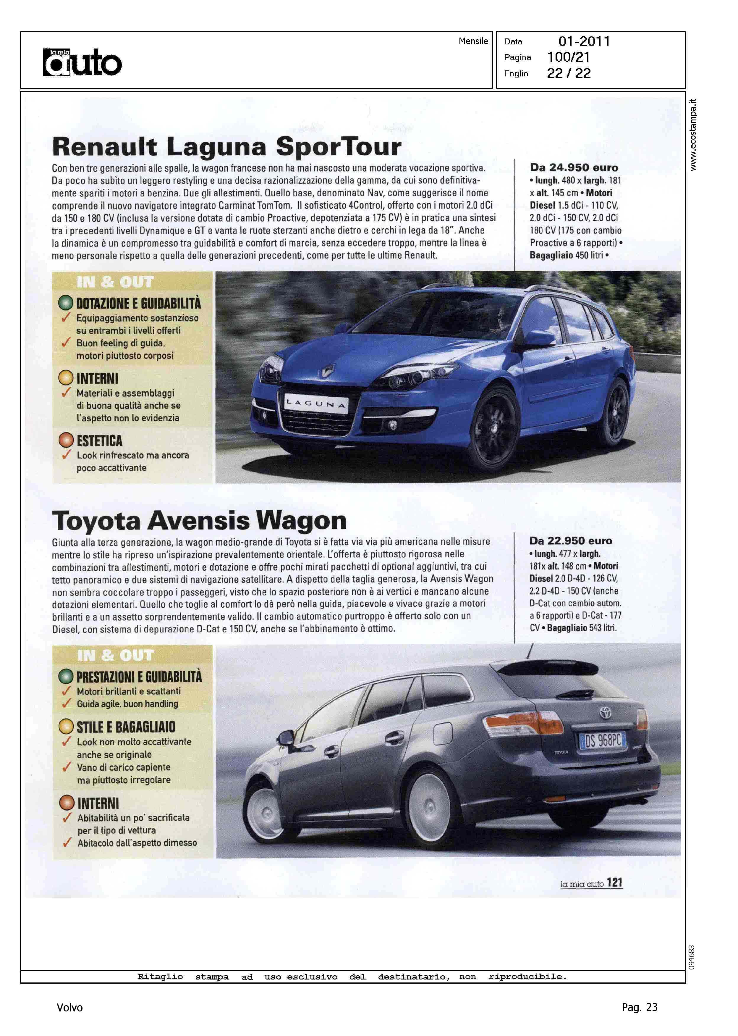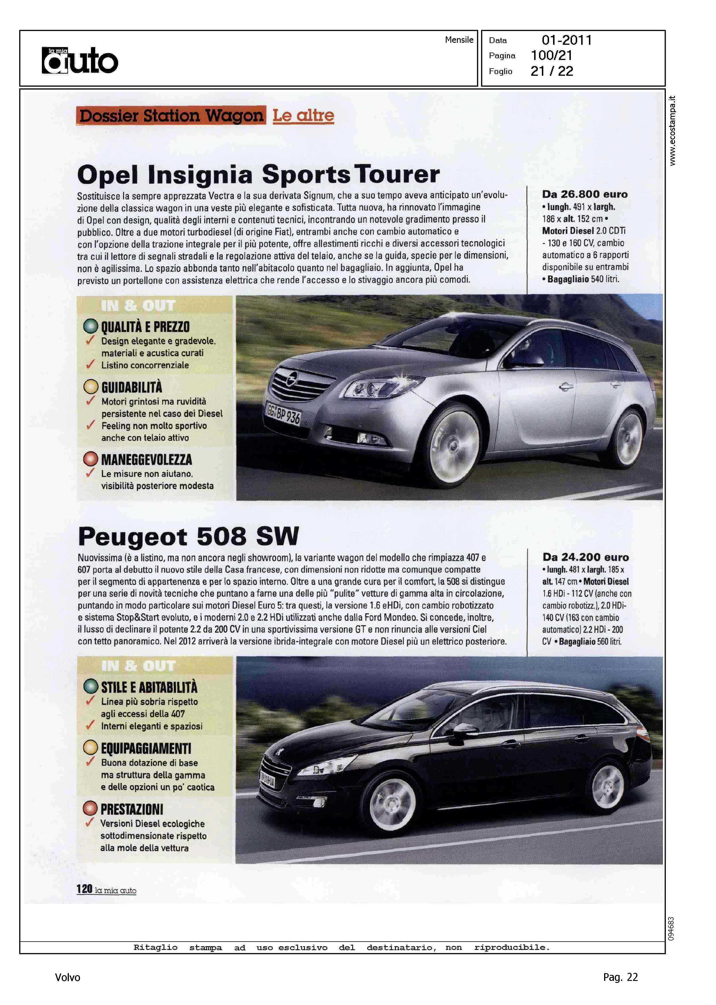 Highlight: (USCITA DI GENNAIO 2011) - TEST DRIVE - VOLVO V60 D5 AWD GEARTRONIC MOMENTUM - OCCHIELLO: "CON UN LOOK GRINTOSO E UN'ECCELLENTE GUIDABILITA' SEGNA UNA SVOLTA NELLA TRADIZIONE DELLE FAMILIARI SVEDESI. A CUI TIENE FEDE PER SPAZIO E SICUREZZA" - IN&OUT: (VERDE), LOOK E DINAMISMO, LINEA FILANTE, QUASI DA COUPE' - PIACEVOLE ANCHE NELLA GUIDA PIU' IMPEGNATIVA - (GIALLO), ABITACOLO, INTERNI RAFFINATI MA NON DEL TUTTO ERGONOMICI - (ROSSO), CAMBIO E PREZZO, AUTOMATICO LENTO ANCHE IN MODALITA' SEQUENZIALE, SI FA PAGARE BENE - SCHEDA TECNICA DATI PRINCIPALI - IN APERTURA, PRESTAZIONI, CONSUMI, PREZZO - CORPO ARTICOLO: COME E' FATTA - DOTAZIONE DI SERIE - OPTIONAL - COME VA - SICUREZZA - ACCESSORI SICUREZZA DINAMICA DI MARCIA - SERVIZIO 22 PAGINE CON TEST DRIVE DI MAZDA 6 WAGON 2.2 CD 180CV SPORT, FORD MONDEO 2.0 TDCI TITANIUM POWERSHIFT E SCHEDE DI OPEL INSIGNIA SPORTS TOURER, PEUGEOT 508 SW