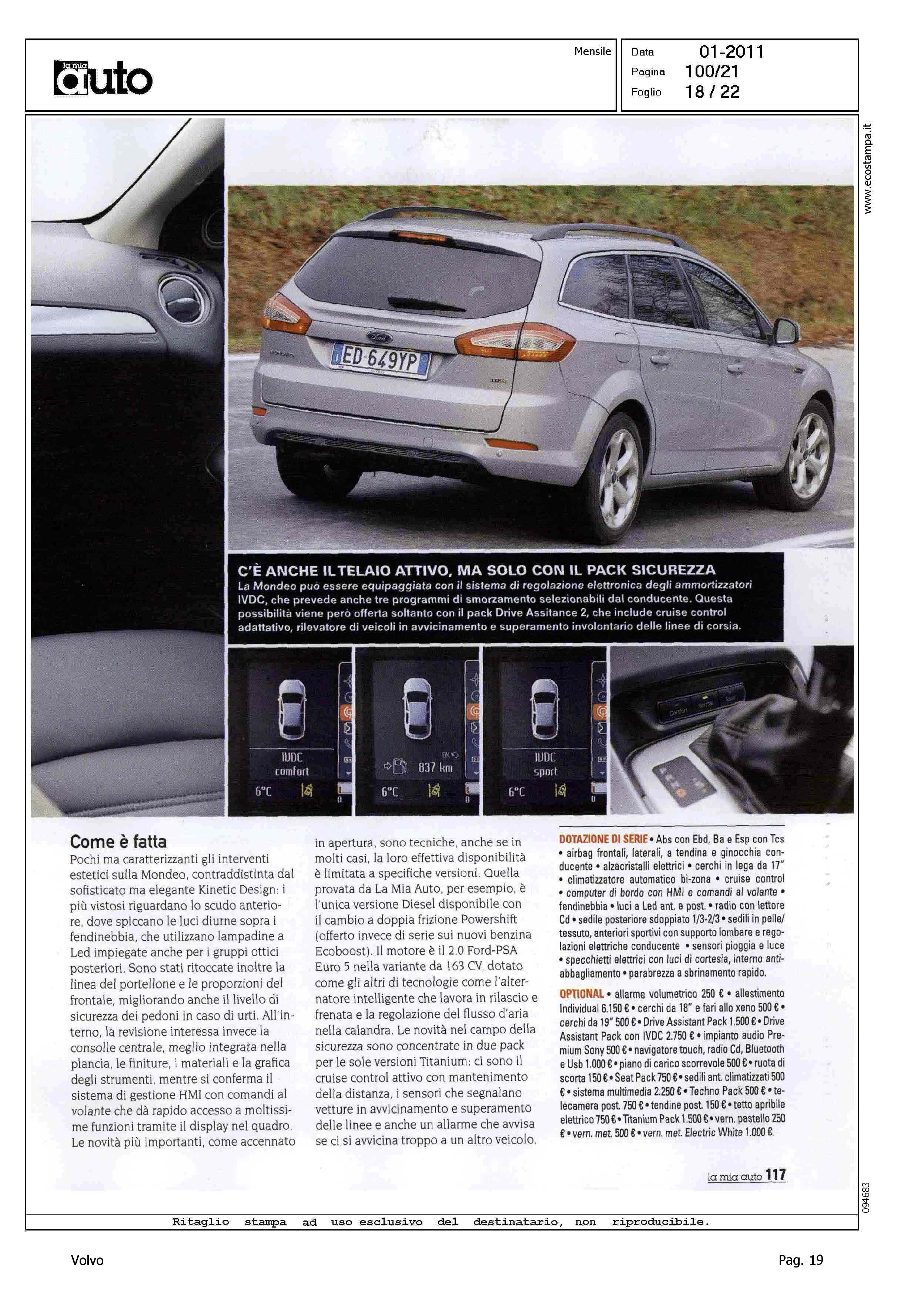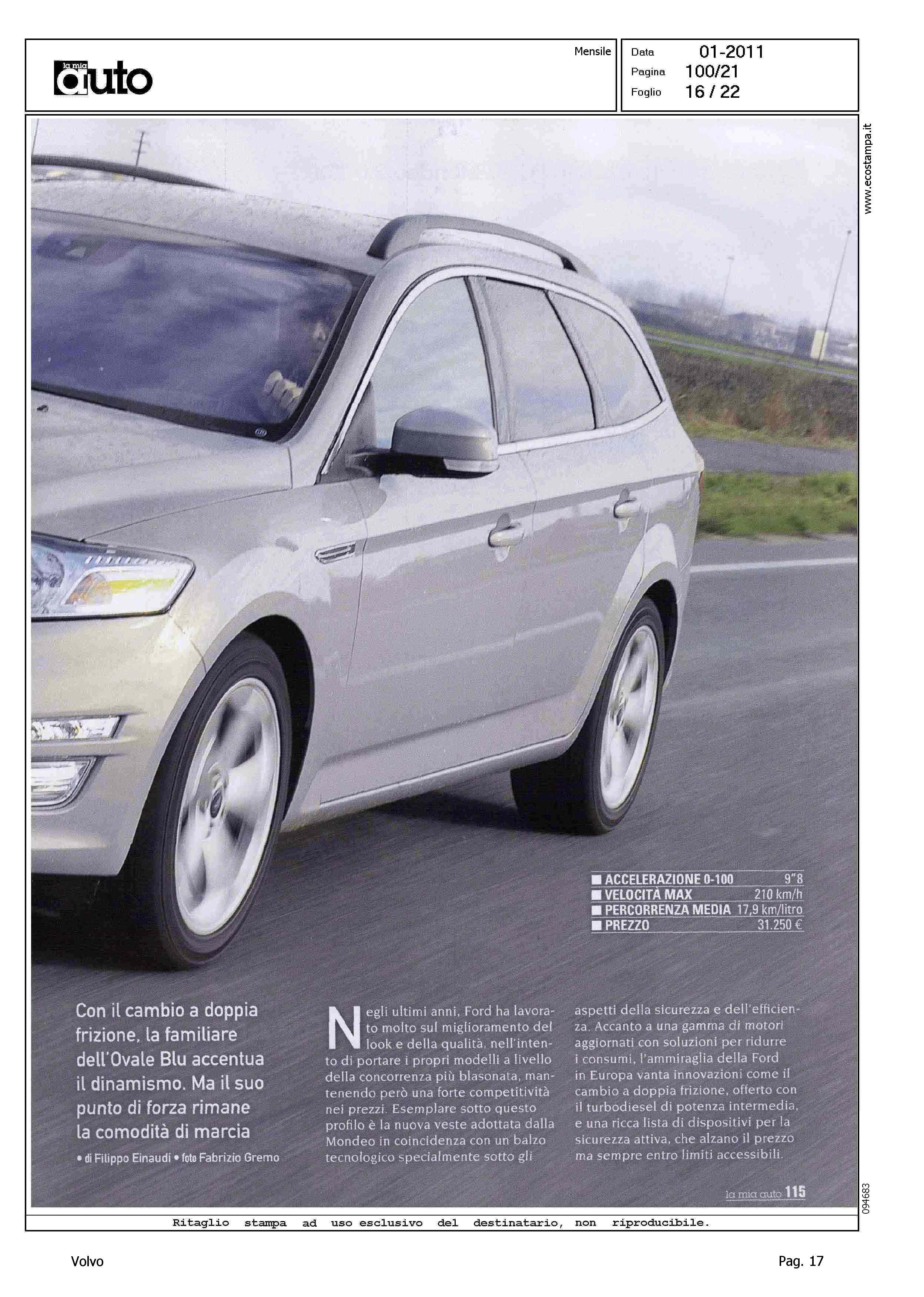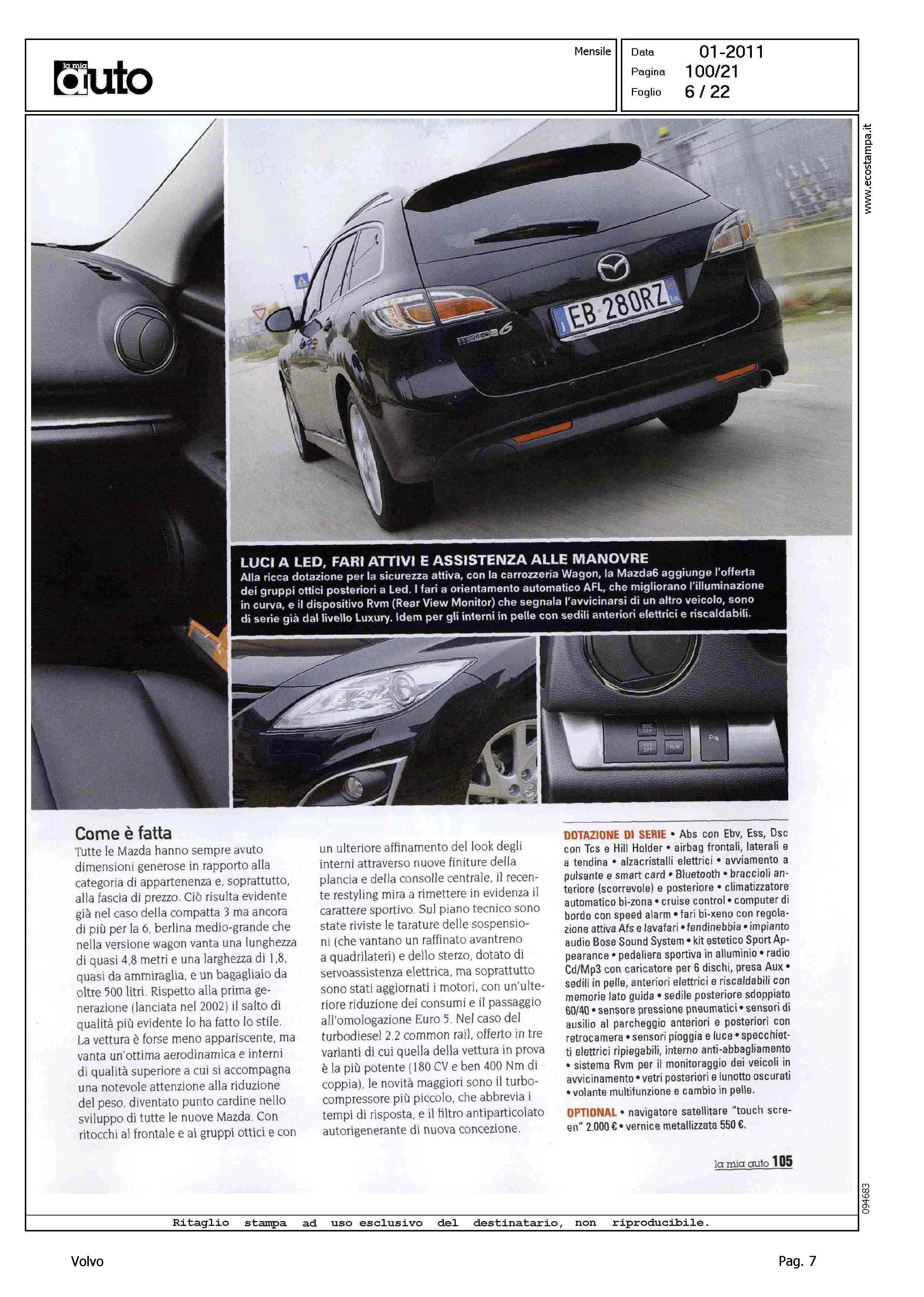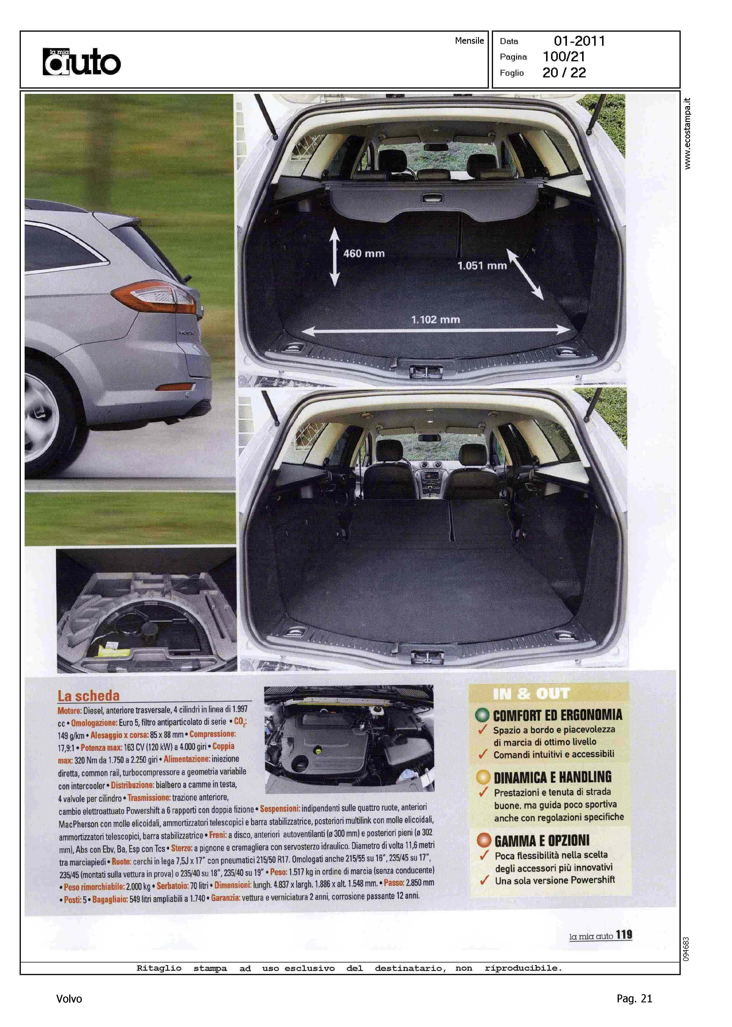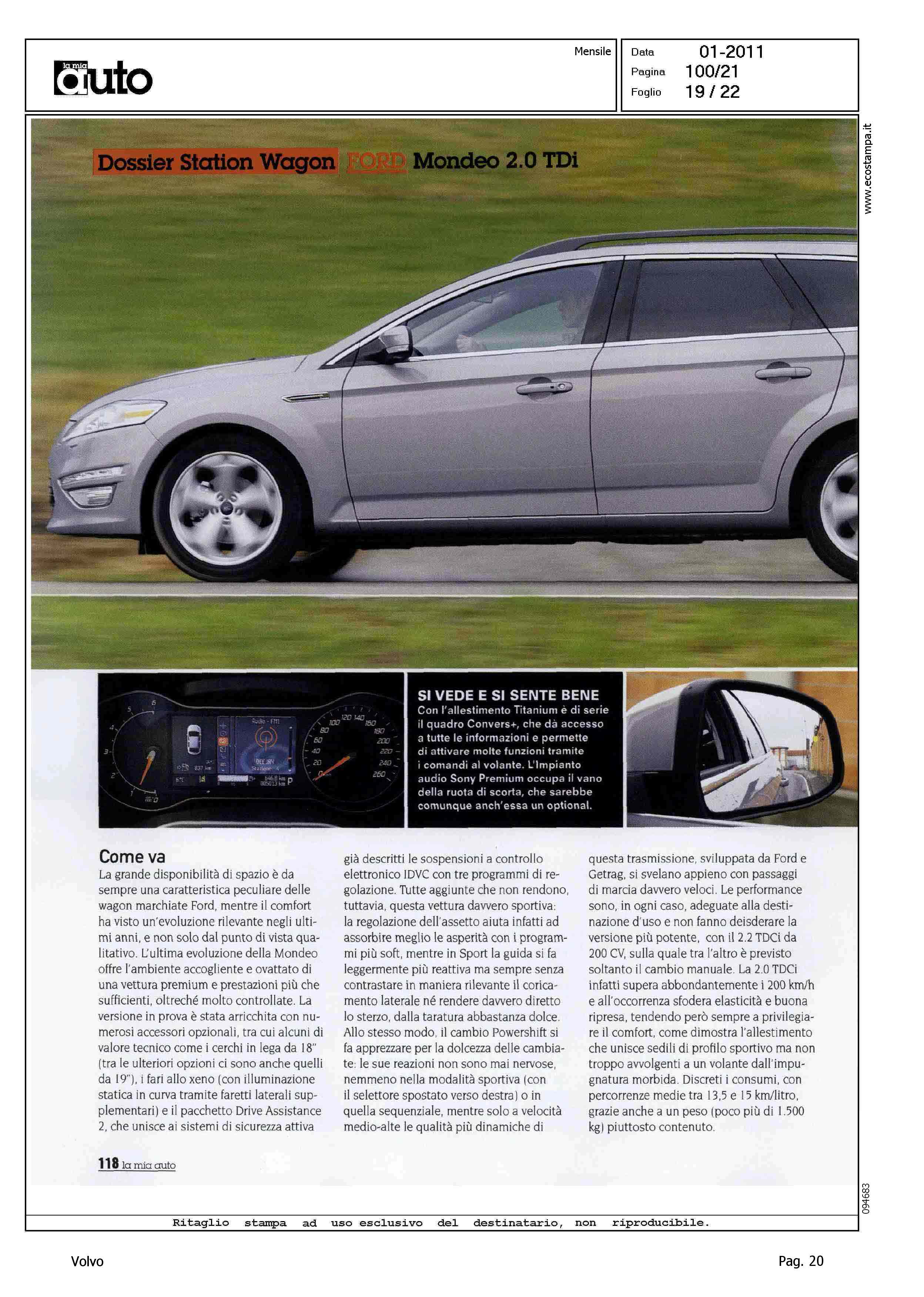 Highlight: (USCITA DI GENNAIO 2011) - TEST DRIVE - VOLVO V60 D5 AWD GEARTRONIC MOMENTUM - OCCHIELLO: "CON UN LOOK GRINTOSO E UN'ECCELLENTE GUIDABILITA' SEGNA UNA SVOLTA NELLA TRADIZIONE DELLE FAMILIARI SVEDESI. A CUI TIENE FEDE PER SPAZIO E SICUREZZA" - IN&OUT: (VERDE), LOOK E DINAMISMO, LINEA FILANTE, QUASI DA COUPE' - PIACEVOLE ANCHE NELLA GUIDA PIU' IMPEGNATIVA - (GIALLO), ABITACOLO, INTERNI RAFFINATI MA NON DEL TUTTO ERGONOMICI - (ROSSO), CAMBIO E PREZZO, AUTOMATICO LENTO ANCHE IN MODALITA' SEQUENZIALE, SI FA PAGARE BENE - SCHEDA TECNICA DATI PRINCIPALI - IN APERTURA, PRESTAZIONI, CONSUMI, PREZZO - CORPO ARTICOLO: COME E' FATTA - DOTAZIONE DI SERIE - OPTIONAL - COME VA - SICUREZZA - ACCESSORI SICUREZZA DINAMICA DI MARCIA - SERVIZIO 22 PAGINE CON TEST DRIVE DI MAZDA 6 WAGON 2.2 CD 180CV SPORT, FORD MONDEO 2.0 TDCI TITANIUM POWERSHIFT E SCHEDE DI OPEL INSIGNIA SPORTS TOURER, PEUGEOT 508 SW