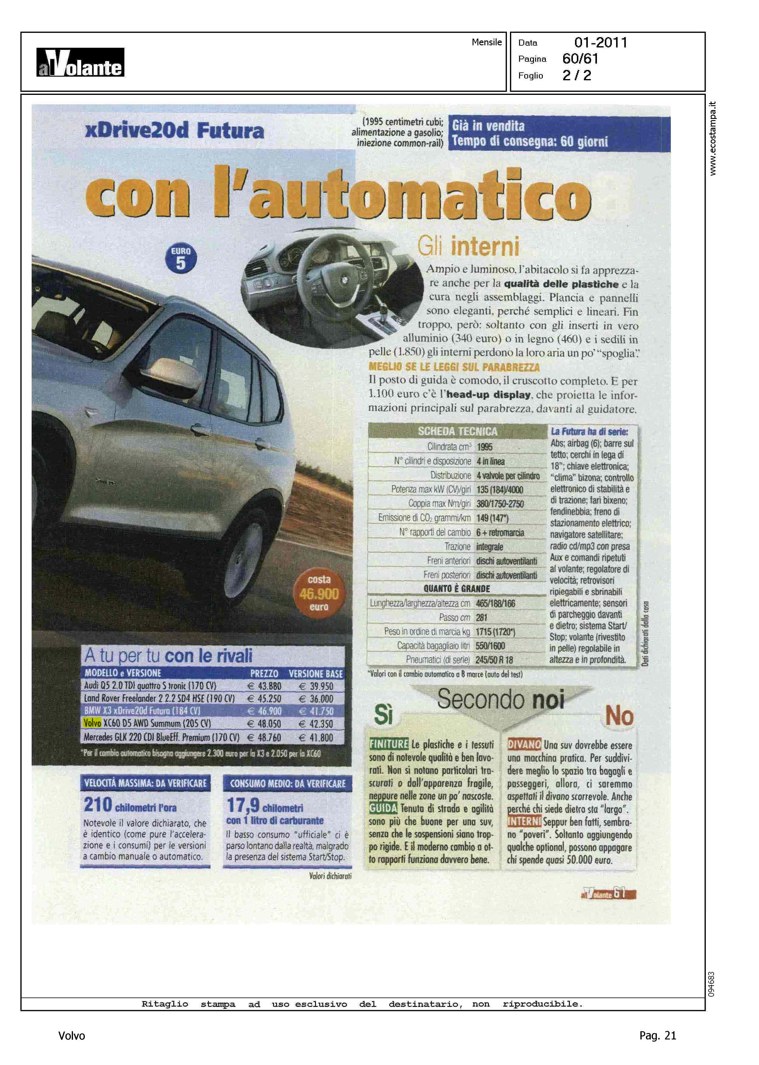 Author: Line: XC60 Model: - Subject: - Title: A TU PER TU CON LE RIVALIHighlight: TABELLA - VOLVO XC60 - COMPETITOR - BMW X3 - PREZZO - ALTRI COMPETITOR, AUDI Q5, LAND ROVER FREELANDER, MERCEDES GLK