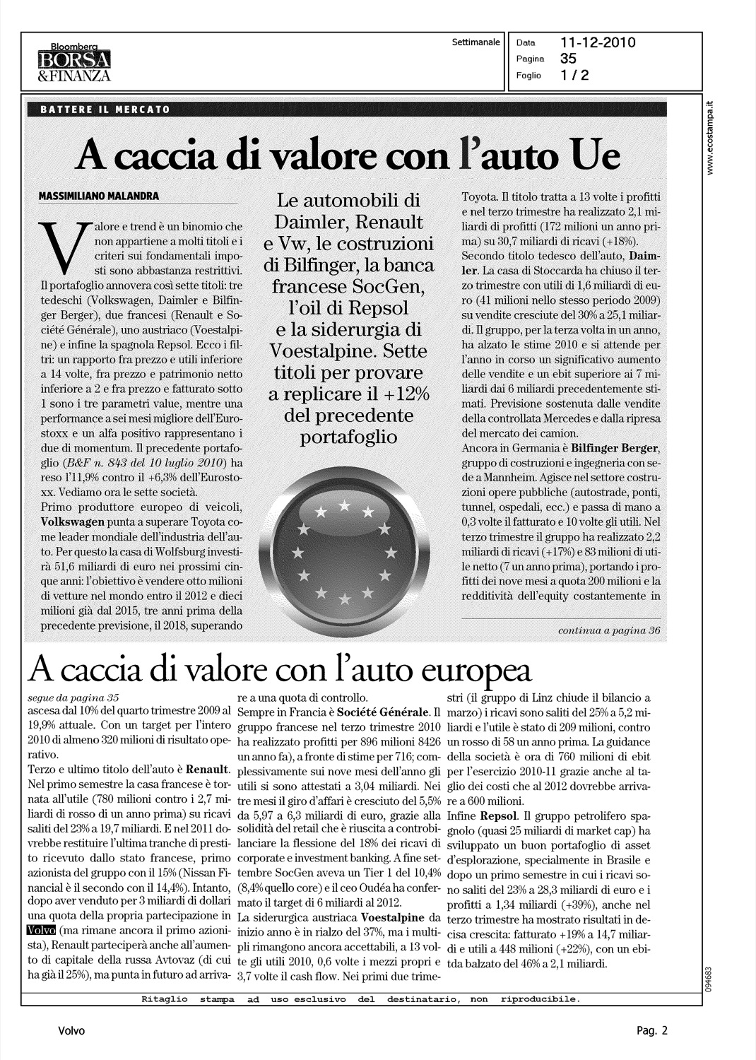 Author: MALANDRA, MASSIMILIANOLine: Corporate Model: Corporate Subject: - Title: A CACCIA DI VALORE CON L'AUTO EUROPEAHighlight: RENAULT, VENDITA QUOTA VOLVO