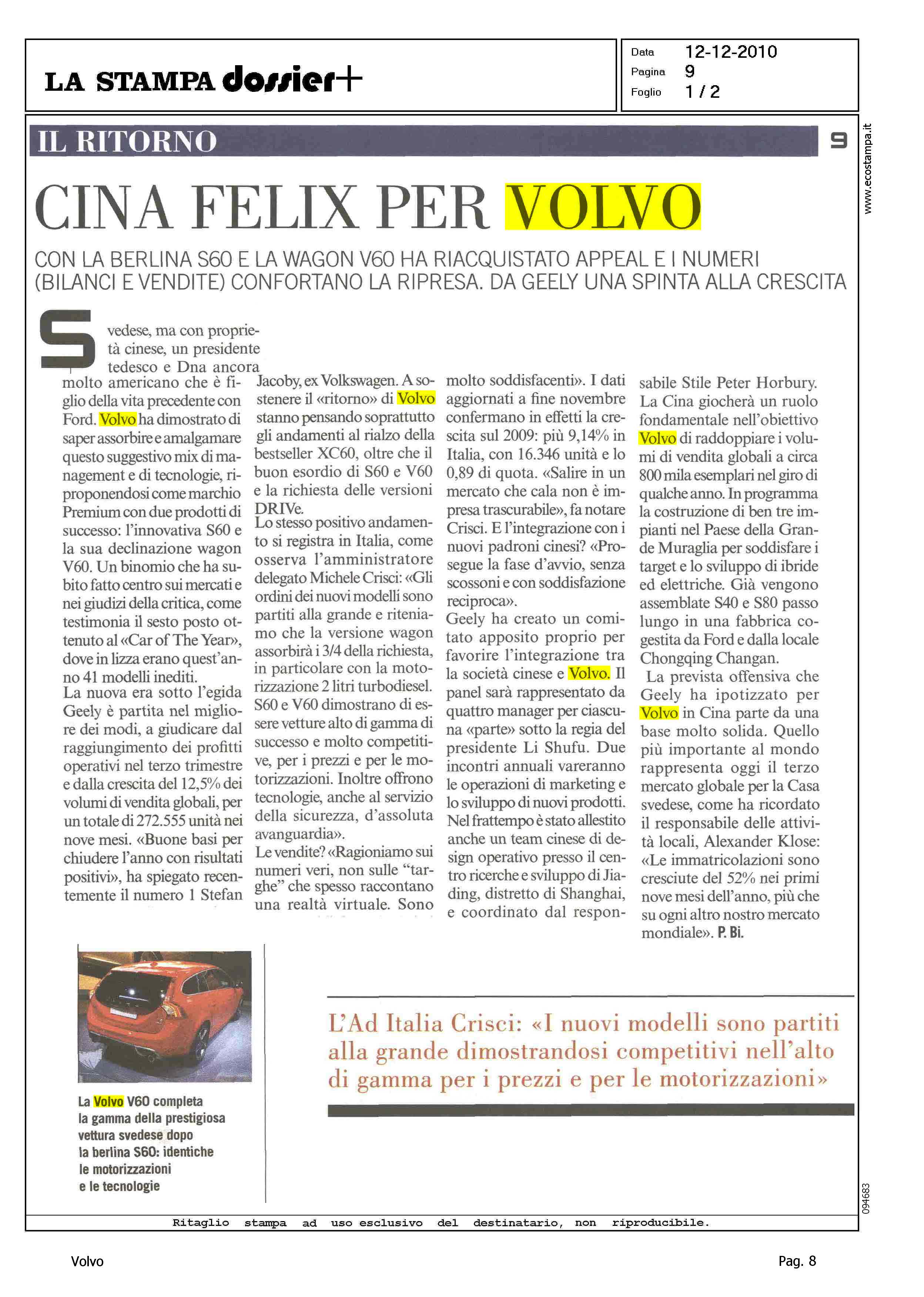 Highlight: MOTOR SHOW - BOLOGNA - VOLVO S60 - VOLVO V60 - OCCHIELLO, DICHIARAZIONE AD CRISCI - VOLVO - GEELY - JACOBY SU TRIMESTRE - CRISCI SU MERCATO ITALIA, GEELY - KLOSE SU ATTIVITA' LOCALI CINA
