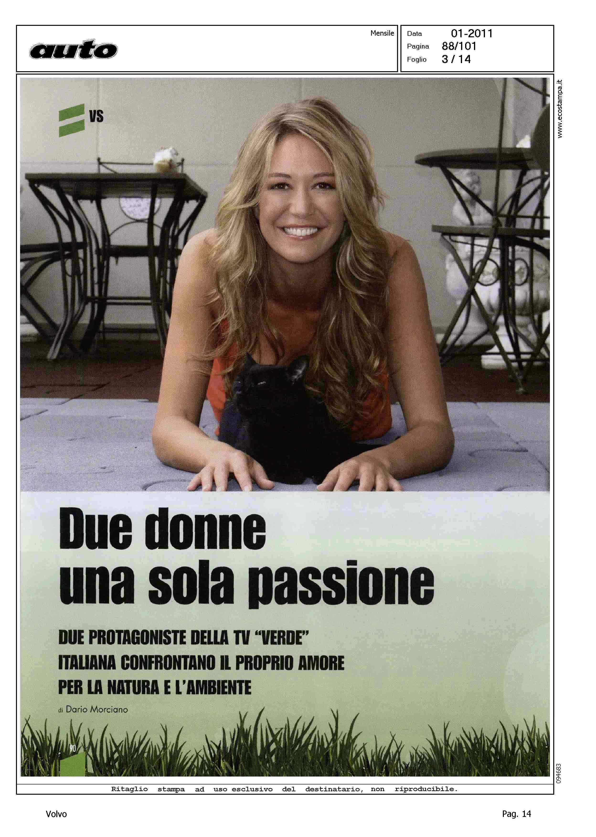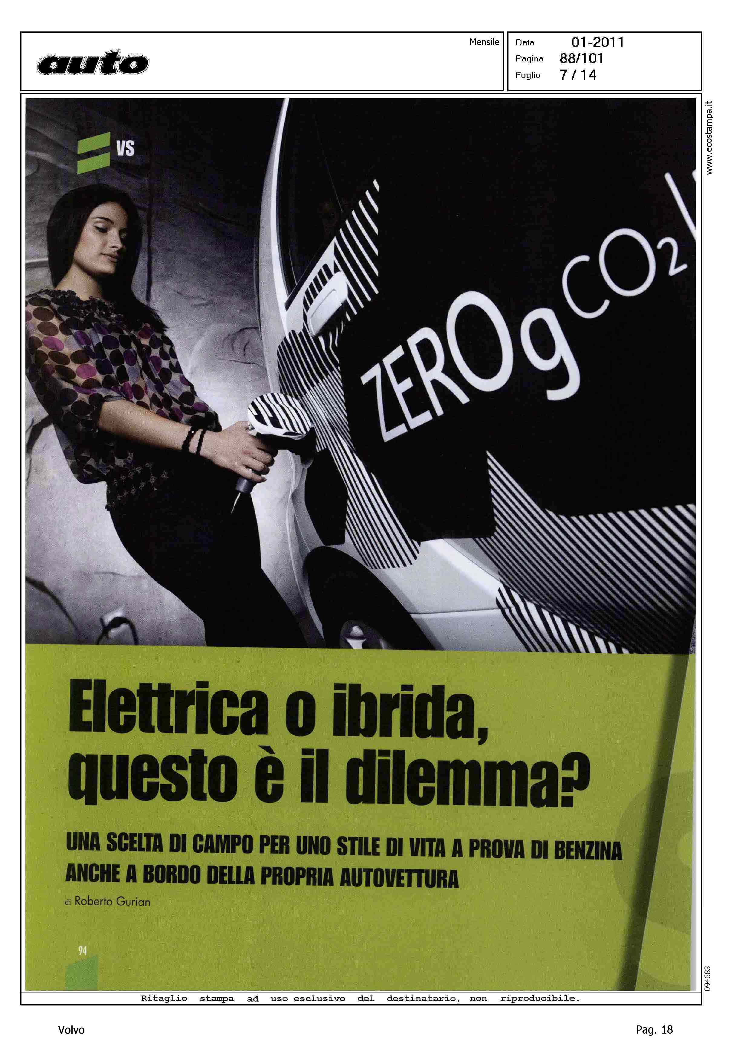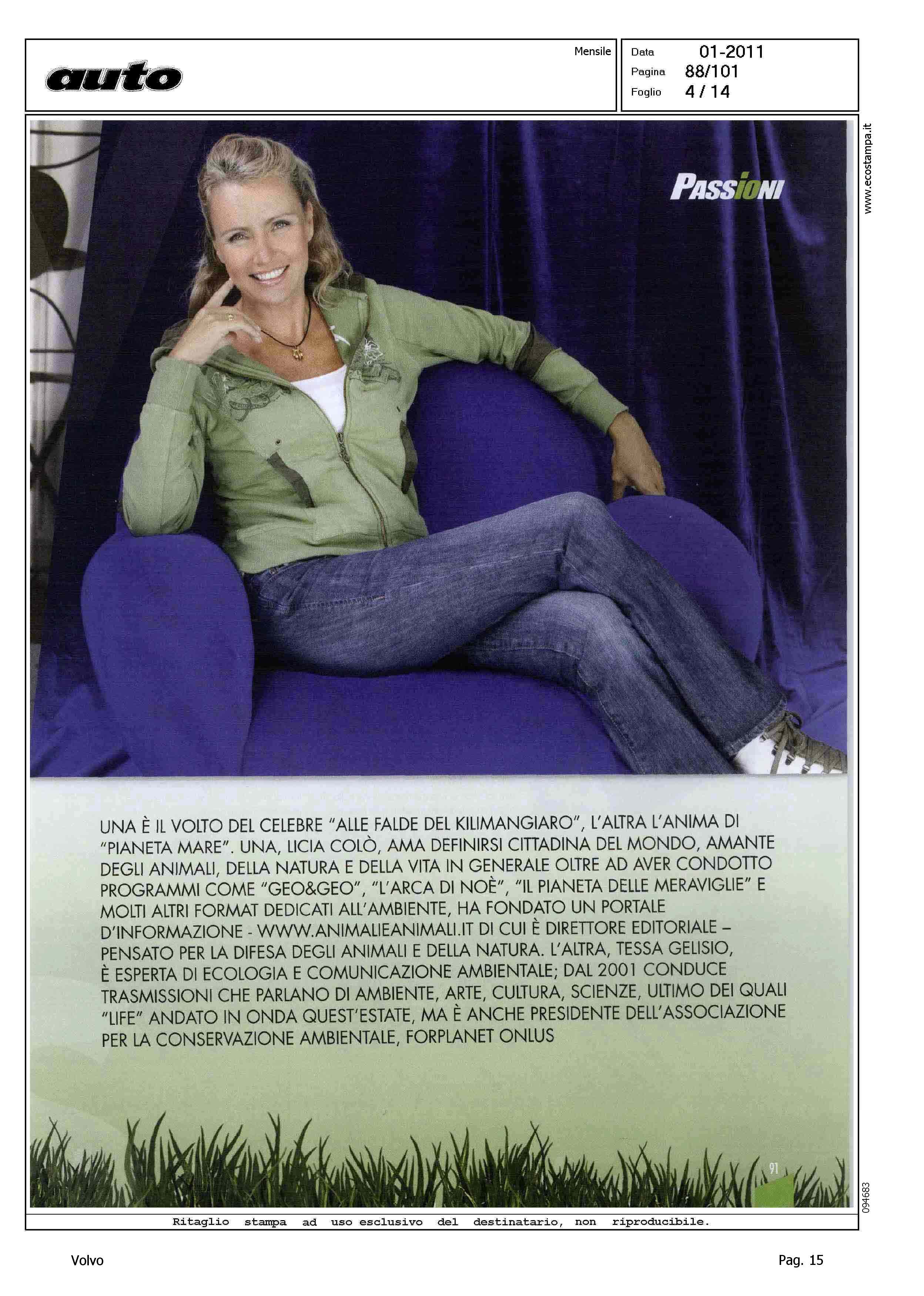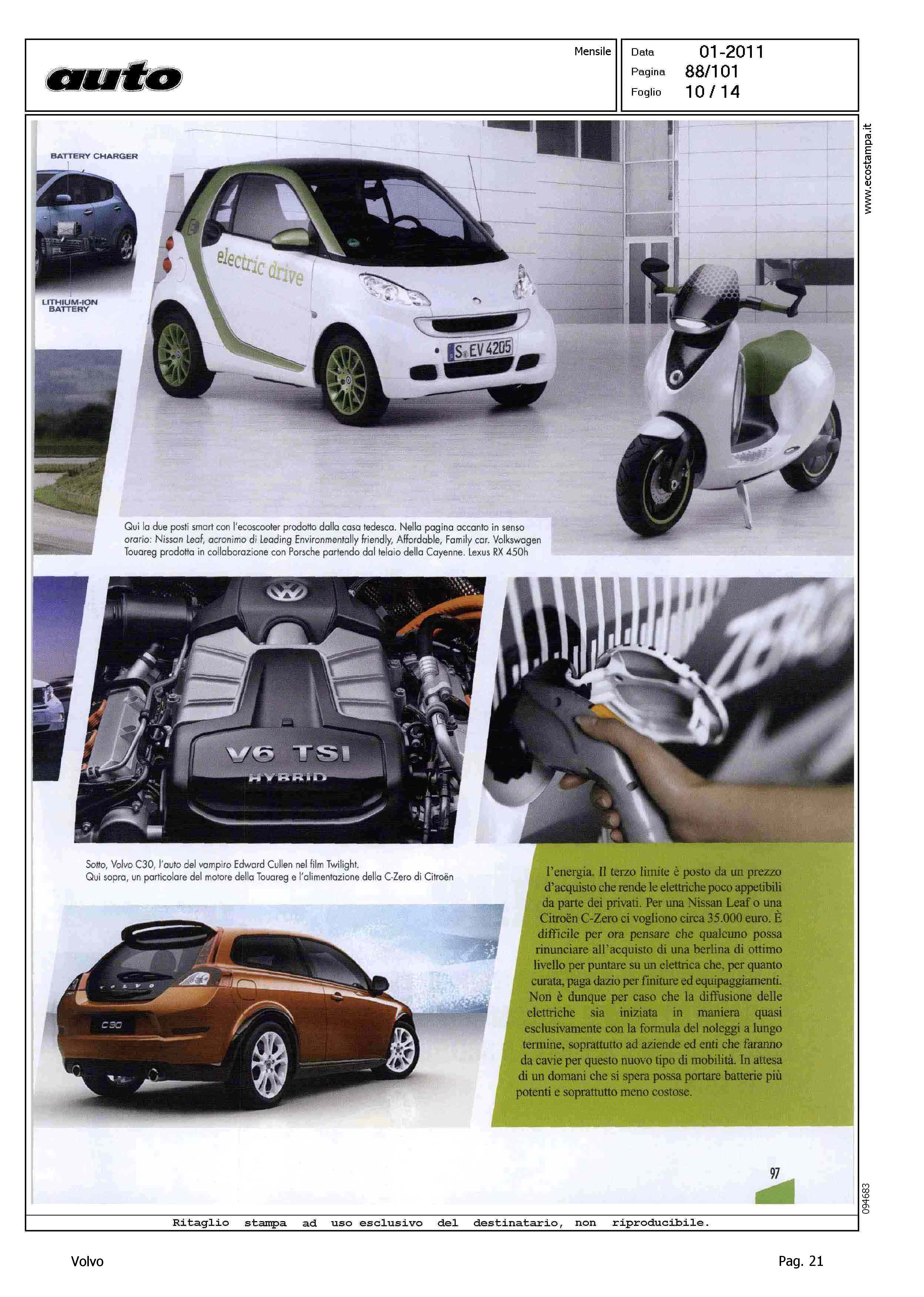Highlight: (USCITA GENNAIO 2011) - LICIA COLO' - TESSA GELISIO - TELEVISIONE - INTERVISTA - AMBIENTE - PROTEZIONE - AUTO ELETTRICA - IBRIDA - SERVIZIO 14 PAGINE, STRUTTURA SU PIU' ARTICOLI, GURIAN SU AUTO ELETTRICA/IBRIDA - VOLVO C30 - CITAZIONE TWILIGHT