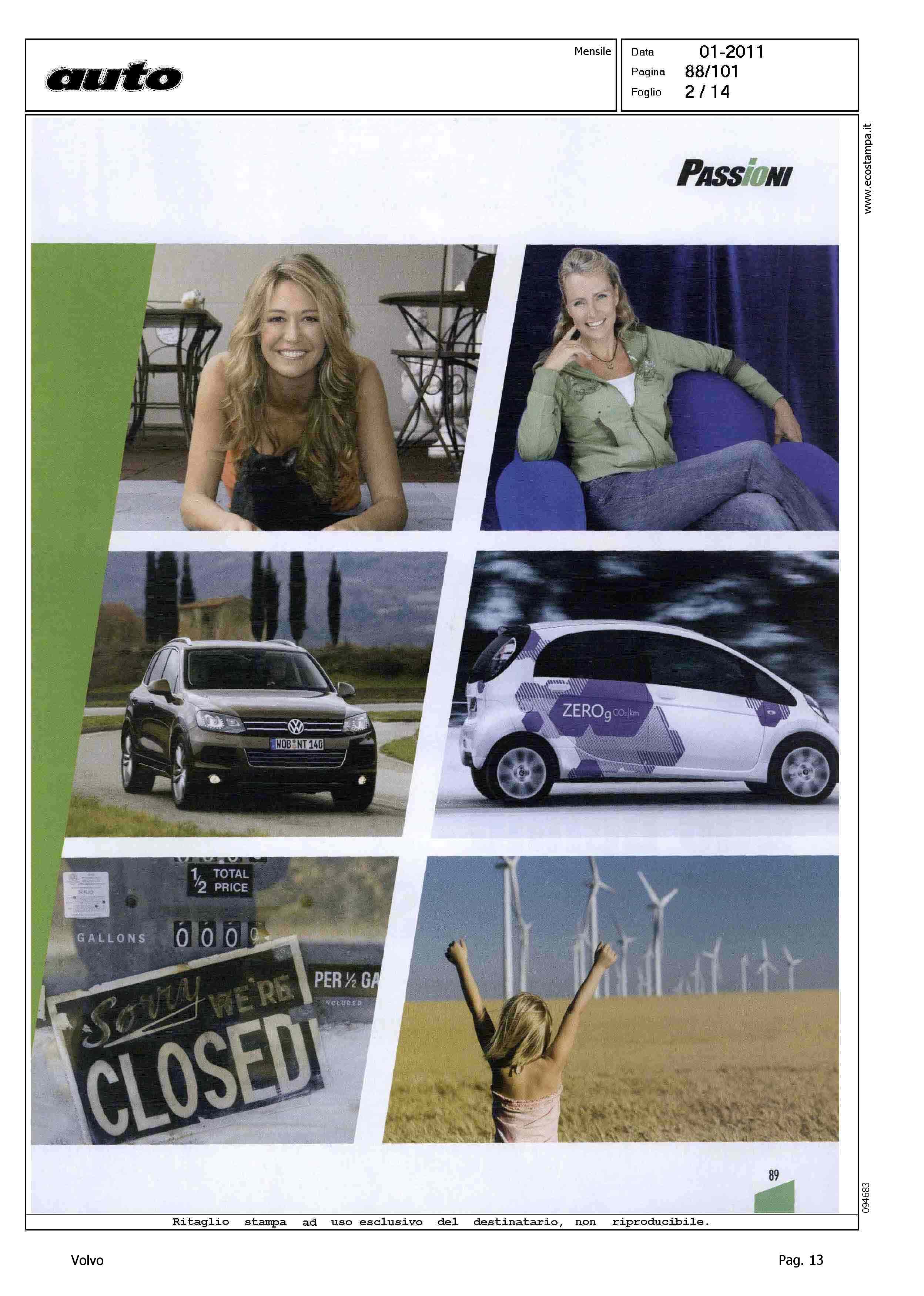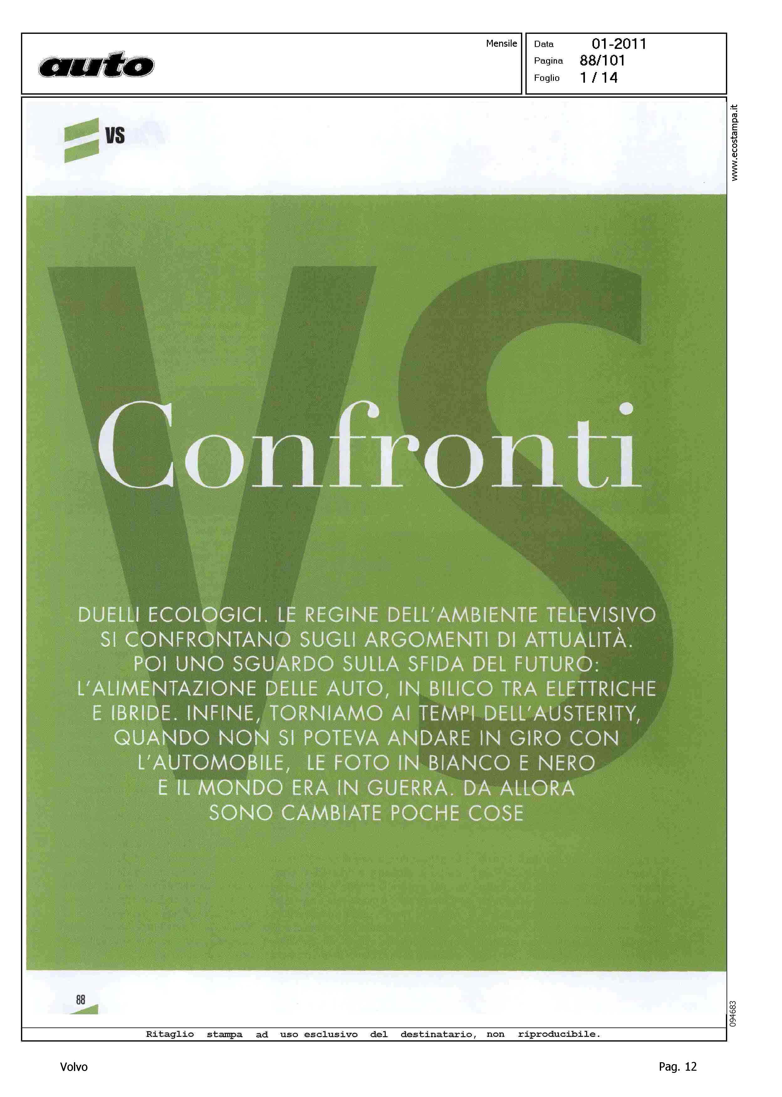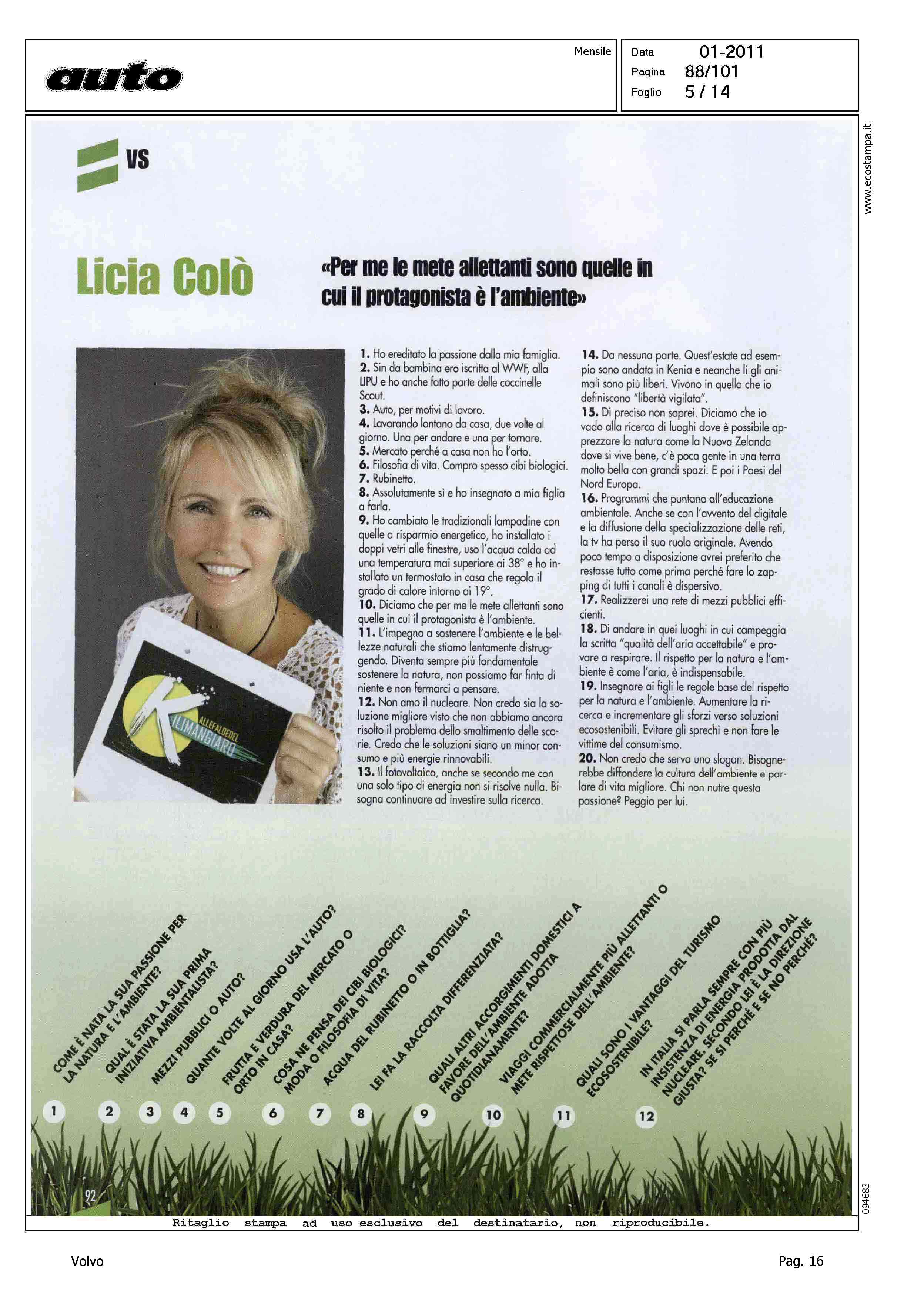 Highlight: (USCITA GENNAIO 2011) - LICIA COLO' - TESSA GELISIO - TELEVISIONE - INTERVISTA - AMBIENTE - PROTEZIONE - AUTO ELETTRICA - IBRIDA - SERVIZIO 14 PAGINE, STRUTTURA SU PIU' ARTICOLI, GURIAN SU AUTO ELETTRICA/IBRIDA - VOLVO C30 - CITAZIONE TWILIGHT