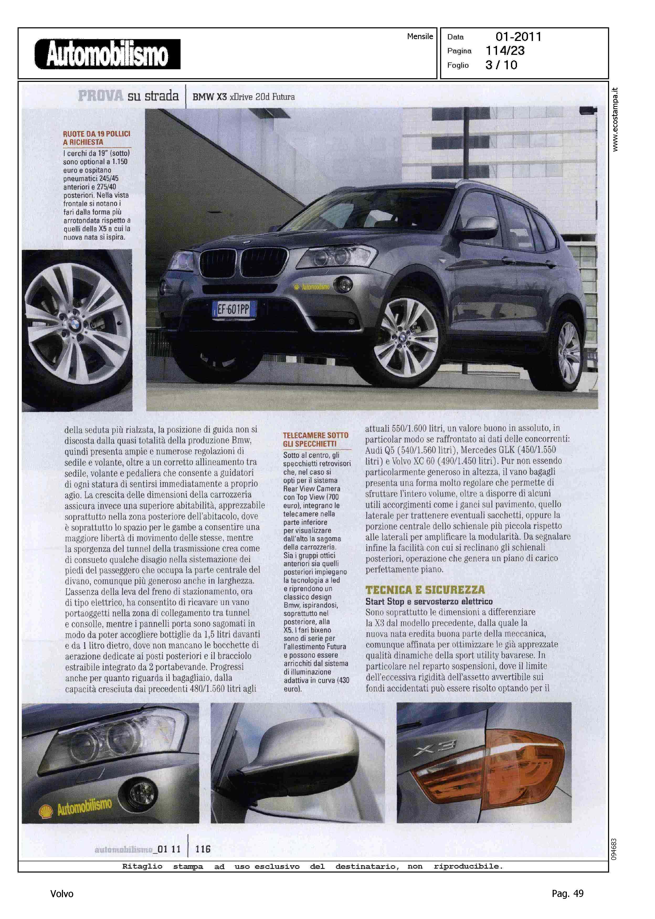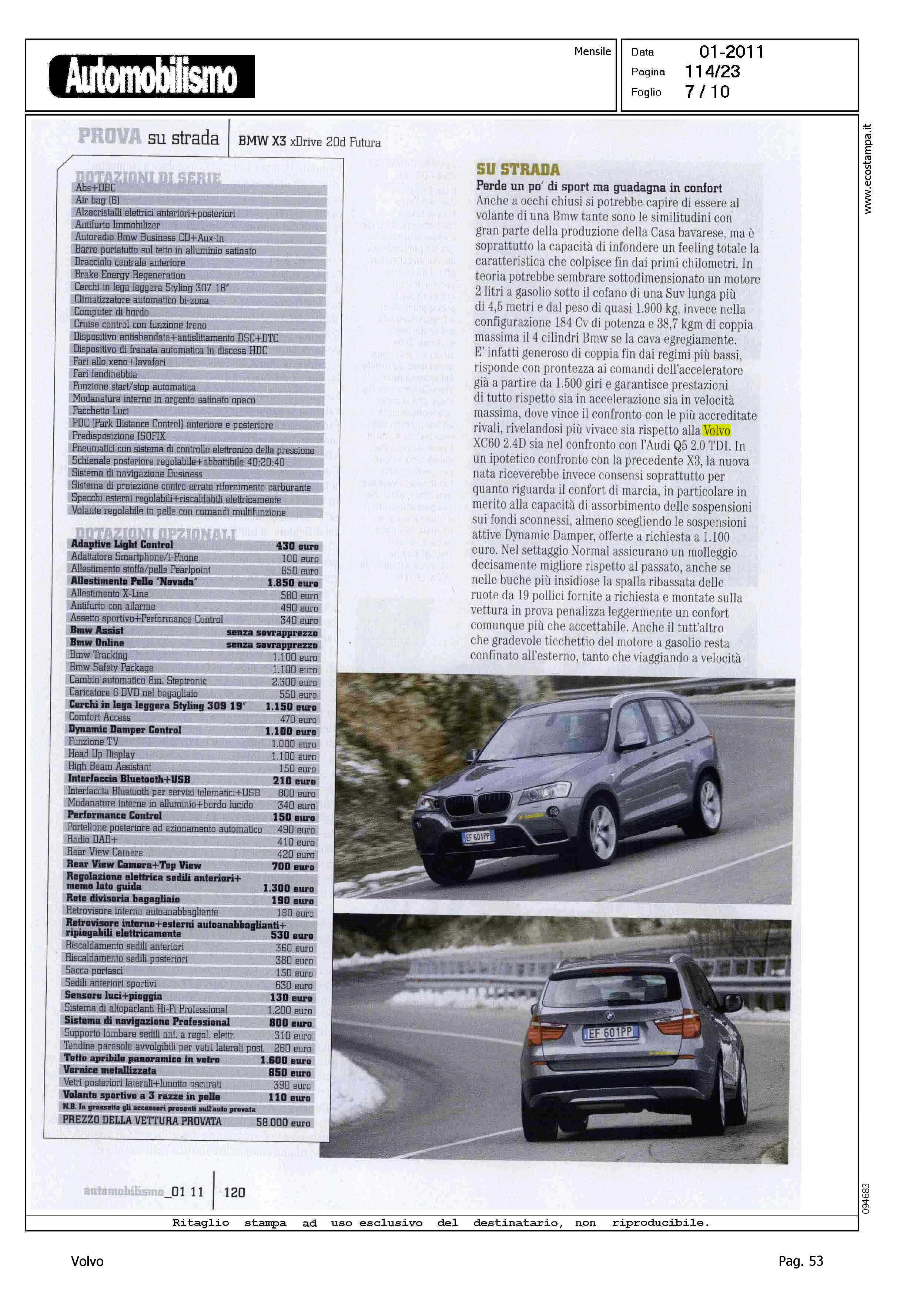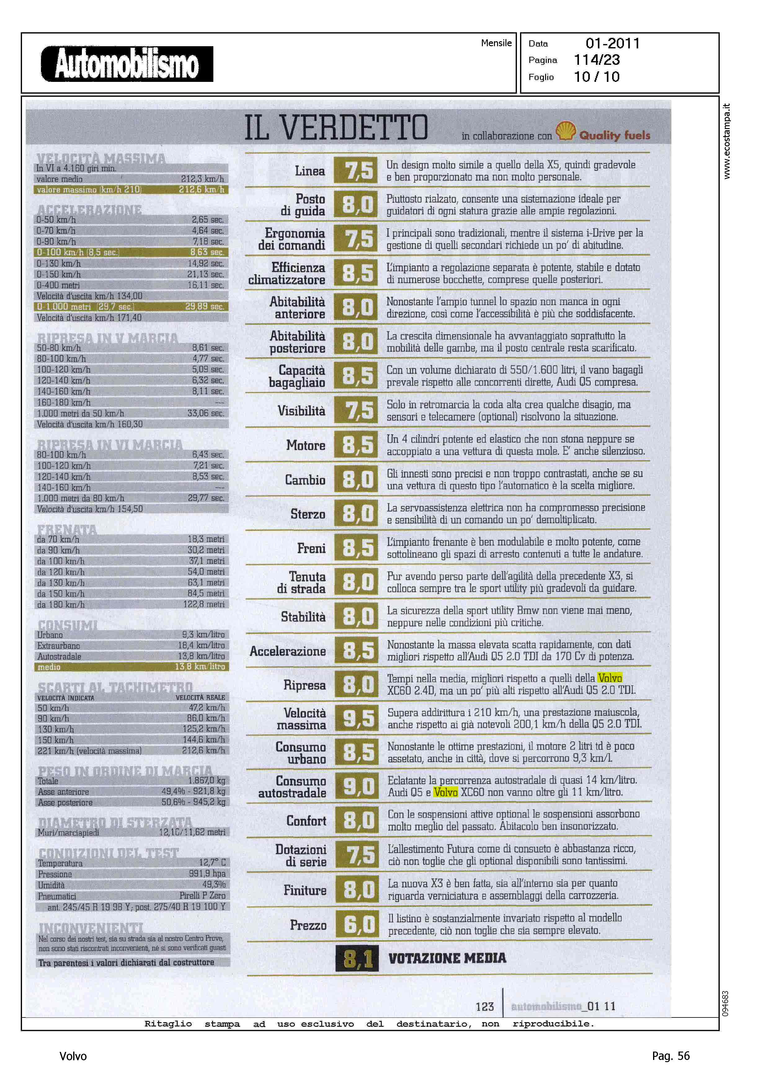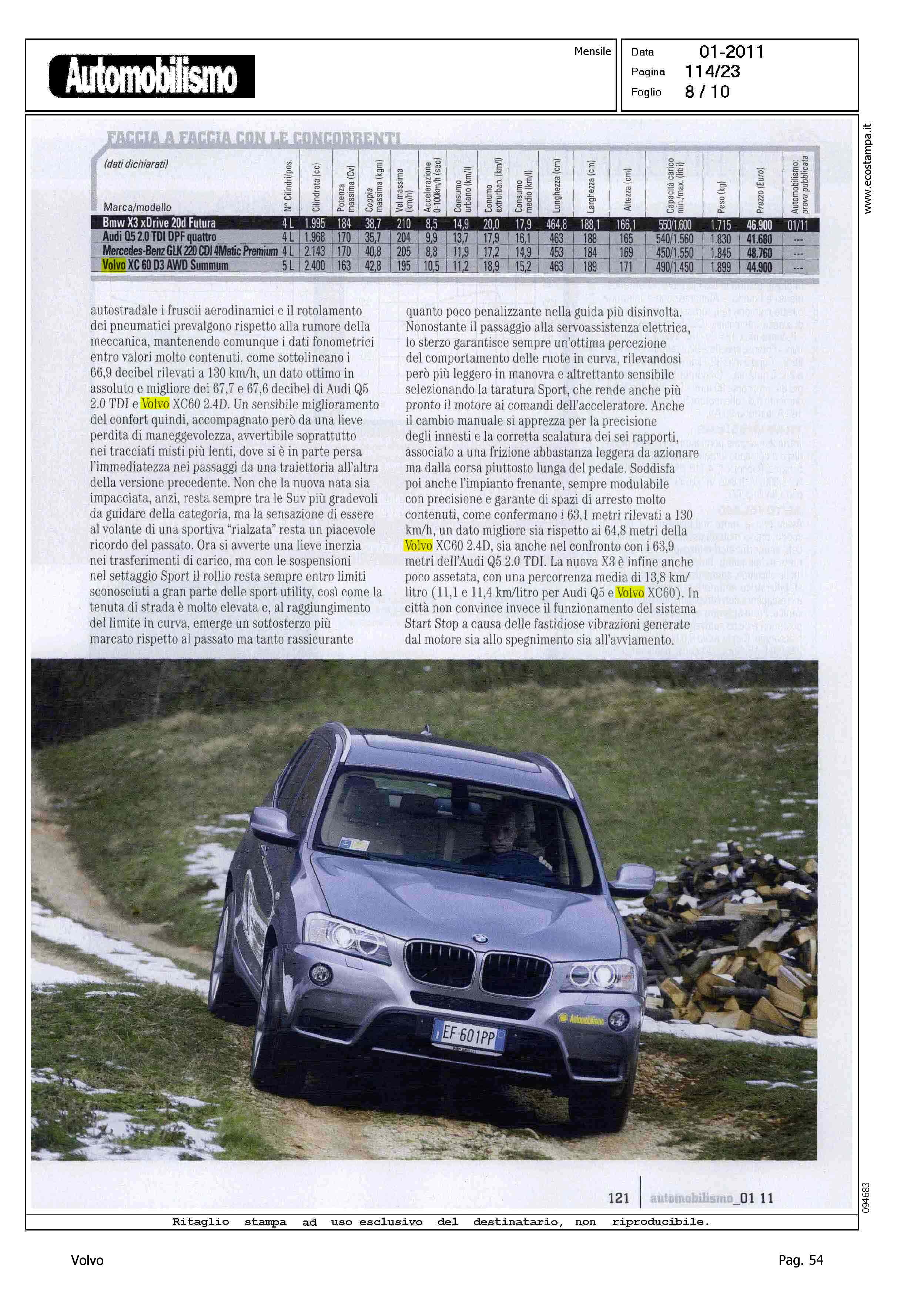 Highlight: VOLVO XC60 2.4D - COMPETITOR - BMW X3 XDRIVE 2.0D FUTURA - BMW E' MIGLIORE DI VOLVO IN: DINAMICA DI MARCIA, LIVELLO DECIBEL A 130 KM/H, SPAZI DI ARRESTO A 130 KM/H, PERCORRENZA MEDIA (IN CORPO DEL TESTO)