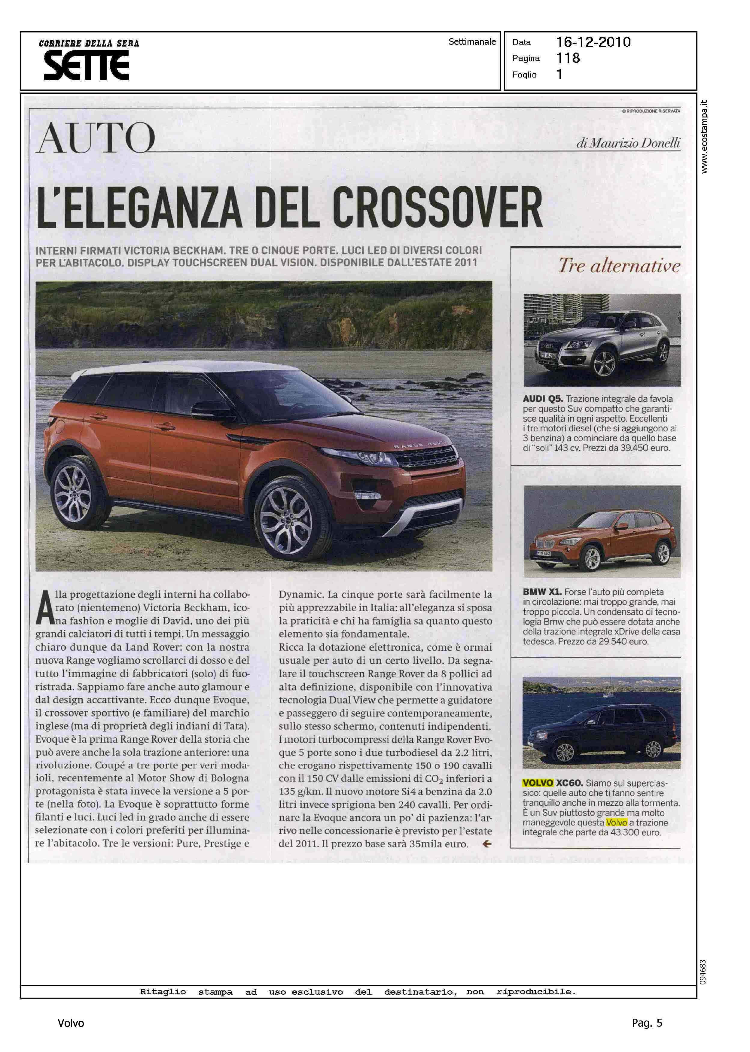 Author: DONELLI, MAURIZIOLine: XC60 Model: Subject: - Title: AUTO - L'ELEGANZA DEL CROSSOVERHighlight: VOLVO XC60 - DESIGN - DINAMICA DI MARCIA - PREZZO