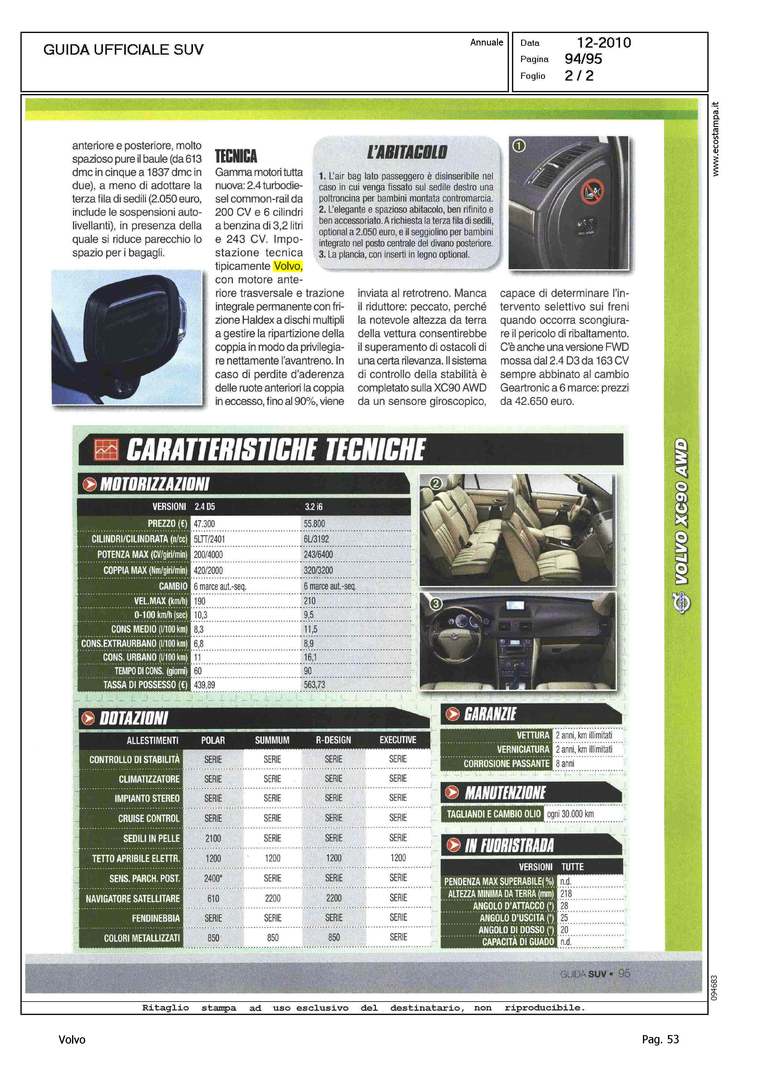 Highlight: SCHEDA PRODOTTO IN DOPPIA PAGINA - MODELLO VOLVO - PREZZO - DATI TECNICI, TABELLE MOTORI, DOTAZIONI, GARANZIE, MANUTENZIONE, IN FUORISTRADA - DESCRIZIONE PRODOTTO - PREGI, QUALITA' ELEVATA, ABITACOLO E BAULE AMPI, POLAR: PREZZO CONVENIENTE - DIFETTI, D5: NON MOLTO POTENTE, EXECUTIVE: TROPPO CARA, POCO ADATTA AL FUORISTRADA
