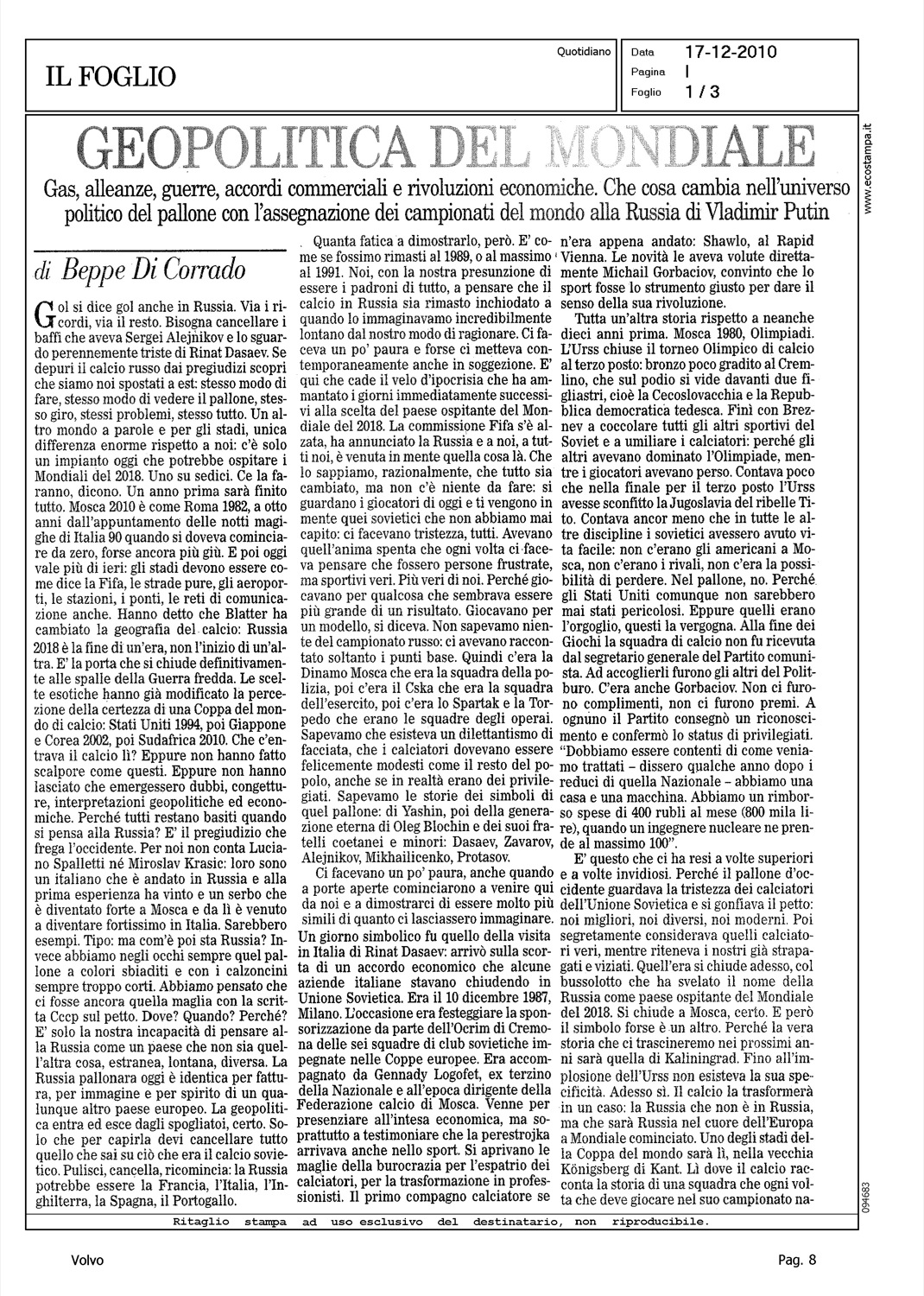 Author: DI CORRADO, BEPPELine: Corporate Model: Corporate Subject: - Title: GEOPOLITICA DEL MONDIALEHighlight: MONDIALI CALCIO 2018 - RUSSIA - CITAZIONE