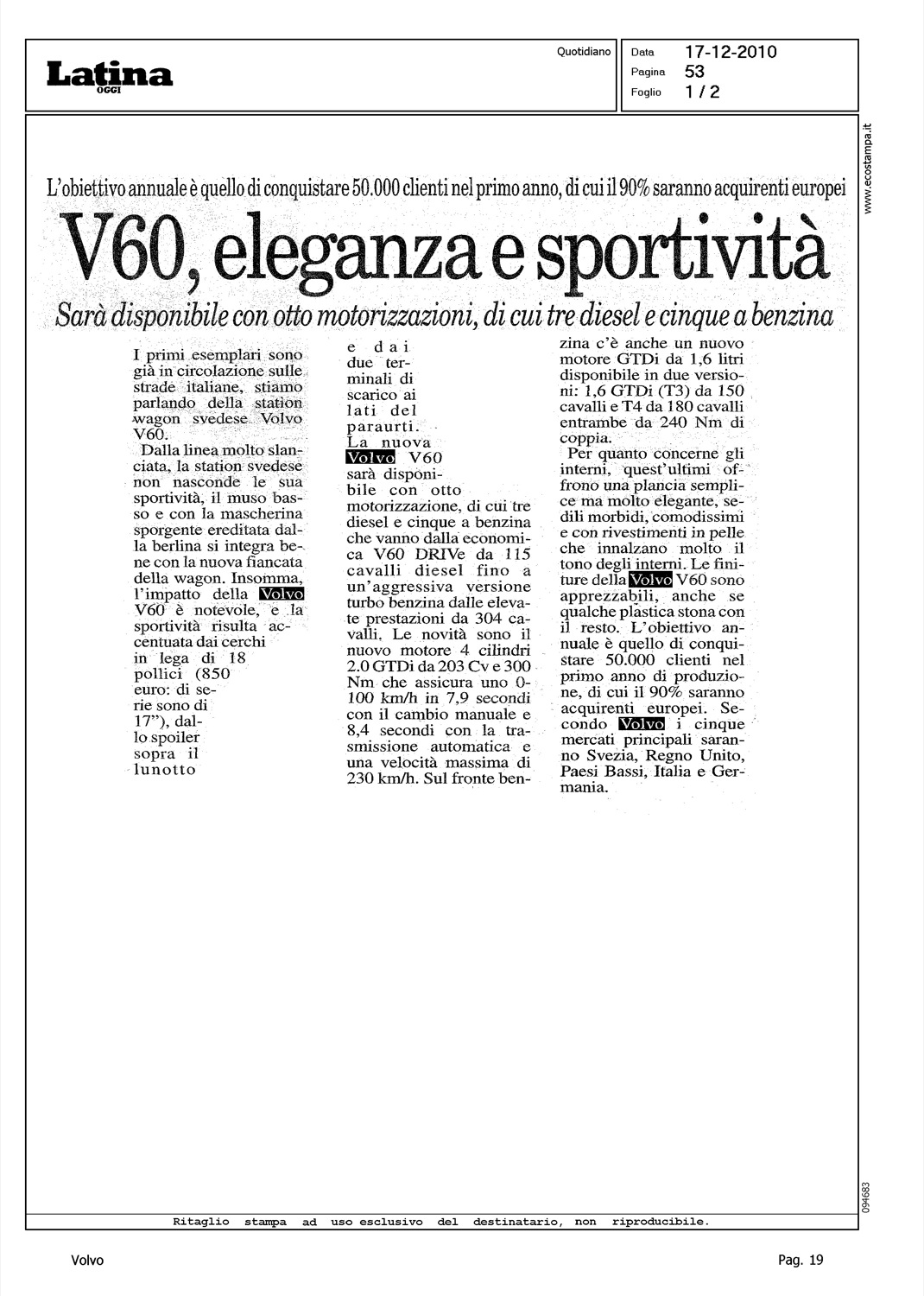 Author: Line: Corporate Model: Corporate Subject: - Title: V60, ELEGANZA E SPORTIVITA'Highlight: DESIGN - MOTORI - PRESTAZIONI - T3 - T4 - GTDI - ABITACOLO - INTERNI - MERCATO - OBIETTIVI - COMMERCIALIZZAZIONE
