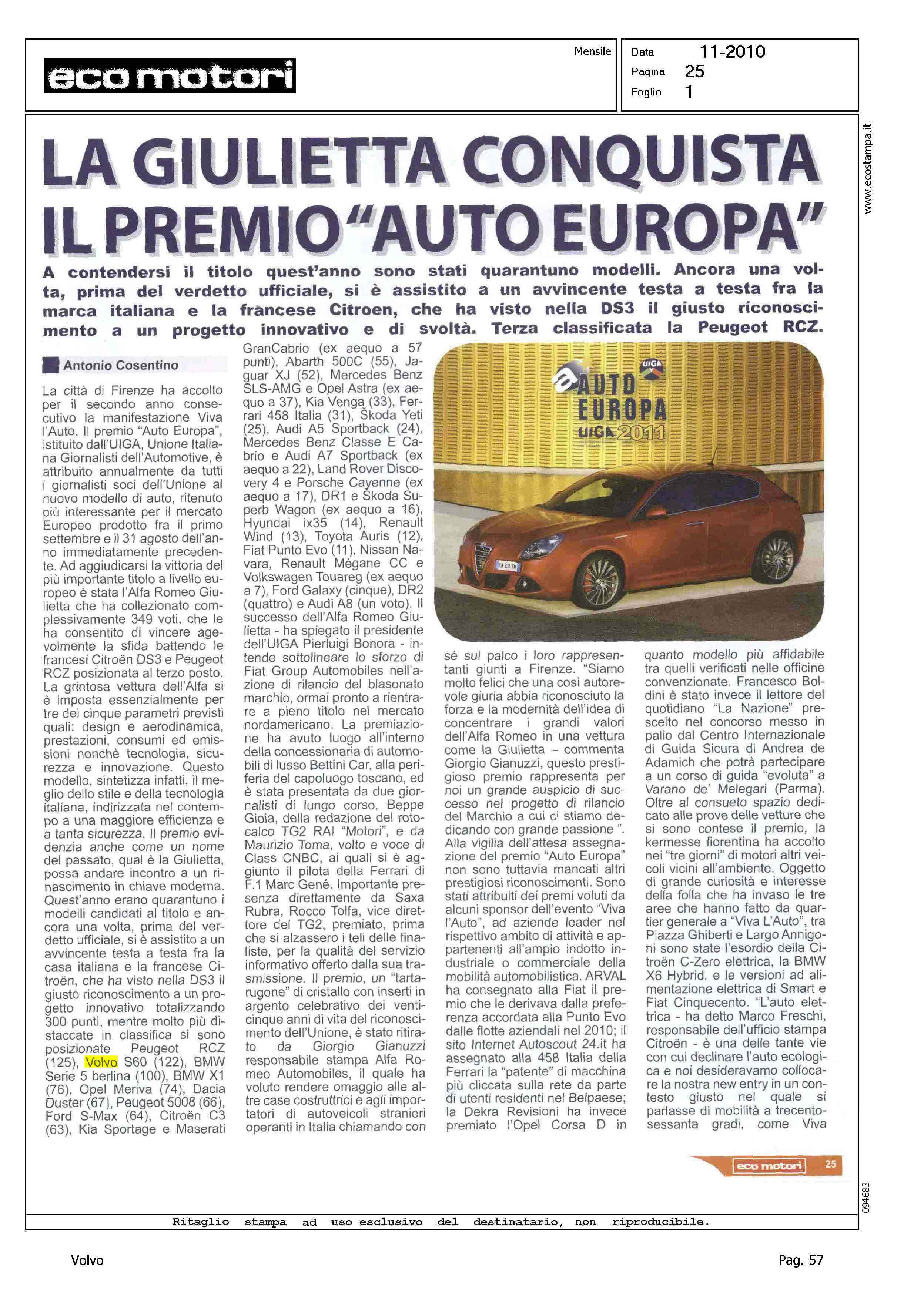 Author: Line: Corporate Model: Corporate Subject: - Title: LA GIULIETTA CONQUISTA IL PREMIO ''AUTO EUROPA''Highlight: UIGA - AUTO EUROPA 2011