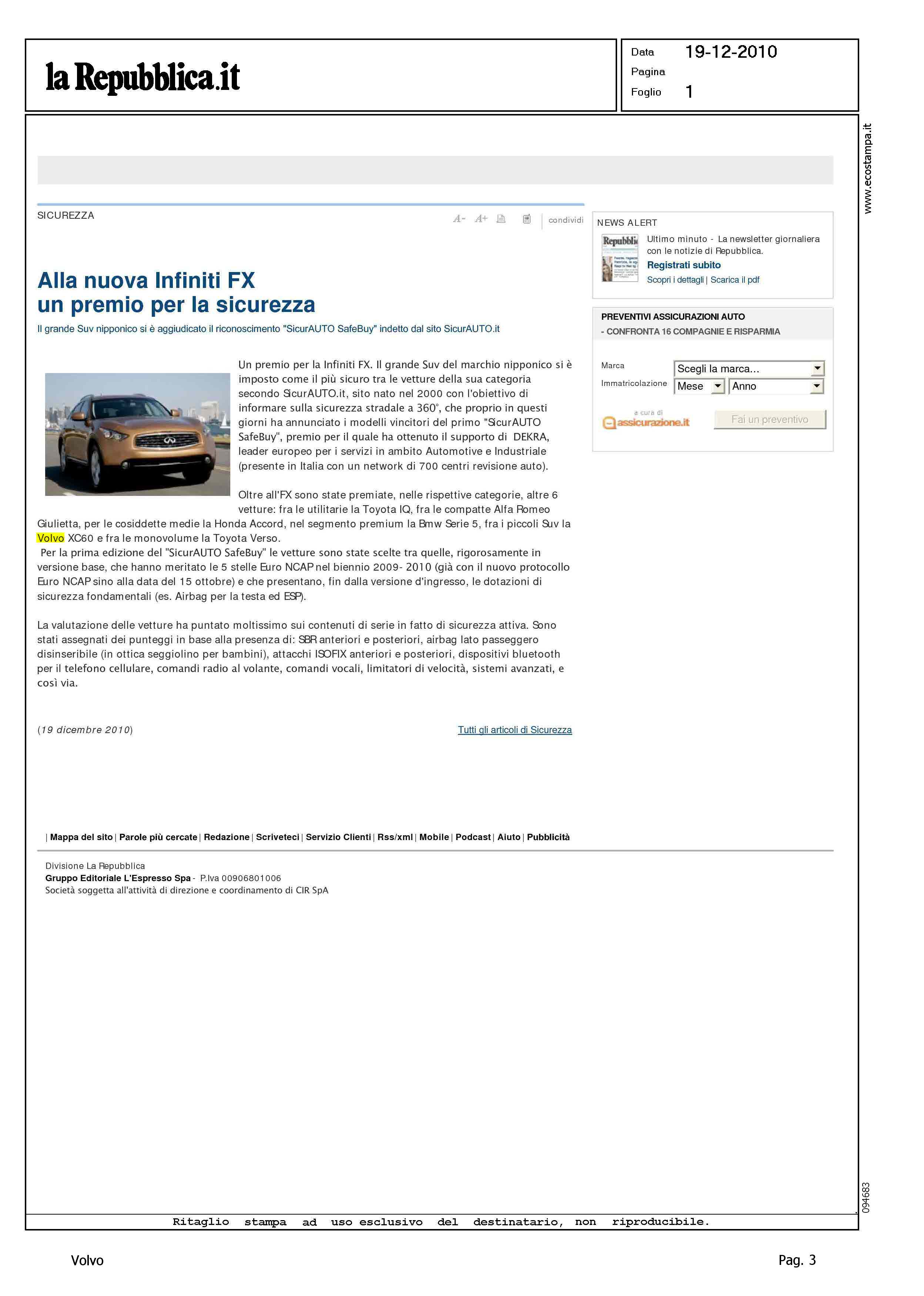 Author: Line: XC60 Model: - Subject: - Title: ALLA NUOVA INFINITI FX UN PREMIO PER LA SICUREZZAHighlight: SICURAUTO DEKRA - EURONCAP - VOLVO XC60 - SICUREZZA