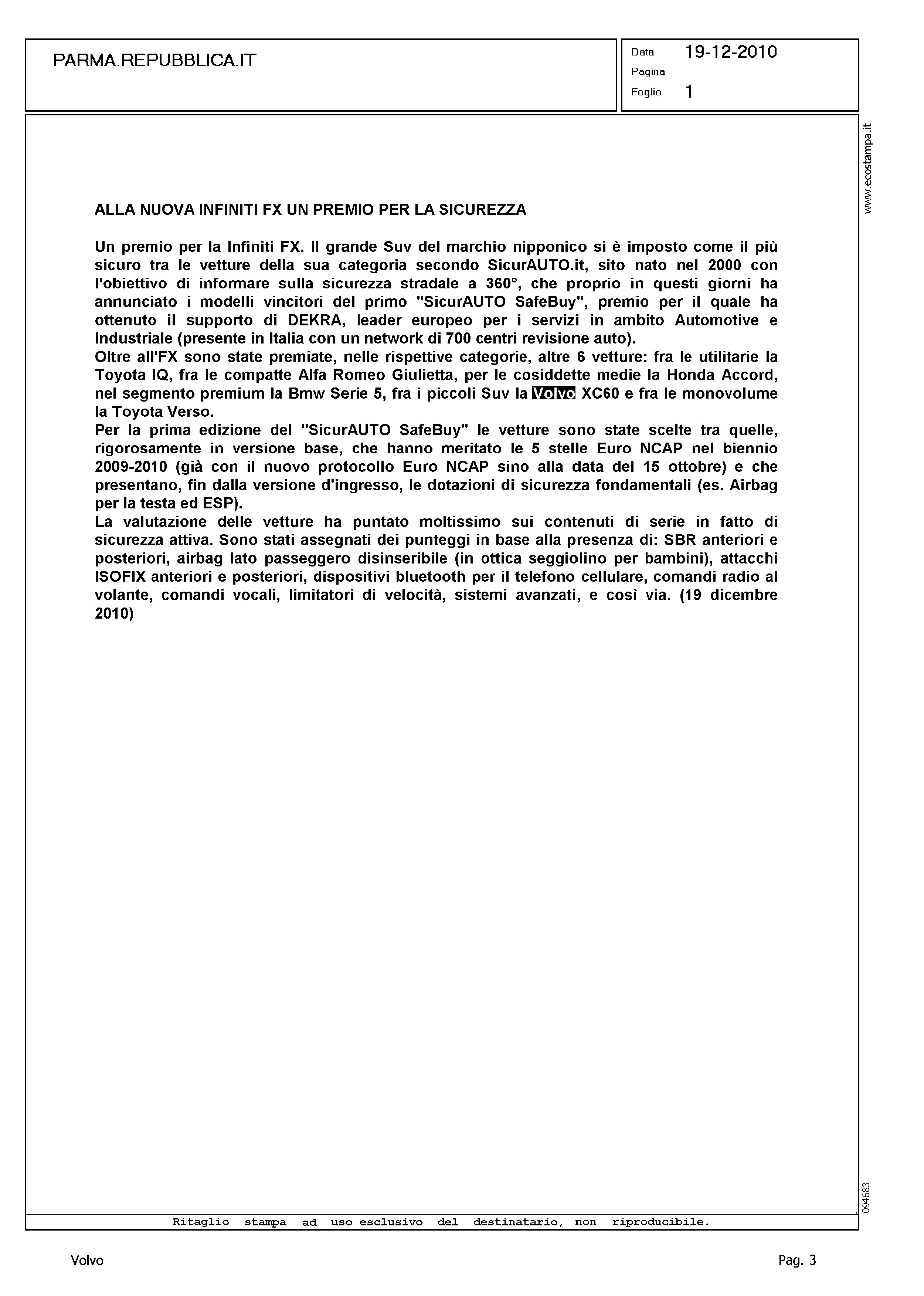 Author: Line: XC60 Model: Subject: - Title: ALLA NUOVA INFINITI FX UN PREMIO PER LA SICUREZZAHighlight: (EDIZIONE PARMA) - SICURAUTO DEKRA - EURONCAP - VOLVO XC60 - SICUREZZA
