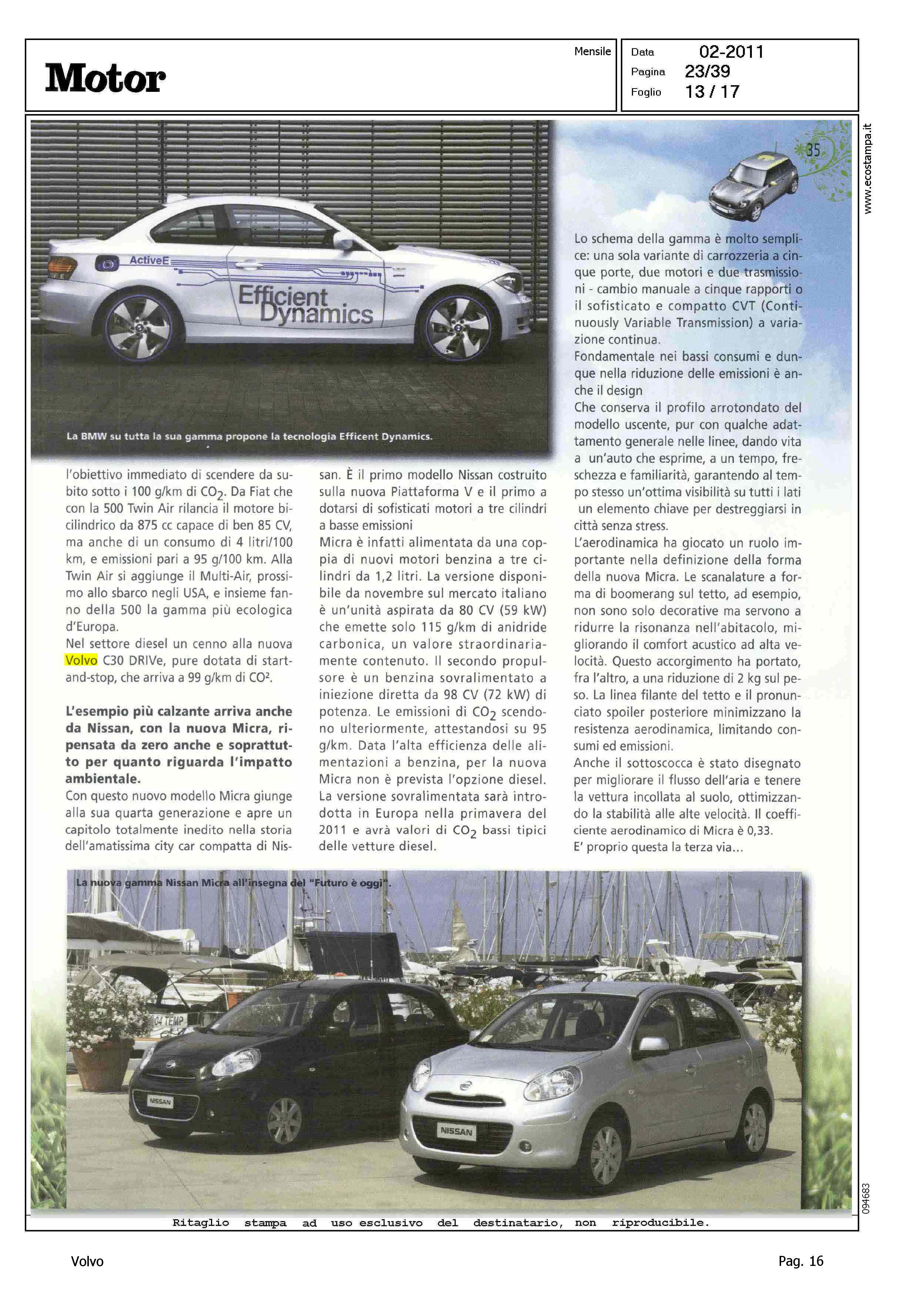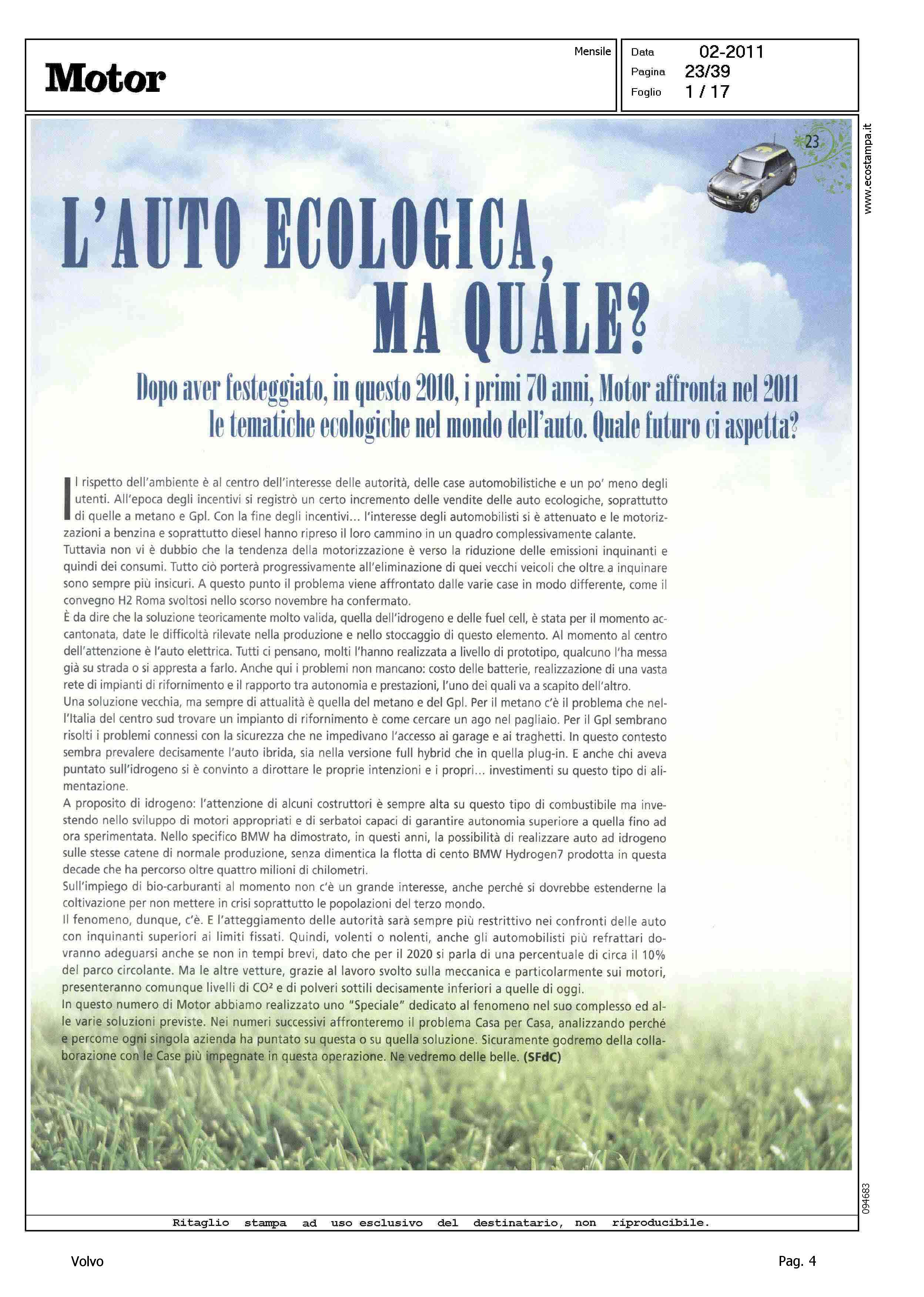 Author: FAVIA DEL CORE, SERGIOLine: Corporate Model: Volvo C30 Subject: - Title: L'AUTO ECOLOGICA, MA QUALE?Highlight: VOLVO C30 DRIVE - EMISSIONI