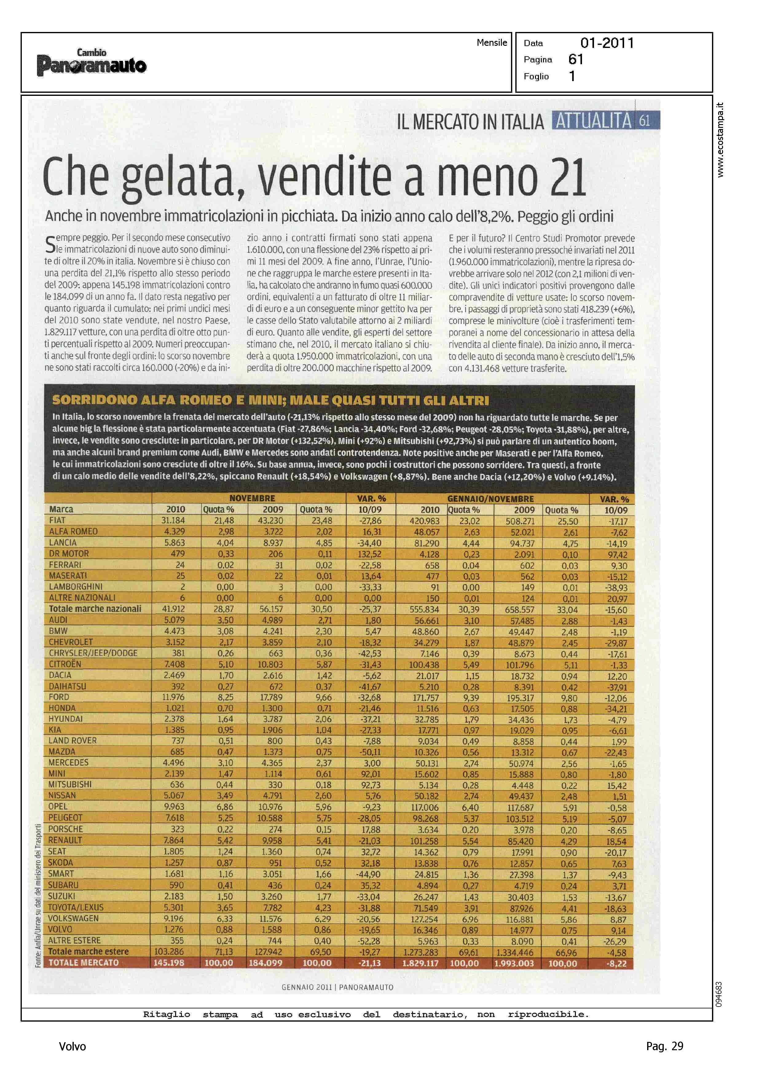 Author: Line: Corporate Model: Corporate Subject: - Title: CHE GELATA, VENDITE A MENO 21Highlight: MERCATO ITALIA - TABELLE - POSIZIONE VOLVO