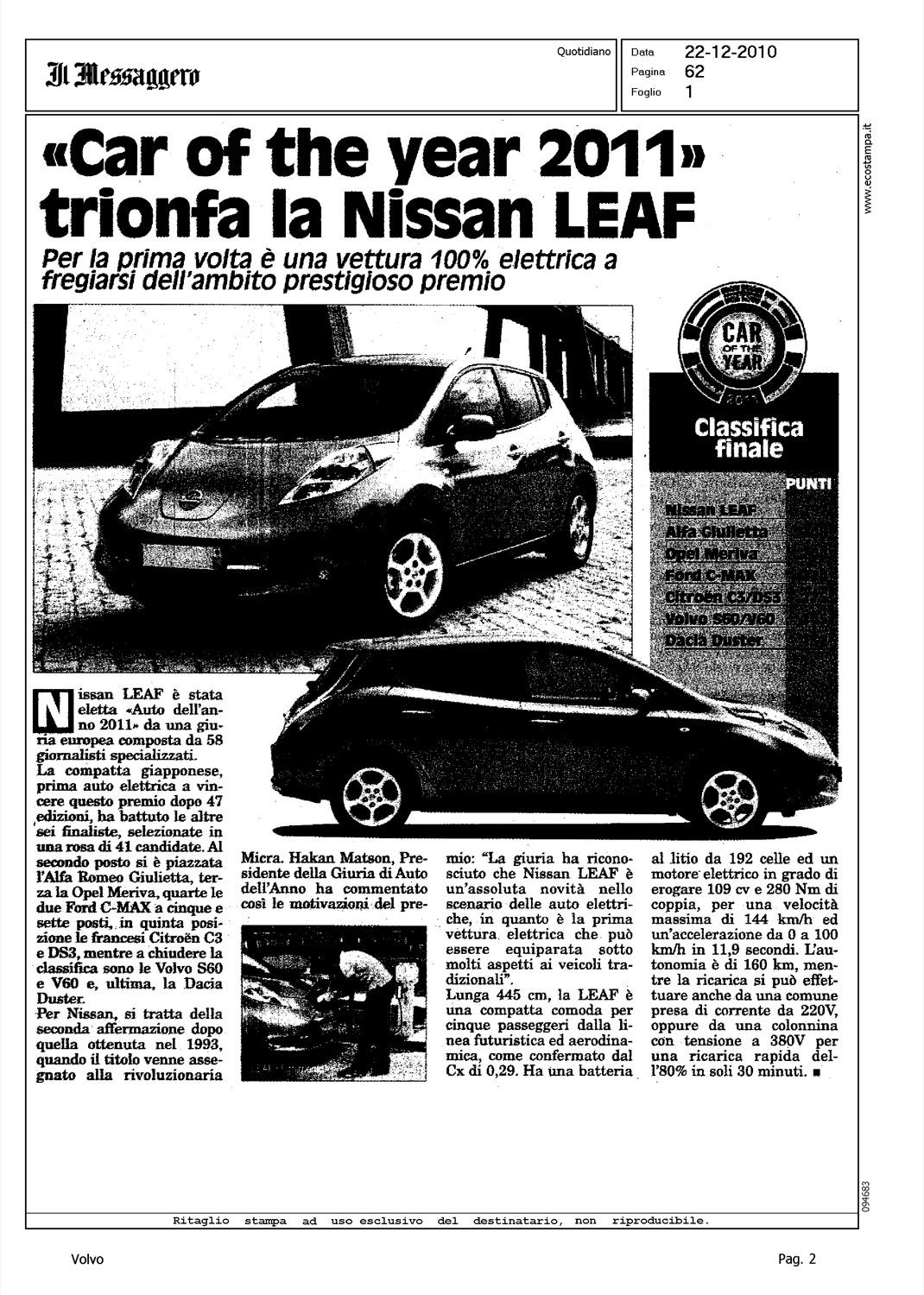 Author: Line: Corporate Model: Corporate Subject: - Title: ''CAR OF THE YEAR 2011'' TRIONFA LA NISSAN LEAFHighlight: ELETTA L'AUTO DELL'ANNO 2011 - VOLVO S60/V60