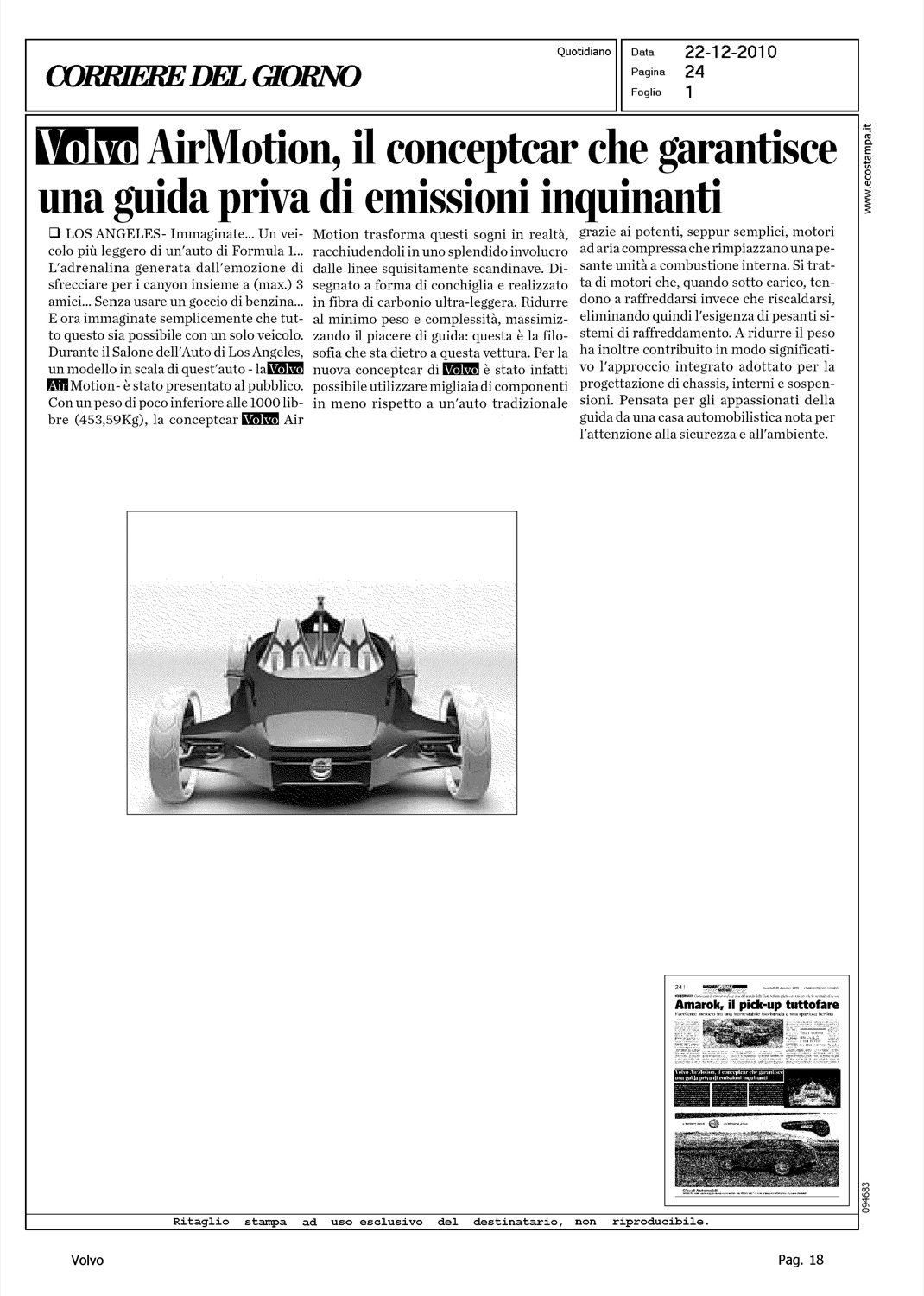 Author: Line: Corporate Model: Corporate Subject: - Title: VOLVO AIR MOTION, IL CONCEPTCAR CHE GARANTISCE UNA GUIDA PRIVA DI EMISSIONI INQUINANTIHighlight: AIR MOTION - DESIGN CHALLENGE 2010 - DESIGN - SPECIFICHE TECNICHE