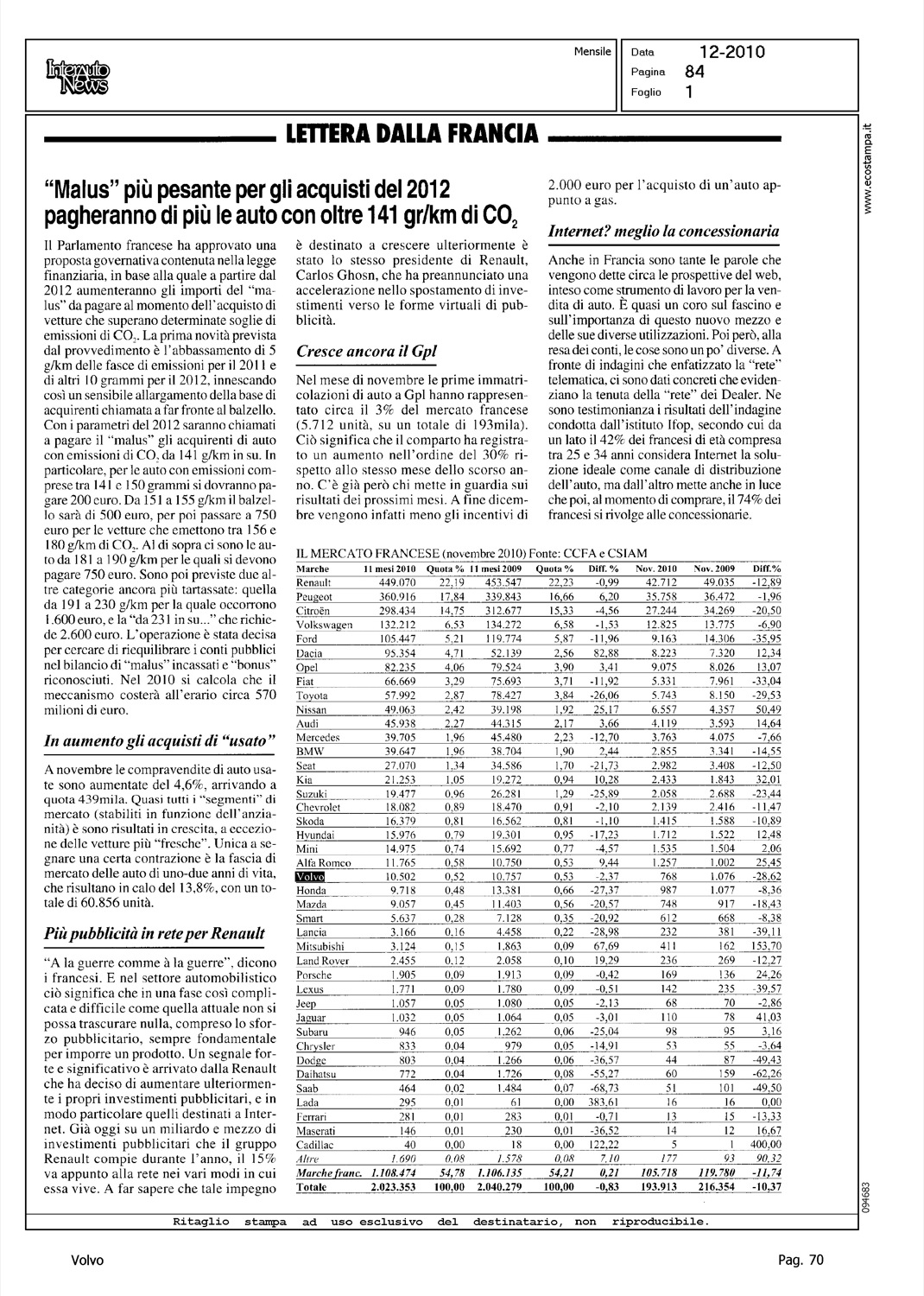 Author: Line: Corporate Model: Corporate Subject: - Title: ''MALUS'' PIU' PESANTE PER GLI ACQUISTI DEL 2012 PAGHERANNO DI PIU' LE AUTO CON OLTRE 141 GR/KM DI CO2Highlight: MERCATO FRANCIA - TABELLE - POSIZIONE VOLVO