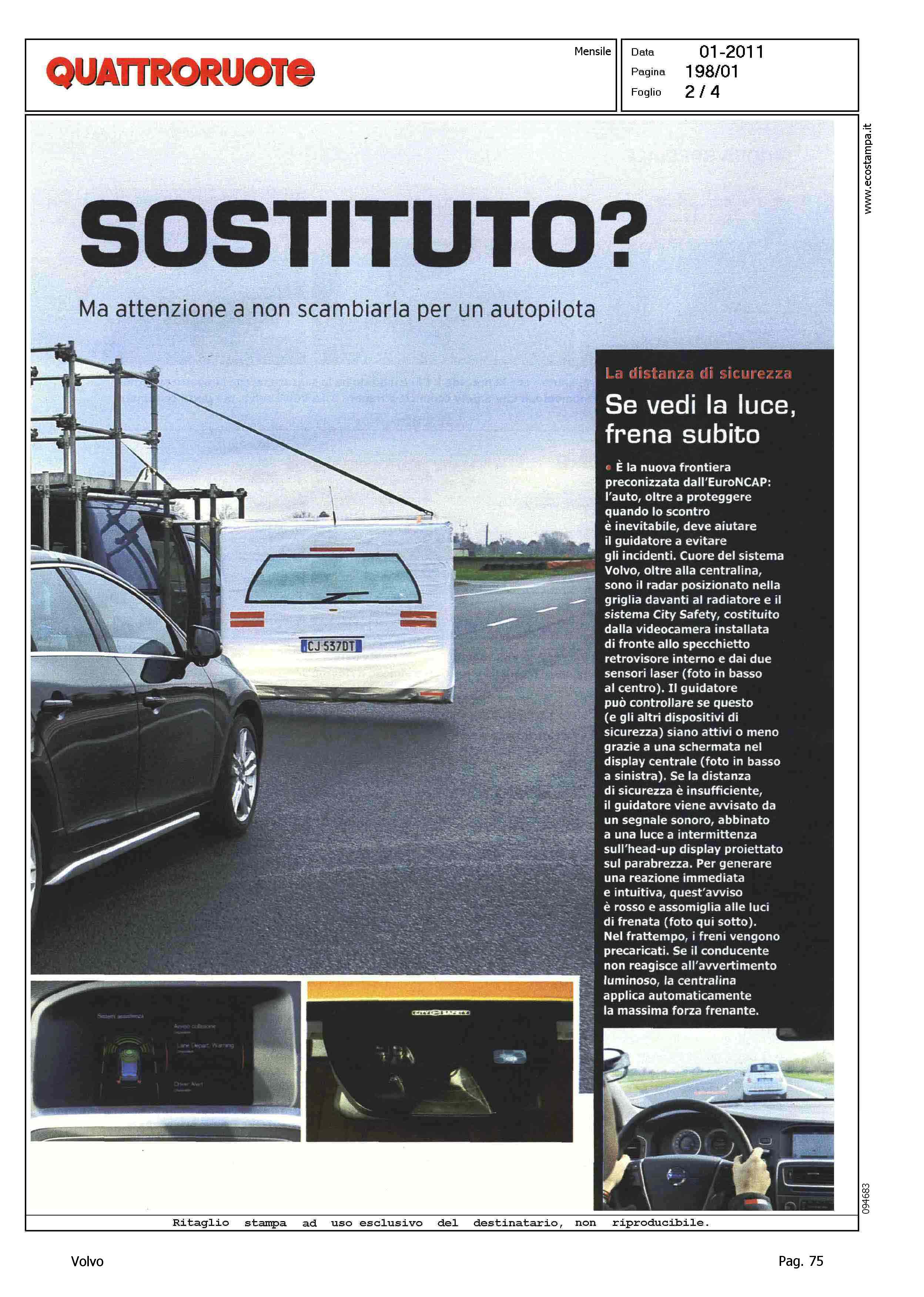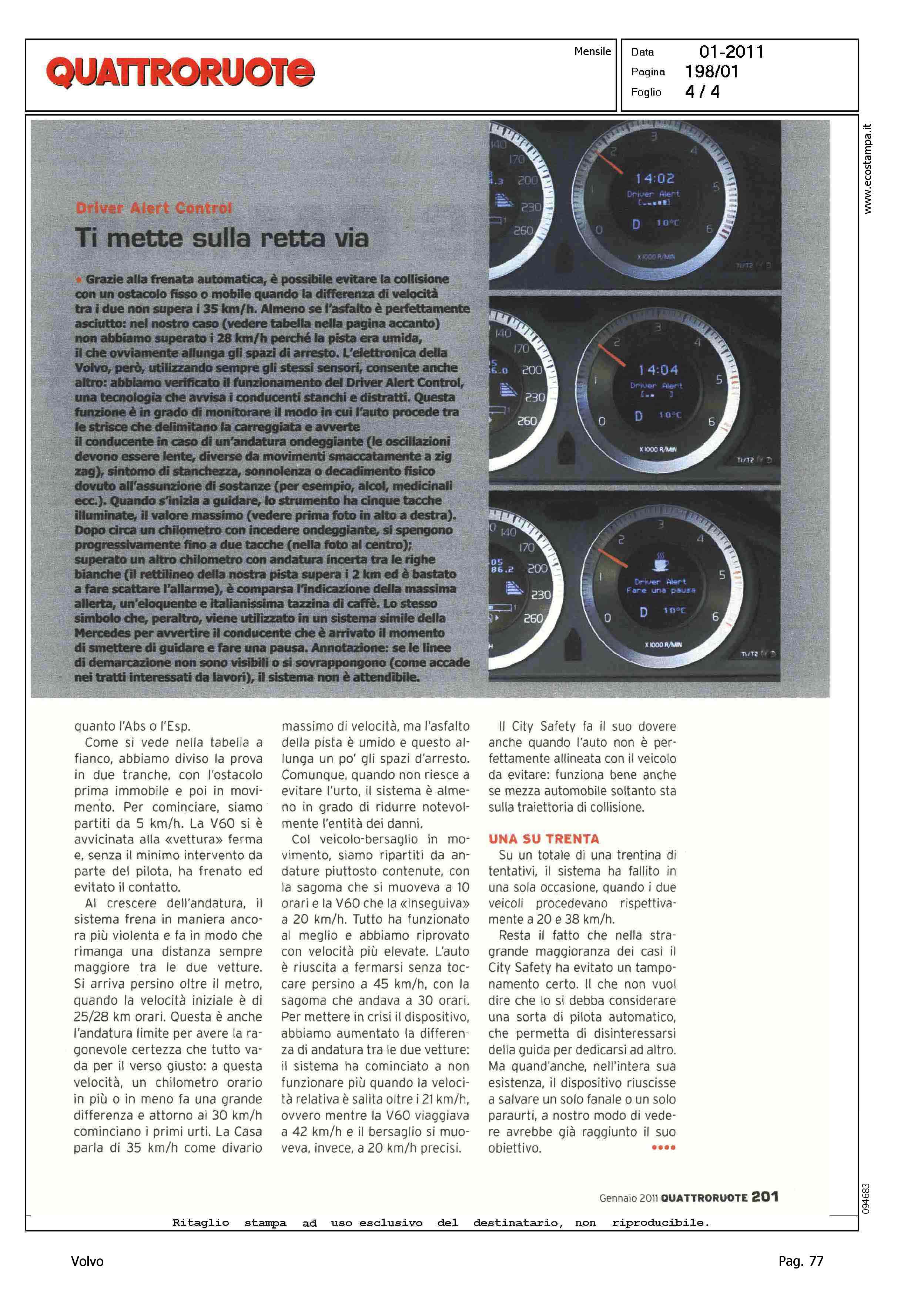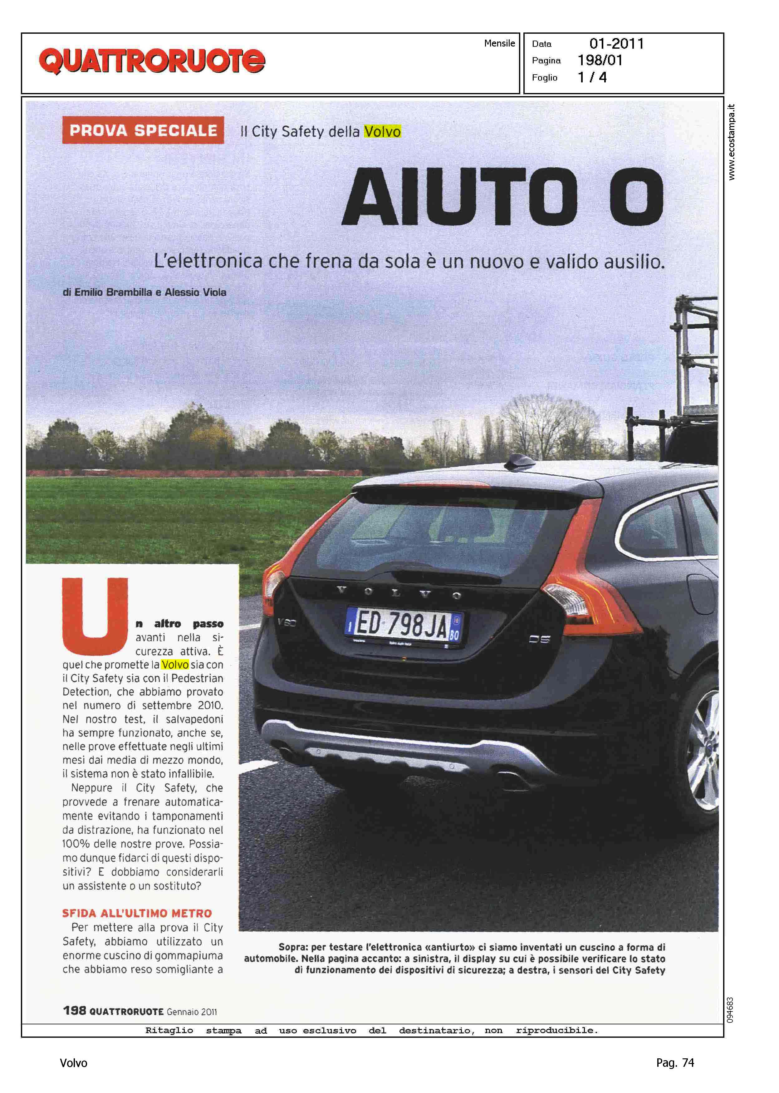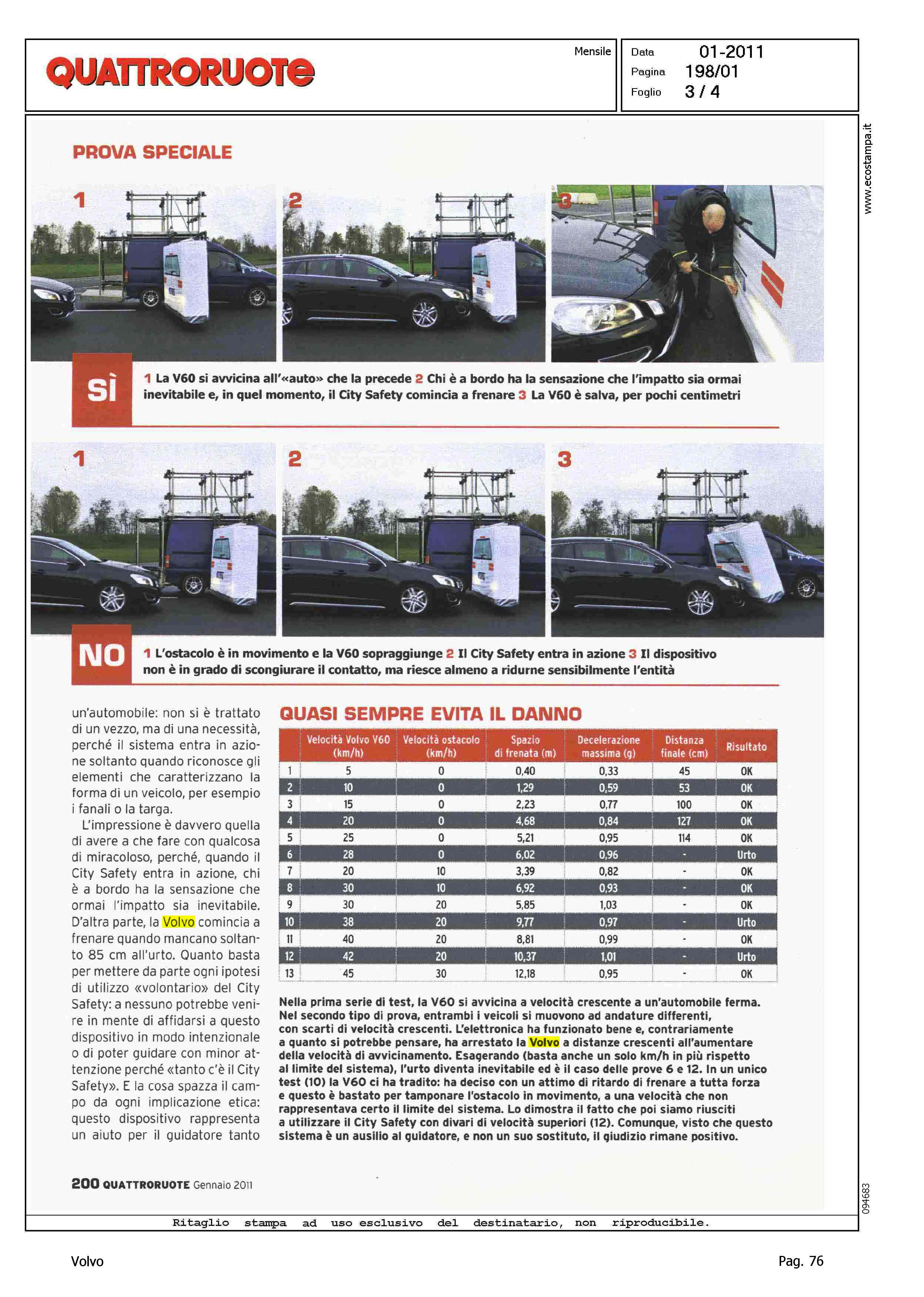 Highlight: (USCITA GENNAIO 2011) - CITY SAFETY - OCCHIELLO: ''L'ELETTRONICA CHE FRENA DA SOLA E' UN NUOVO E VALIDO AUSILIO. MA ATTENZIONE A NON SCAMBIARLA PER UN AUTOPILOTA - PROVA SPECIALE - TEST CITY SAFETY CON VETTURA FERMA ED IN MOVIMENTO - SI SEGNALA: 'SFIDA ALL'ULTIMO METRO (PAGINA 1/2 DEL SERVIZIO) ''L'IMPRESSIONE E' DAVVERO QUELLA DI AVERE A CHE FARE CON QUALCOSA DI MIRACOLOSO...'' - TABELLE DEI RILEVAMENTI - DESCRIZIONE DEL FUNZIONAMENTO DEL DISPOSITIVO - BOX, DRIVER ALERT CONTROL