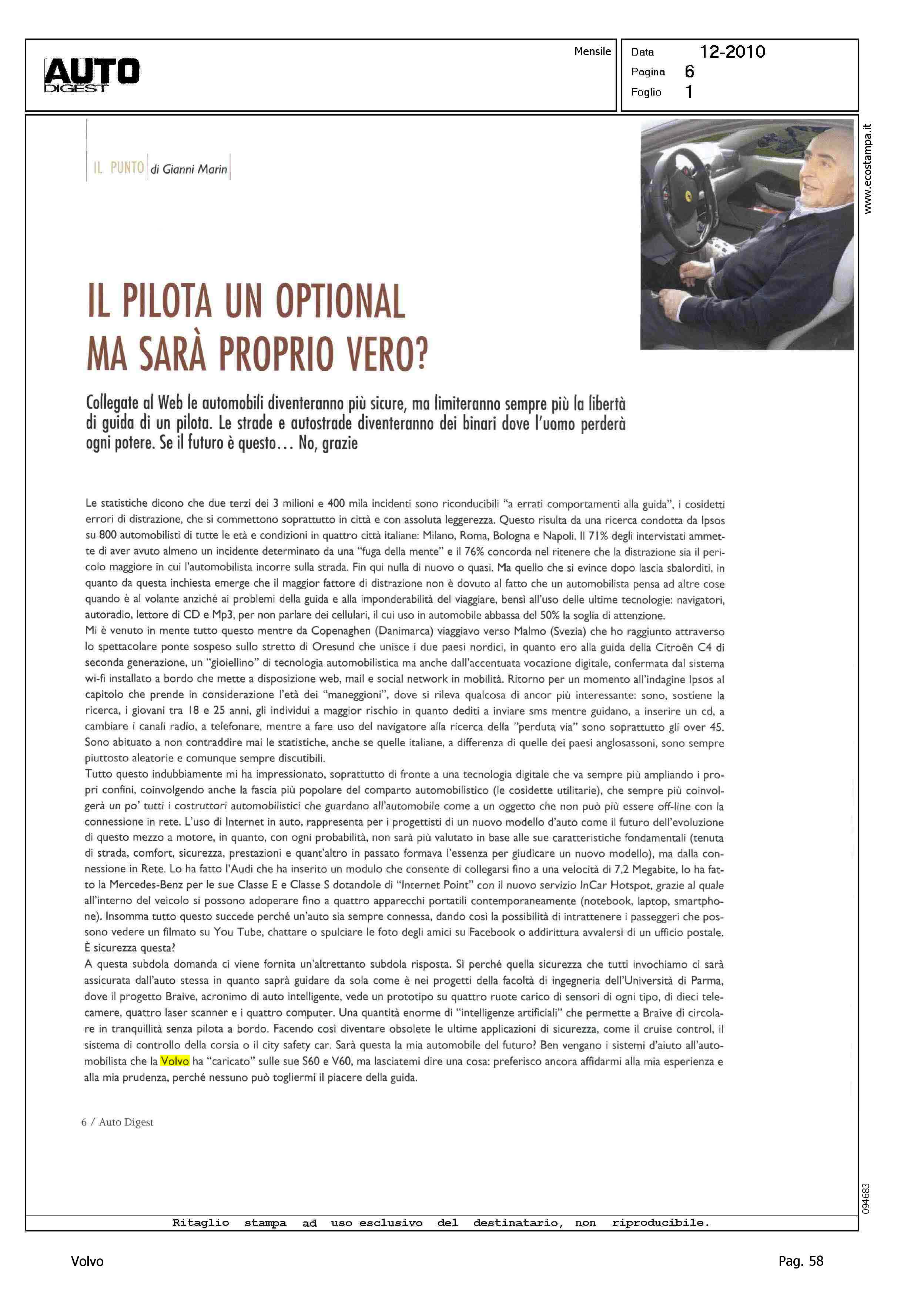 Author: MARIN, GIANNILine: Corporate Model: Corporate Subject: - Title: IL PILOTA UN OPTIONAL MA SARA' PROPRIO VERO?Highlight: VOLVO S60 - VOLVO V60 - SICUREZZA - PEDESTRIAN DETECTION