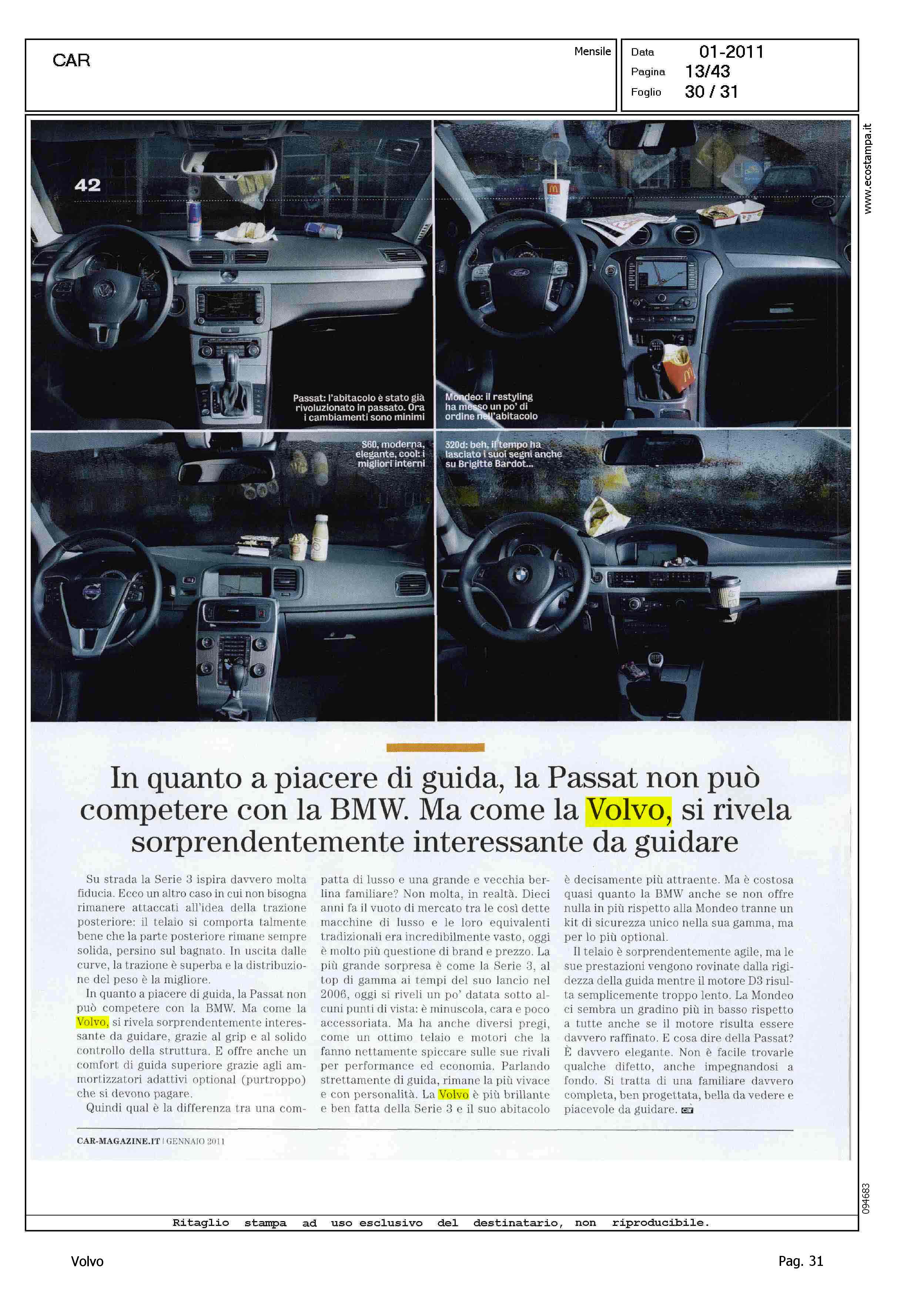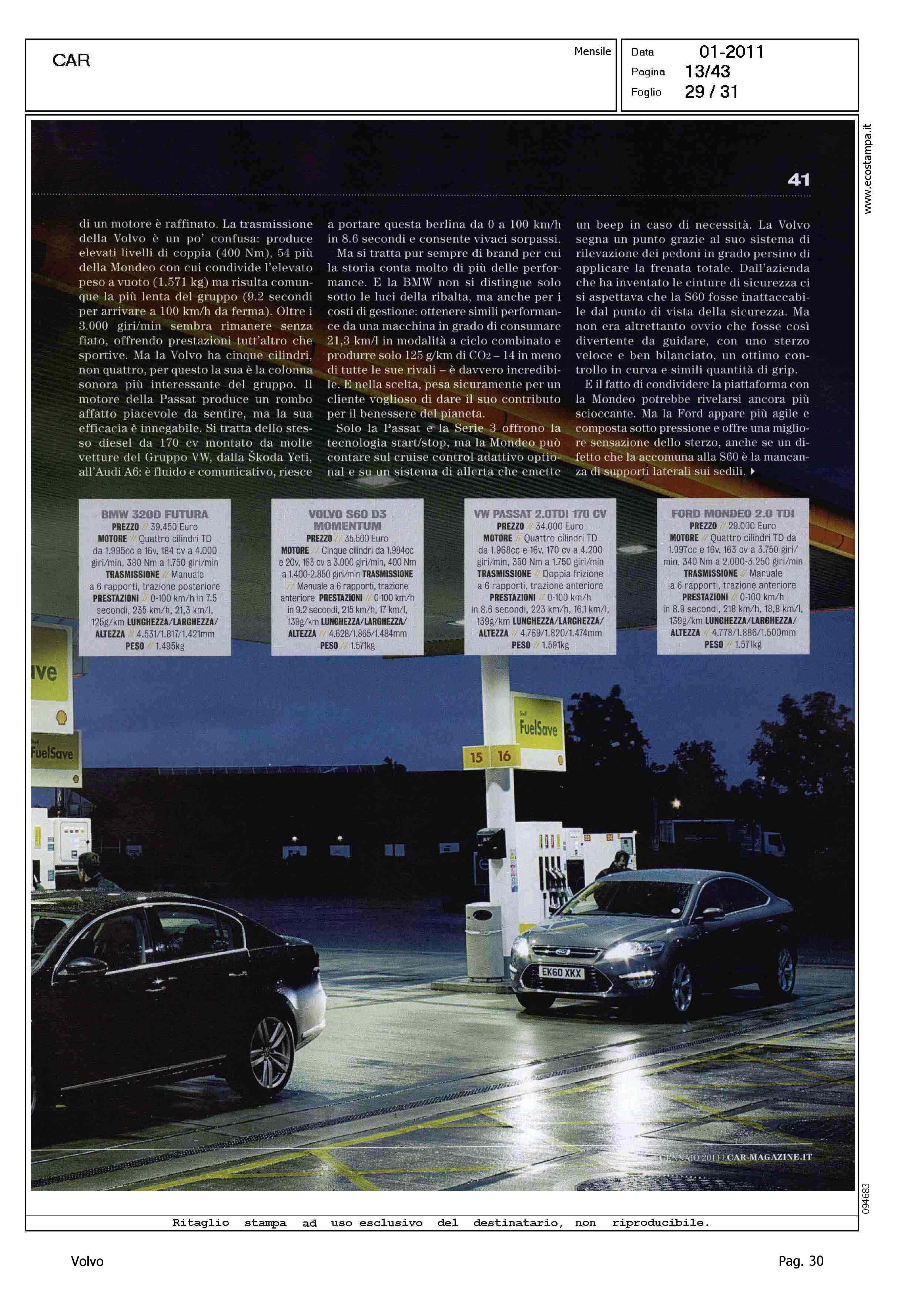 Highlight: VOLVO S60 - COMPETITOR - TEST DRIVE - PROVA COMPARATA - VOLKSWAGEN PASSAT, FORD MONDEO, BMW SERIE 3 - ABITACOLO - INTERNI, "SUPERCOOL. ELEGANTI, RILASSANTI ED INCREDIBILMENTE SEMPLICI, UN PO' COME QUELLE CASE DI DESIGN CHE SI VEDONO IN TV IN CUI ABITANO PERSONE ELEGANTI E SOBRIE... ASSOLUTAMENTE INCONFONDIBILE" - MOTORE - TRASMISSIONE - PRESTAZIONI - SICUREZZA - PEDESTRIAN DETECTION - VALORE SICUREZZA VOLVO - SCHEDA TECNICA, PRINCIPALI DATI - IMPRESSIONI DI GUIDA, DINAMICA DI MARCIA, "IN QUANTO A PIACERE DI GUIDA, LA PASSAT NON PUO' COMPETERE CON LA BMW. MA COME LA VOLVO, SI RIVELA SORPRENDENTEMENTE INTERESSANTE DA GUIDARE" - "...LA VOLVO E' PIU' BRILLANTE E BEN FATTA DELLA SERIE 3 ED IL SUO ABITACOLO E' DECISAMENTE PIU' ATTRAENTE..." - TELAIO - ASSETTO RIGIDO - MOTORE D3 "SEMPLICEMENTE LENTO..."