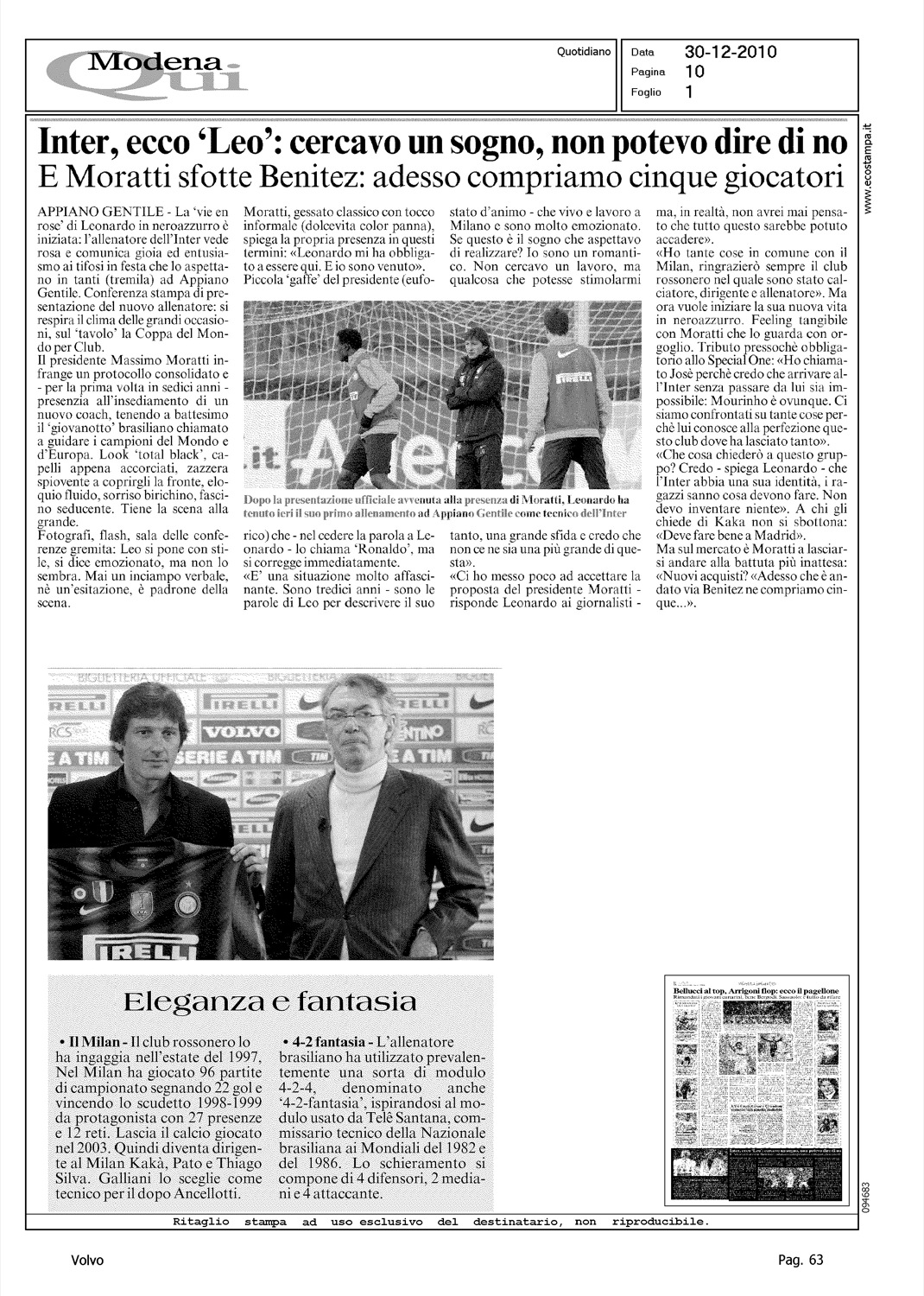 Author: Line: Corporate Model: Corporate Subject: - Title: INTER, ECCO 'LEO': CERCAVO UN SOGNO, NON POTEVO DIRE DI NOHighlight: INSEDIAMENTO LEONARDO - INTER F.C. - VOLVO