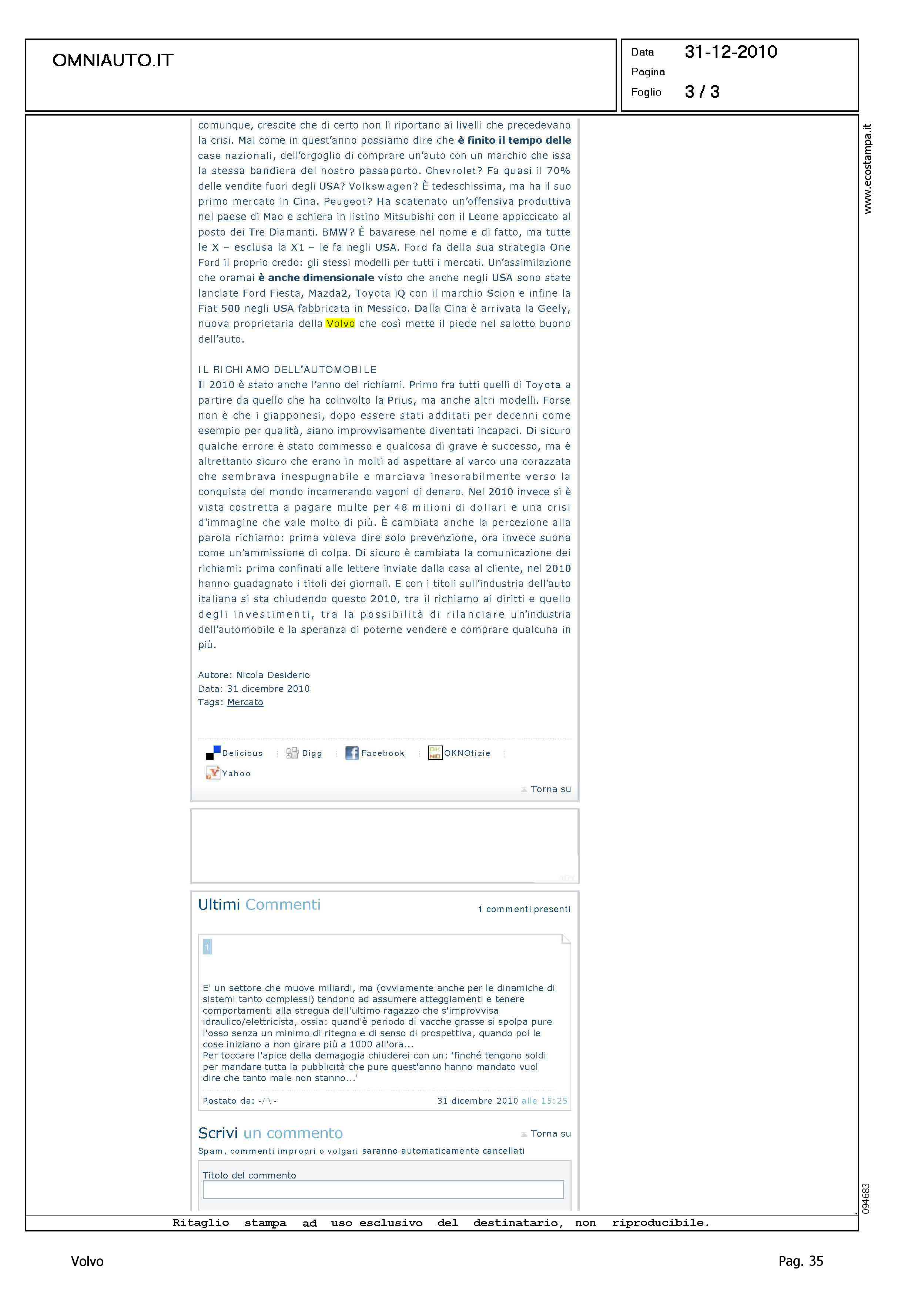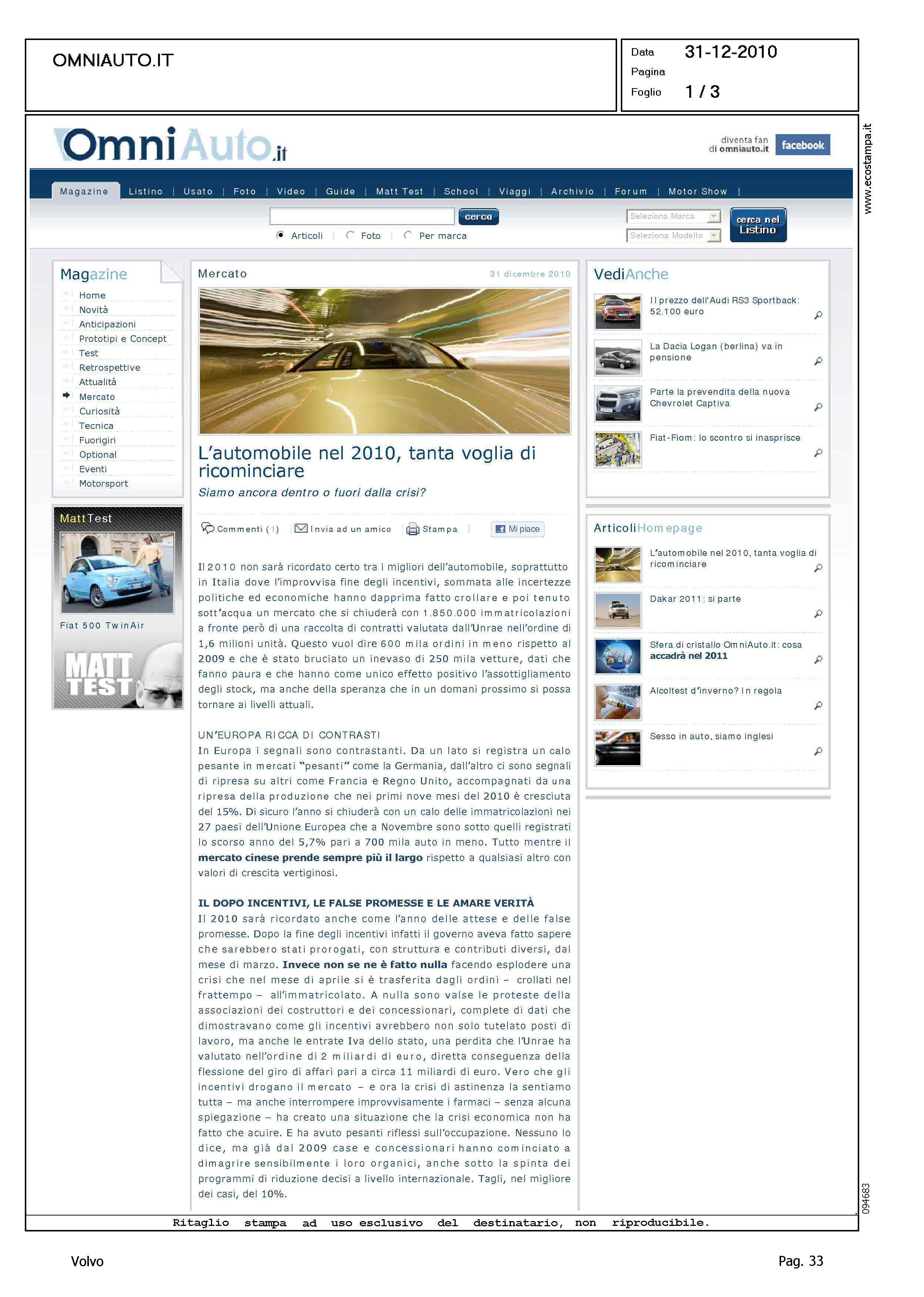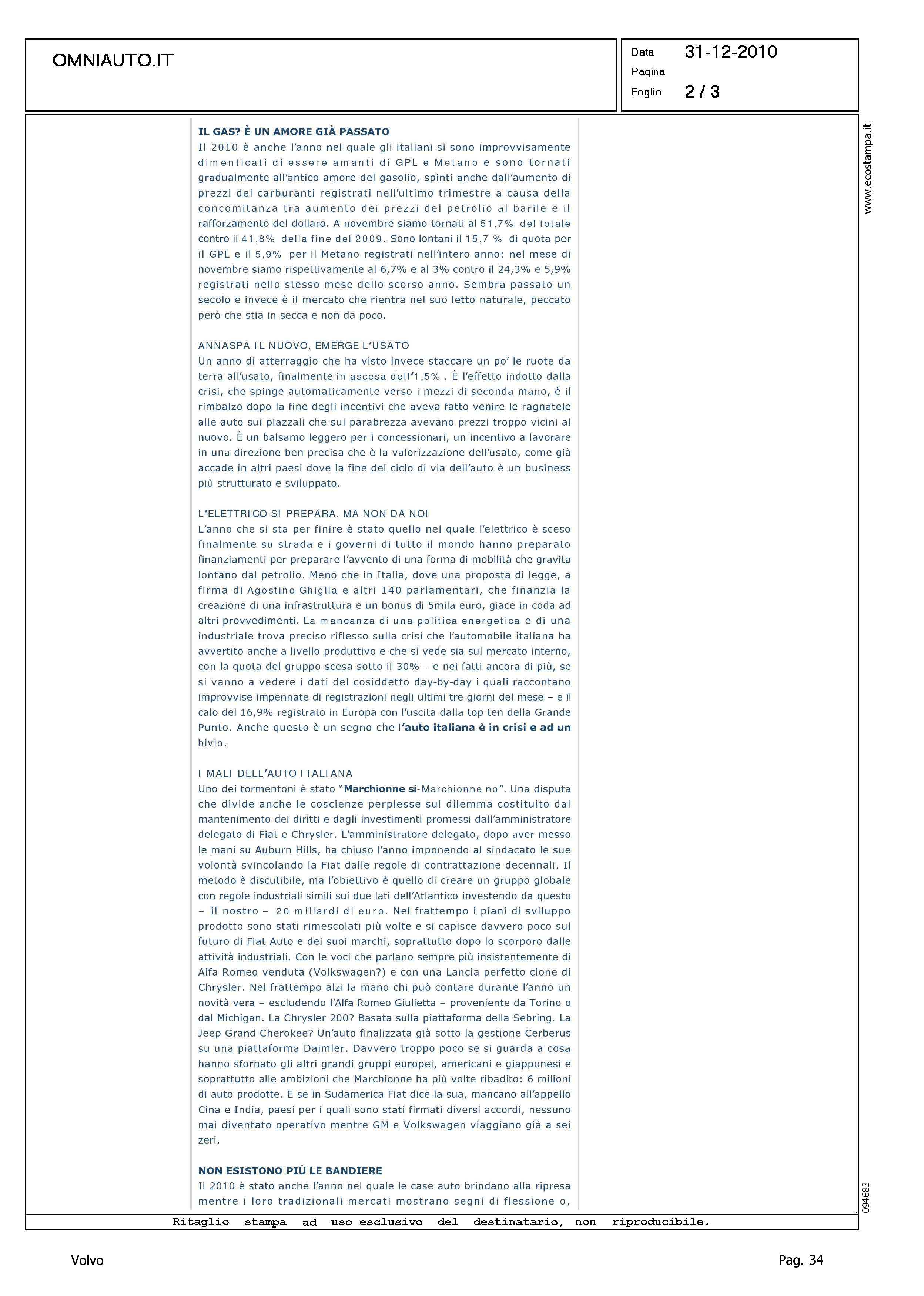 Author: Line: Corporate Model: Corporate Subject: - Title: L'AUTOMOBILE NEL 2010, TANTA VOGLIA DI RICOMINCIAREHighlight: VOLVO - GEELY