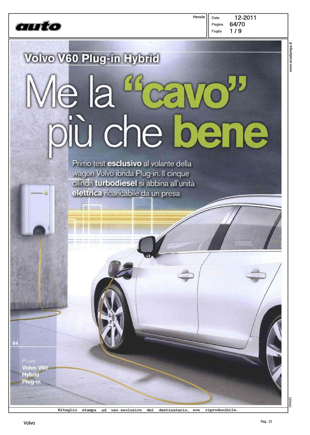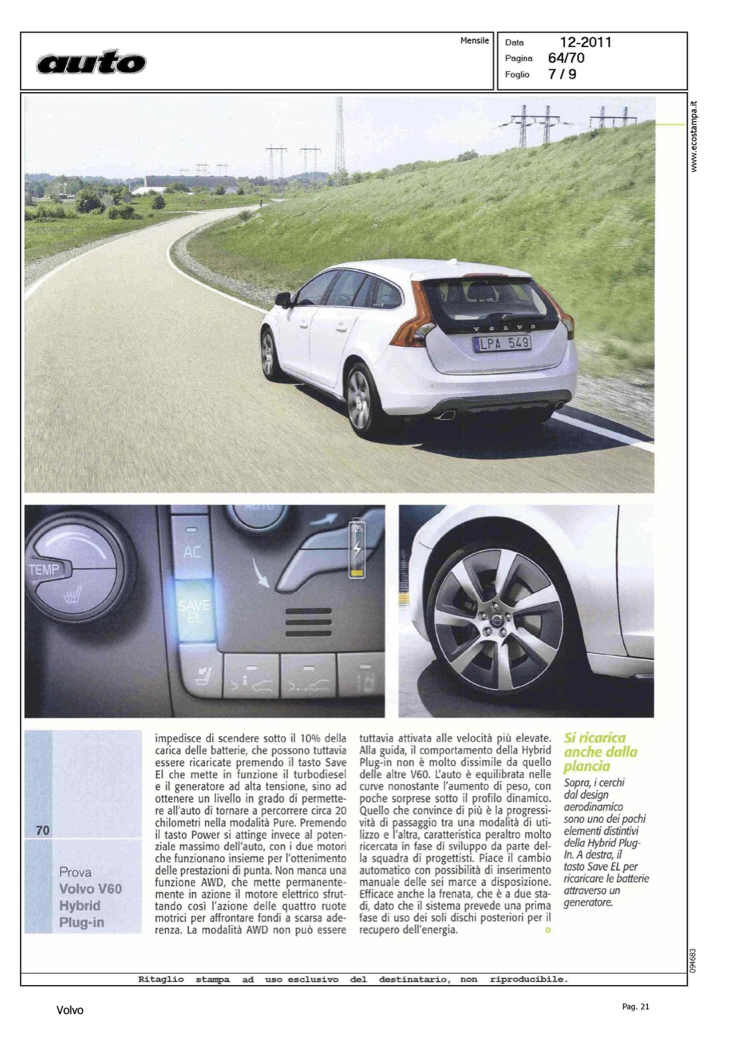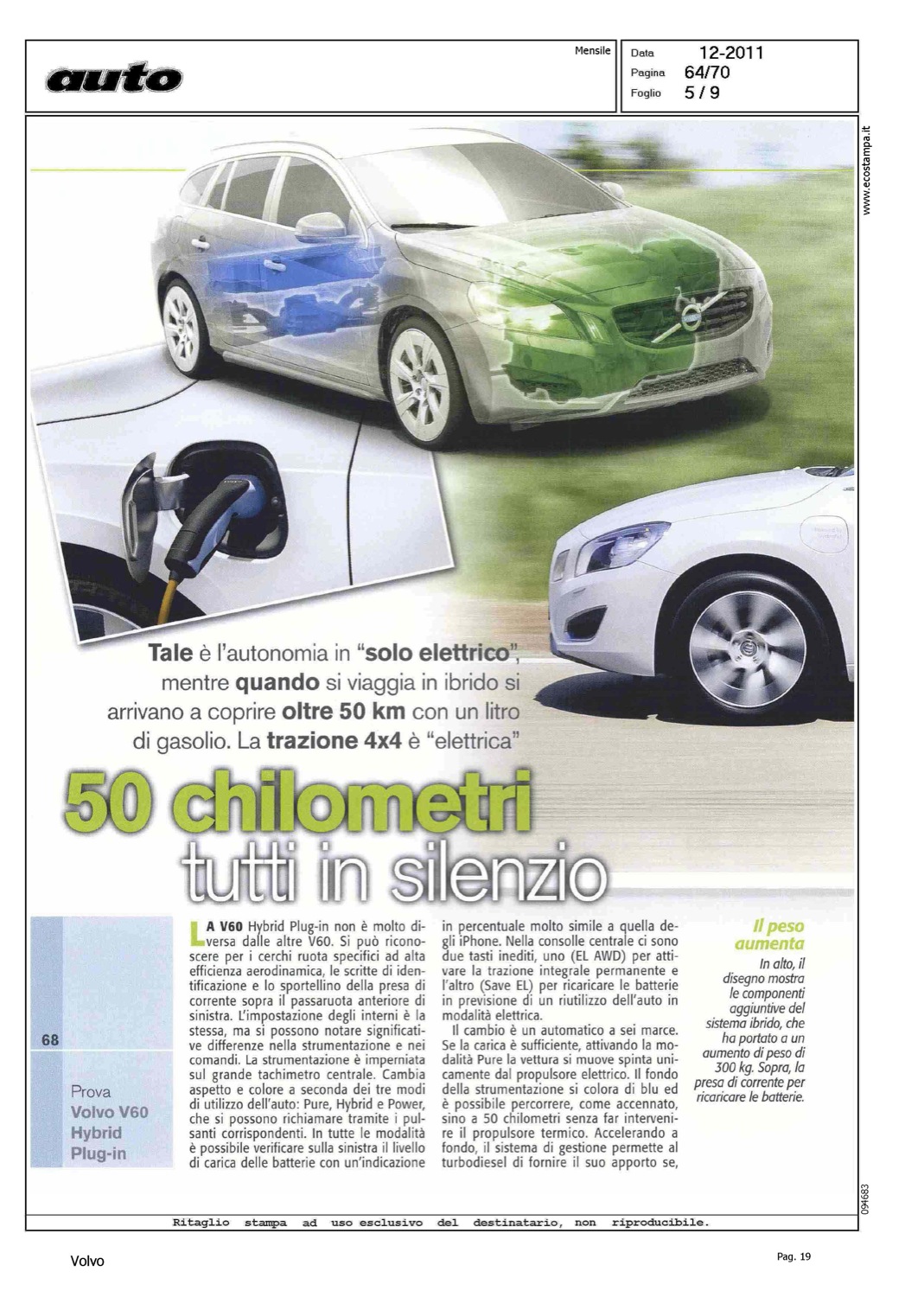 Highlight: (USCITA DICEMBRE) - VOLVO V60 PLUG-IN HYBRID - TEST DRIVE, IMPRESSIONI DI GUIDA - NO RILEVAMENTI AUTONOMI - DESCRIZIONE DEL PROGETTO - PRINCIPI DI FUNZIONAMENTO DELLO SCHEMA MOTORI - GRUPPO BATTERIE - PRESTAZIONI - AUTONOMIA - TEMPI DI RICARICA - COMMERCIALIZZAZIONE - FUNZIONI SPECIFICHE DEL MODELLO - MODALITA' DI MARCIA - SICUREZZA - BAGAGLIAIO - IPOTESI DI PREZZO - PEZZO 'B', TITOLO: '50 CHILOMETRI TUTTI IN SILENZIO' - DESIGN - RICONOSCIBILITA' VERSIONE - STRUMENTAZIONE - MODALITA' DI MARCIA - CAMBIO, AUTOMATICO, SEI MARCE - AUTONOMIA - DINAMICA DI MARCIA - SICUREZZA - EMISSIONI - TRAZIONE - '...ALLA GUIDA, IL COMPORTAMENTO DELLA HYBRID PLUG-IN NON E' MOLTO DISSIMILE DA QUELLO DELLE ALTRE V60. L'AUTO E' EQUILIBRATA NELLE CURVE NONOSTANTE L'AUMENTO DI PESO, CON POCHE SORPRESE SOTTO IL PROFILO DINAMICO...' - '...QUELLO CHE CONVINCE DI PIU' E' LA PROGRESSIVITA' DI PASSAGGIO TRA UNA MODALITA' DI UTILIZZO E L'ALTRA, CARATTERISTICA PERALTRO MOLTO RICERCATA IN FASE DI SVILUPPO DA PARTE DELLA SQUADRA DI PROGETTISTI...'