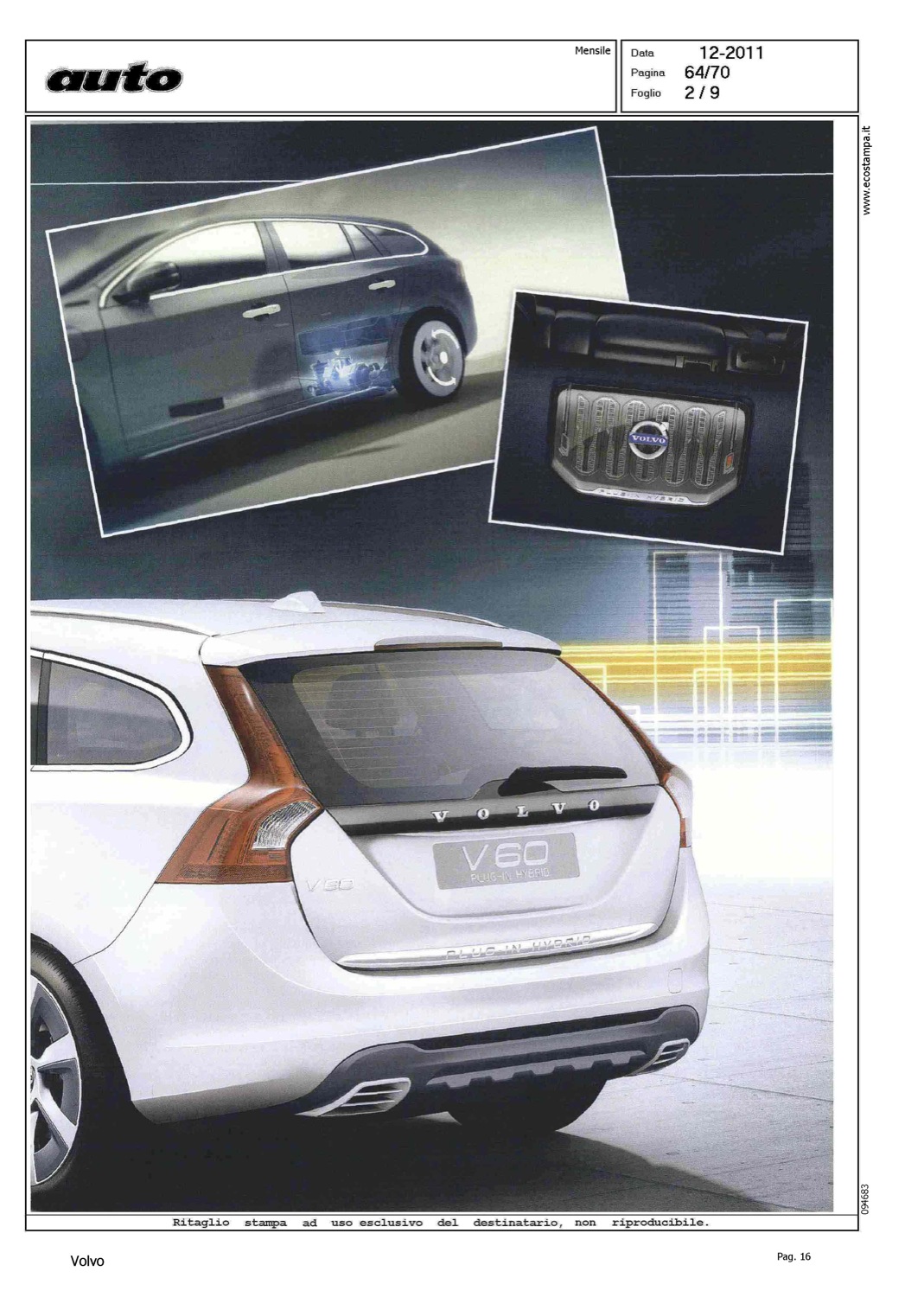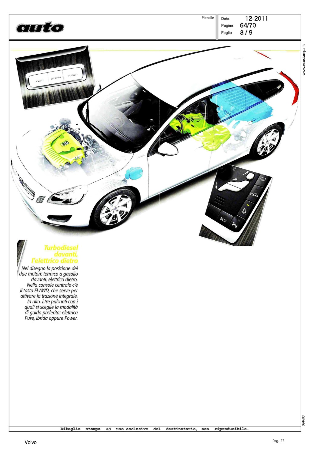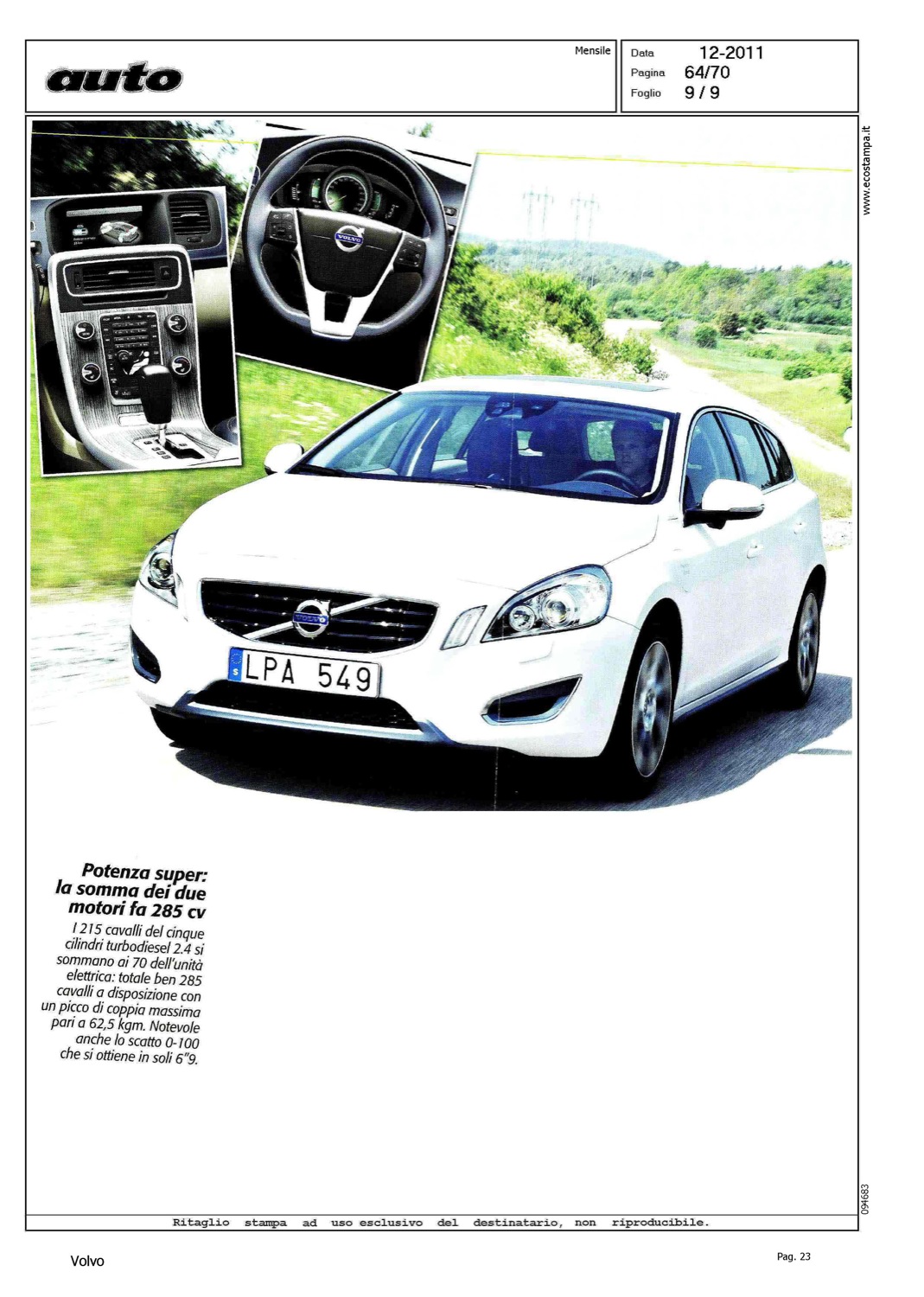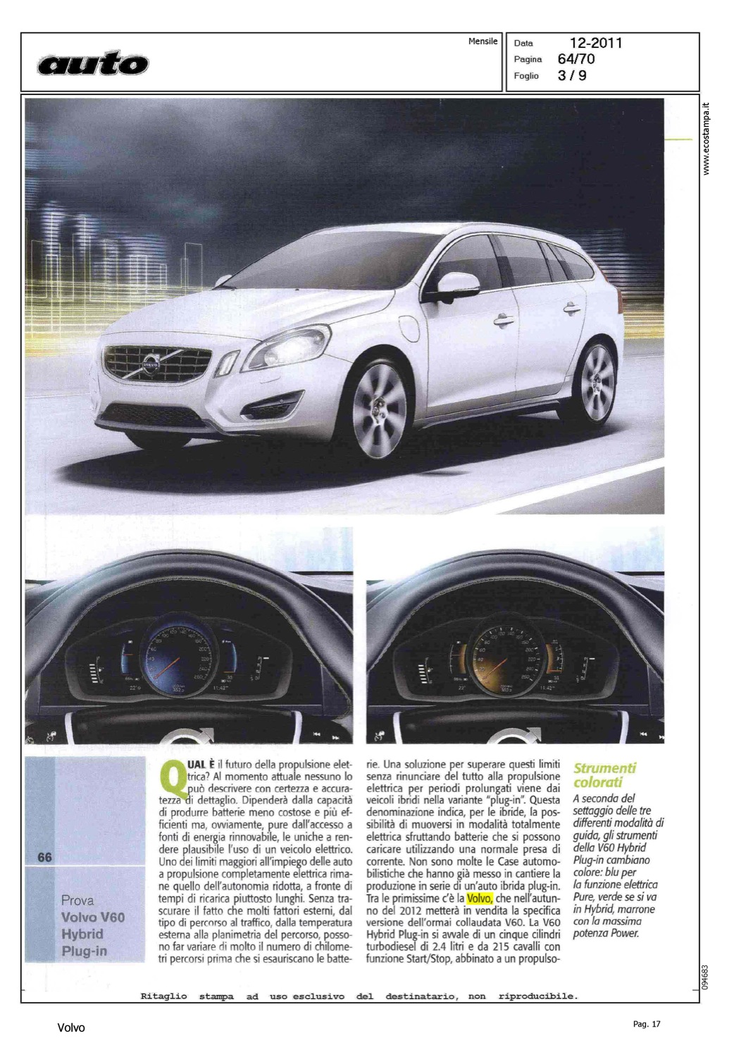 Highlight: (USCITA DICEMBRE) - VOLVO V60 PLUG-IN HYBRID - TEST DRIVE, IMPRESSIONI DI GUIDA - NO RILEVAMENTI AUTONOMI - DESCRIZIONE DEL PROGETTO - PRINCIPI DI FUNZIONAMENTO DELLO SCHEMA MOTORI - GRUPPO BATTERIE - PRESTAZIONI - AUTONOMIA - TEMPI DI RICARICA - COMMERCIALIZZAZIONE - FUNZIONI SPECIFICHE DEL MODELLO - MODALITA' DI MARCIA - SICUREZZA - BAGAGLIAIO - IPOTESI DI PREZZO - PEZZO 'B', TITOLO: '50 CHILOMETRI TUTTI IN SILENZIO' - DESIGN - RICONOSCIBILITA' VERSIONE - STRUMENTAZIONE - MODALITA' DI MARCIA - CAMBIO, AUTOMATICO, SEI MARCE - AUTONOMIA - DINAMICA DI MARCIA - SICUREZZA - EMISSIONI - TRAZIONE - '...ALLA GUIDA, IL COMPORTAMENTO DELLA HYBRID PLUG-IN NON E' MOLTO DISSIMILE DA QUELLO DELLE ALTRE V60. L'AUTO E' EQUILIBRATA NELLE CURVE NONOSTANTE L'AUMENTO DI PESO, CON POCHE SORPRESE SOTTO IL PROFILO DINAMICO...' - '...QUELLO CHE CONVINCE DI PIU' E' LA PROGRESSIVITA' DI PASSAGGIO TRA UNA MODALITA' DI UTILIZZO E L'ALTRA, CARATTERISTICA PERALTRO MOLTO RICERCATA IN FASE DI SVILUPPO DA PARTE DELLA SQUADRA DI PROGETTISTI...'